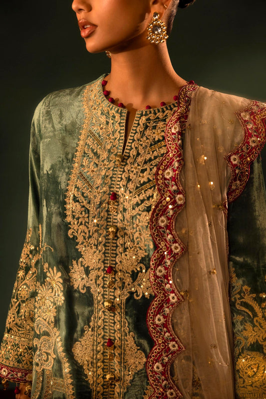 STITCHED GREEN EMBROIDERED SHIRT + GHARARA + DUPATTA | Sana Safinaz