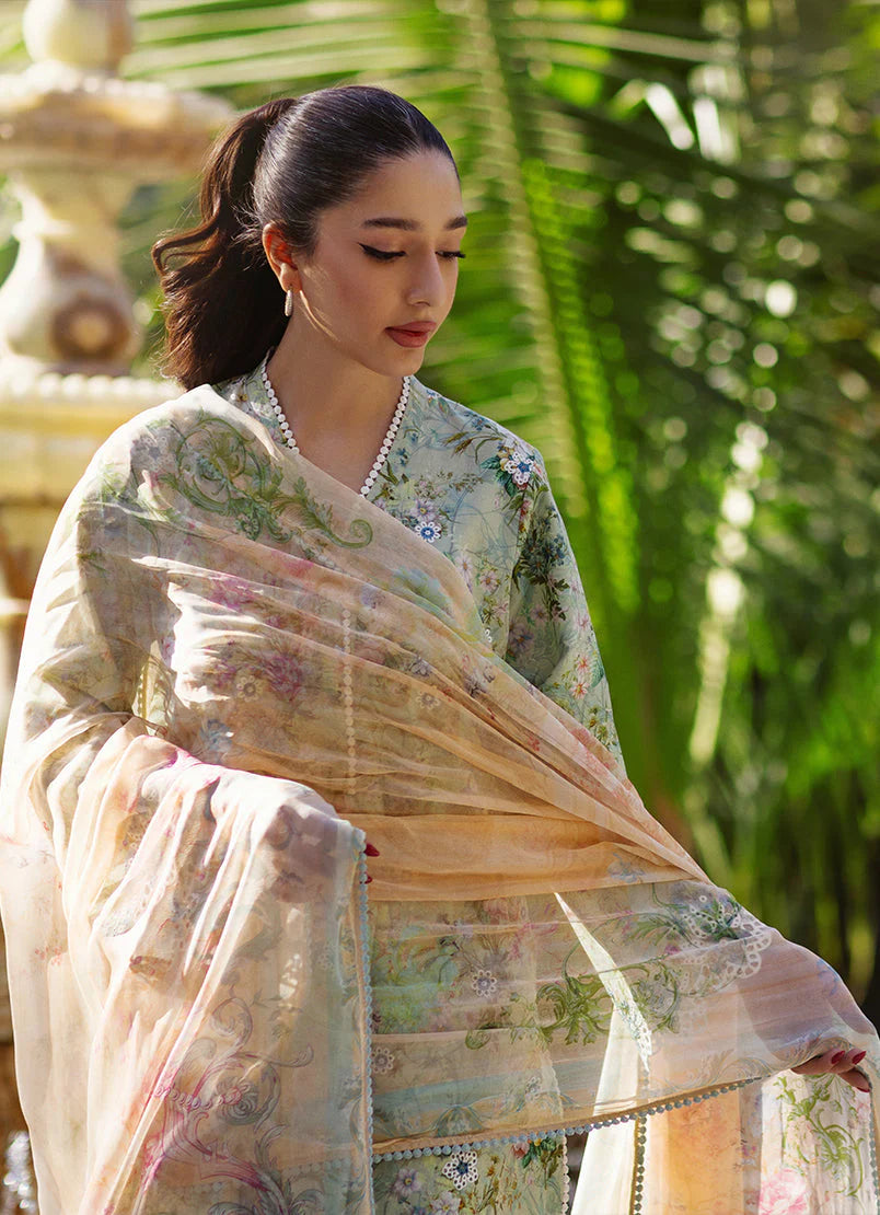 The Olive Green Cotton Chiffon Embroidered Printed 3pc Suit from Summer Essence '25, features V neckline & full-length sleeves paired with embroidered trousers & chiffon dupatta.