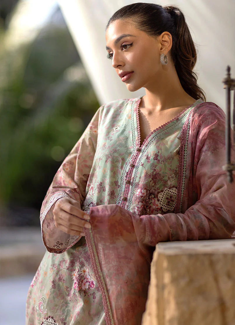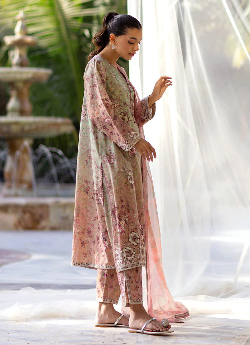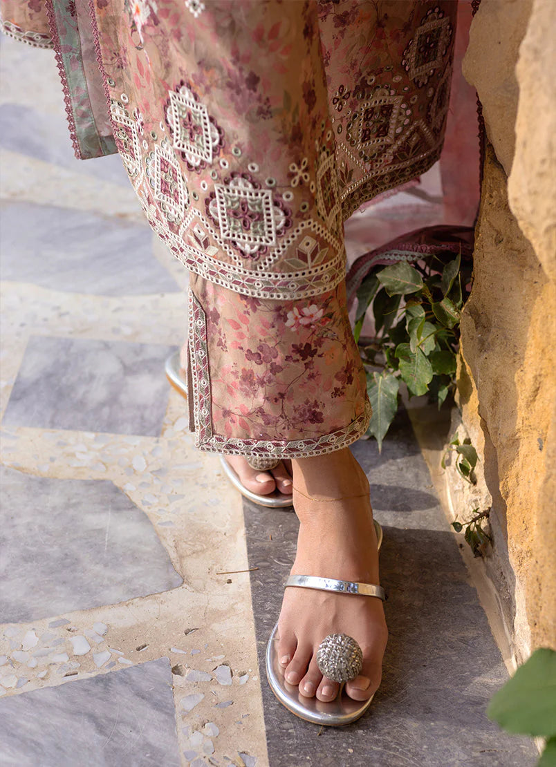 The Mauve Cotton Chiffon Embroidered Printed 3pc Suit from Summer Essence '25, features V neckline & full-length sleeves paired with embroidered trousers & chiffon dupatta.