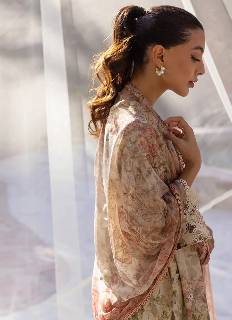 The Beige Cotton Chiffon Embroidered Printed 3pc Suit from Summer Essence '25, features V neckline & full-length sleeves paired with embroidered trousers & chiffon dupatta.