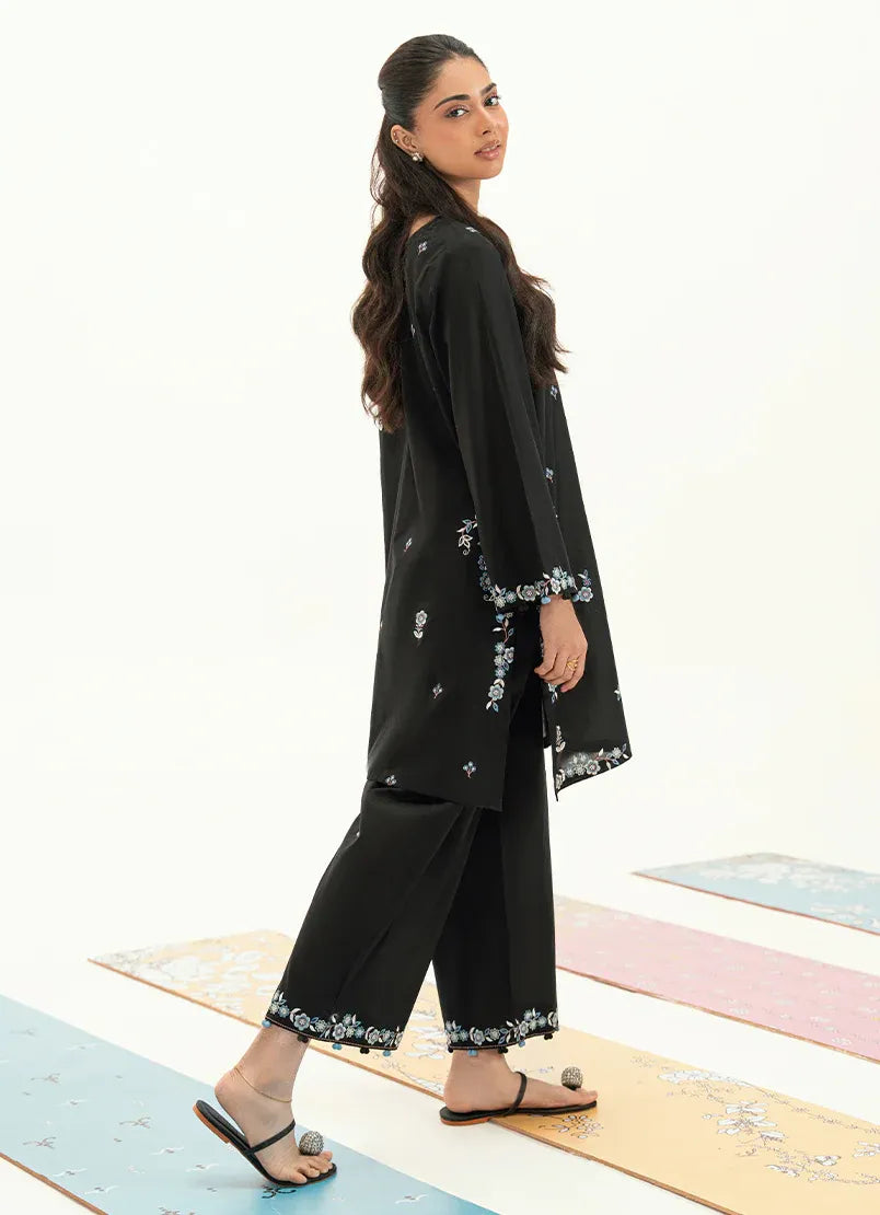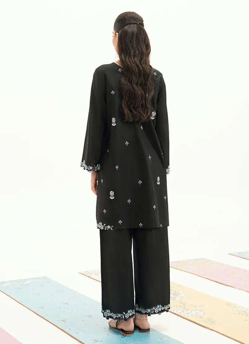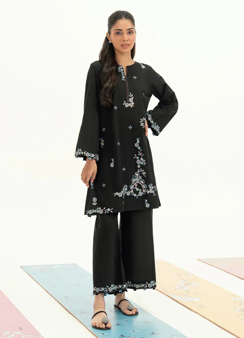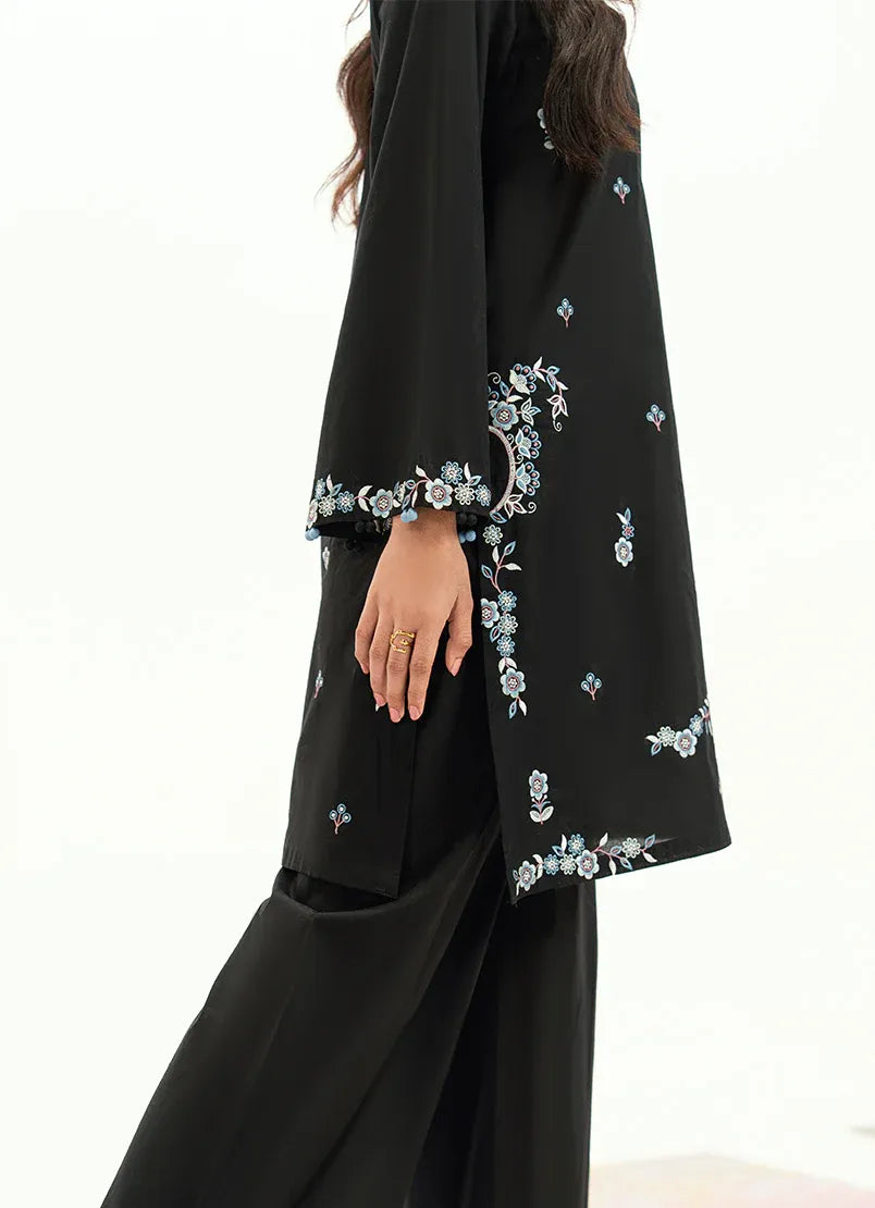 This black embroidered co-ord set is crafted from breathable cotton, offering a clean, relaxed silhouette with everyday comfort. The kurta features delicate embroidery placed along the front and lower portion, creating a subtle statement against the dark base. The sleeves are finished with fine embroidered detailing, while the matching trousers keep the look balanced and refined, making it ideal for effortless daywear with a signature touch.