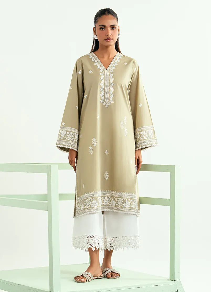 Crafted in breathable cotton, this olive green Spring Pret kurta features a relaxed yet refined silhouette designed for effortless everyday wear. Intricate embroidery frames the neckline and is complemented by subtle scattered motifs across the front, creating soft visual texture. Finely detailed borders along the sleeves and hem add depth while maintaining a clean, balanced look. Light, comfortable, and timeless, this kurta is ideal for daytime styling and understated seasonal elegance.