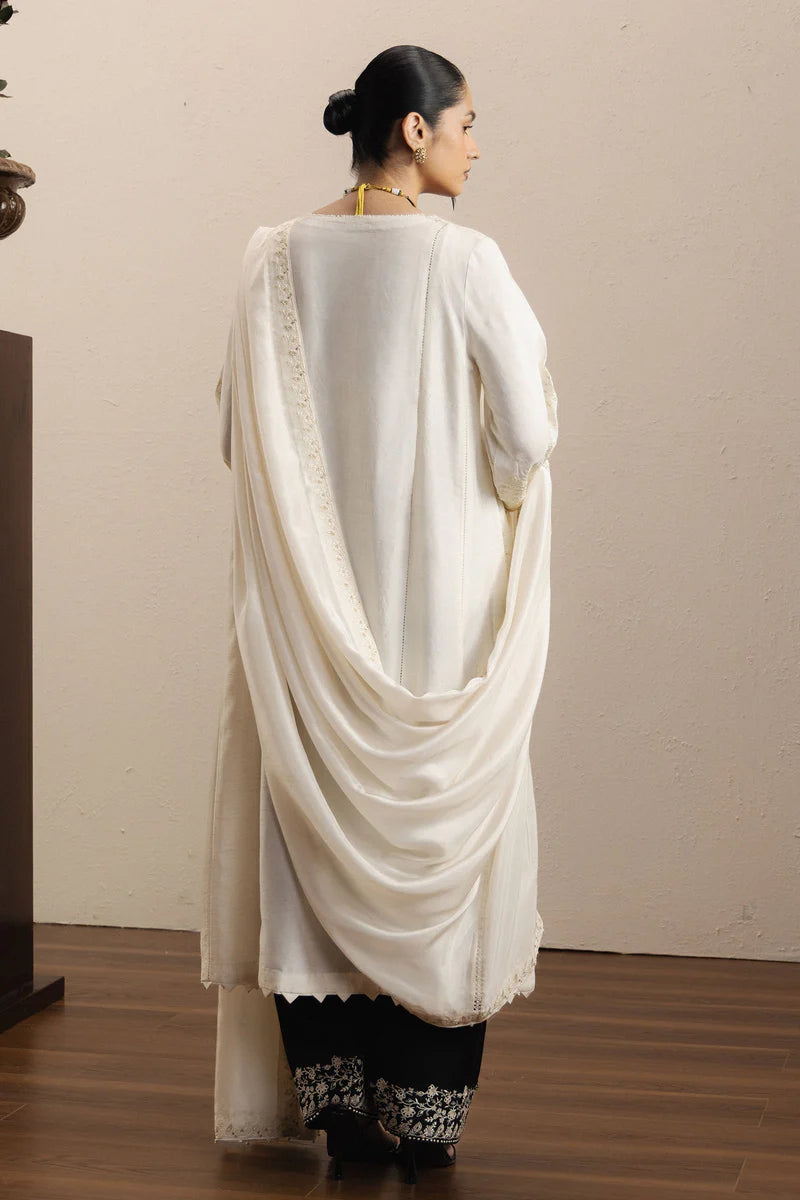 Complementing the shirt is a black embroidered shalwar, creating a striking contrast that adds character and sophistication to the ensemble. The look is completed with an aari embroidered organza dupatta, finished with delicate detailing that brings lightness and movement to the overall composition.