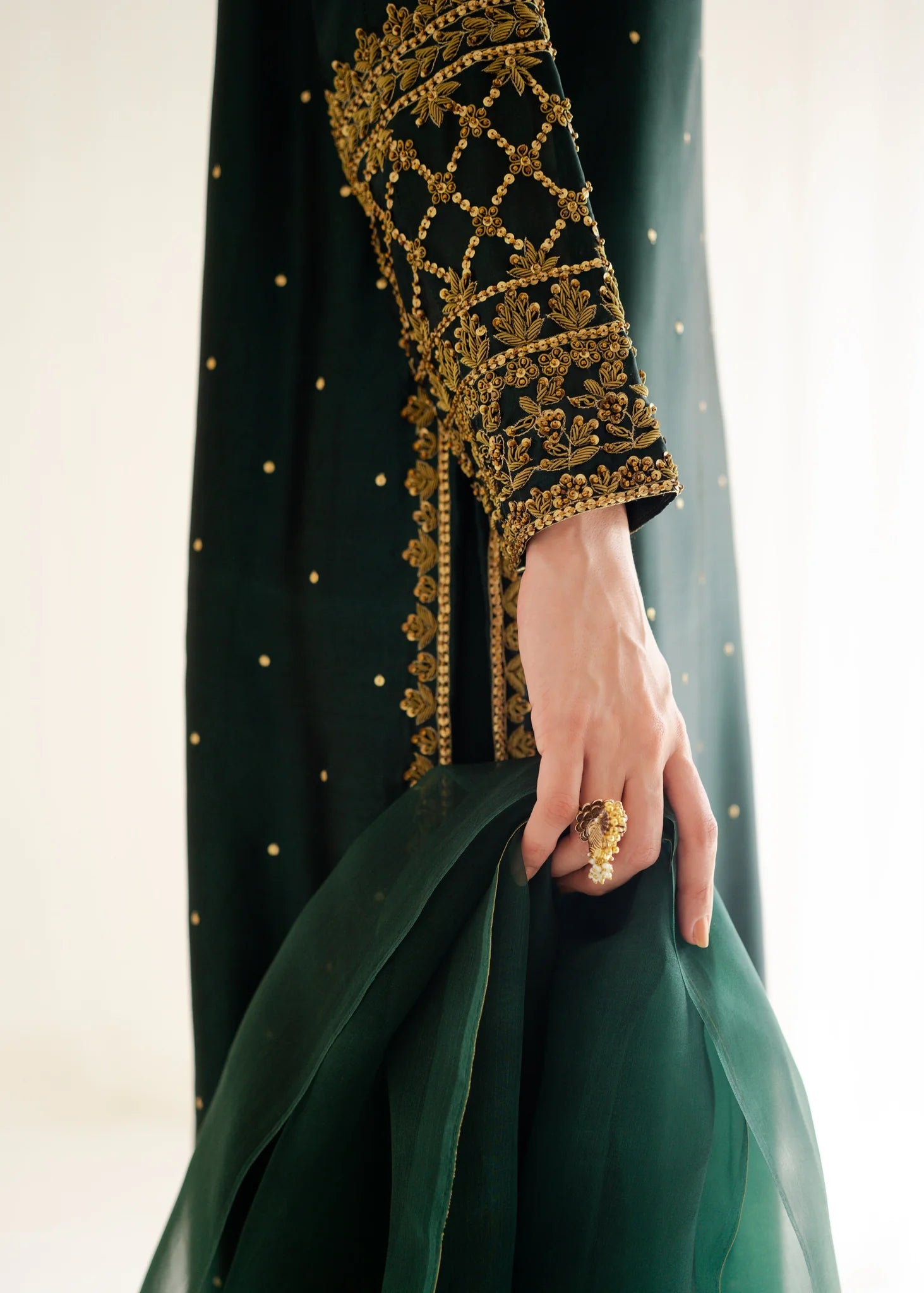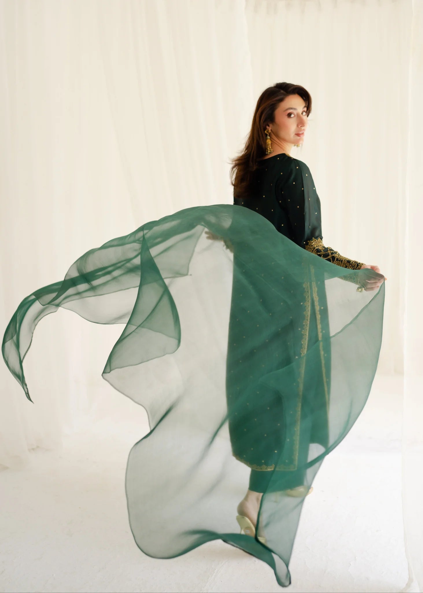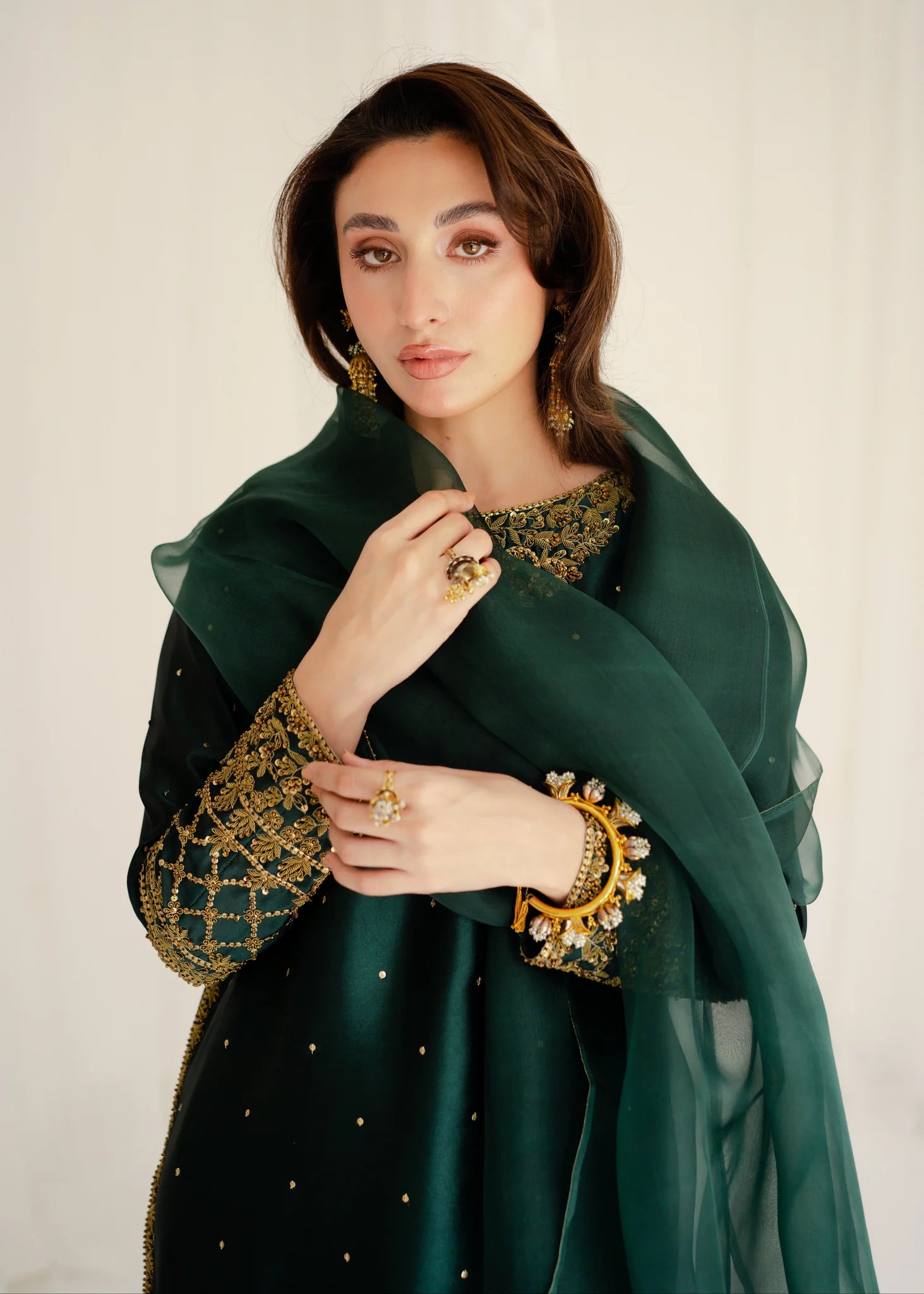 A pure mint tissue pishwas paired with matching tissue trousers, both fully lined for comfort and structure. The outfit features delicate dull gold embroidery with soft peach silk thread detailing along the neckline, sleeves, and dupatta borders. The short elbow-length sleeves and fluid drape of the fabric bring an old-world grace to this dreamy, timeless silhouette.