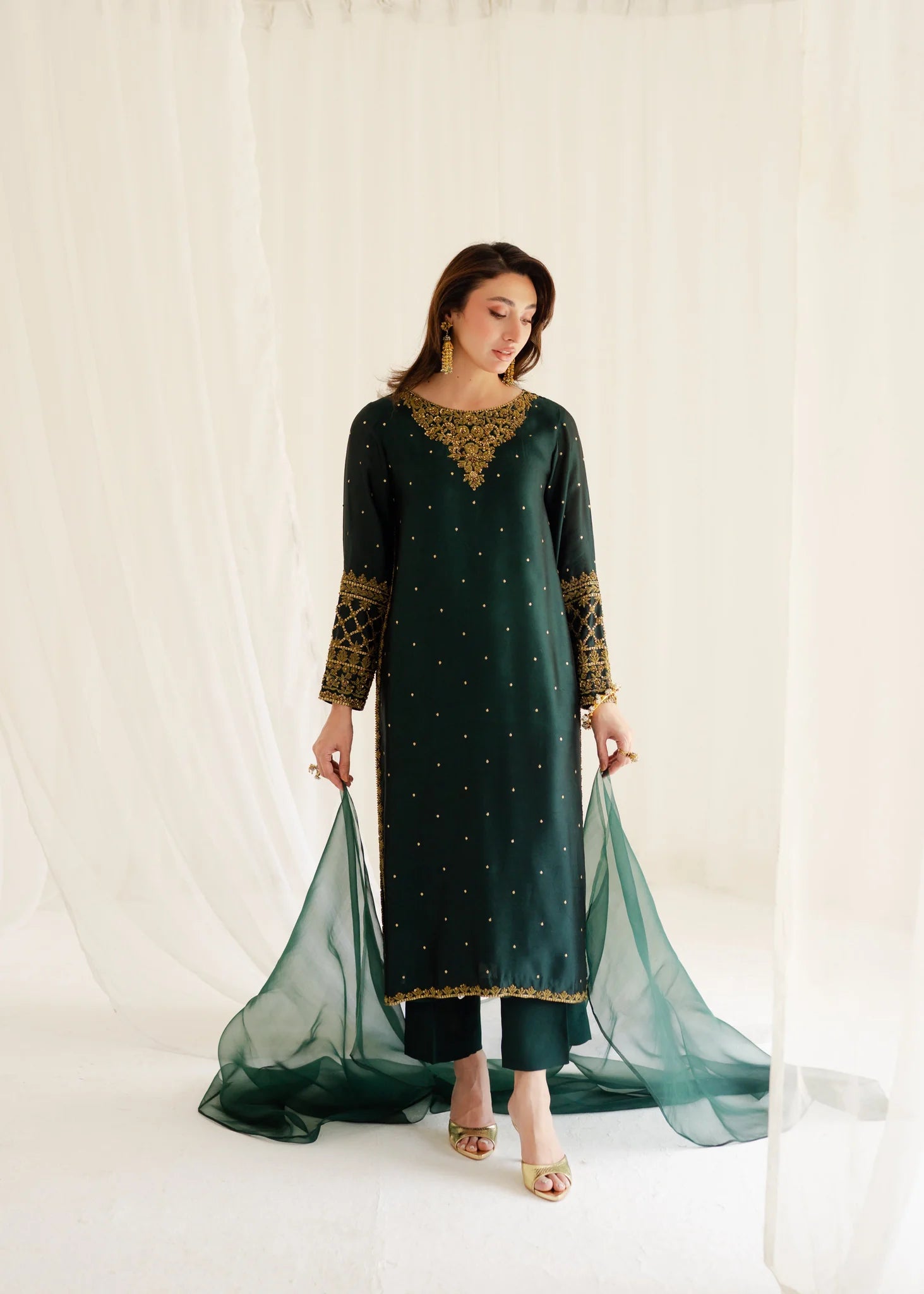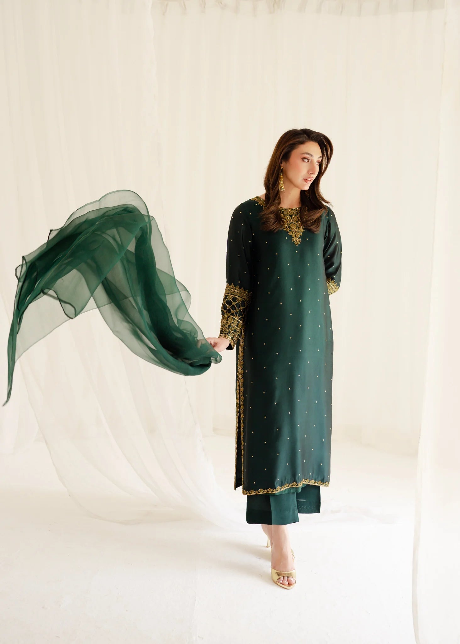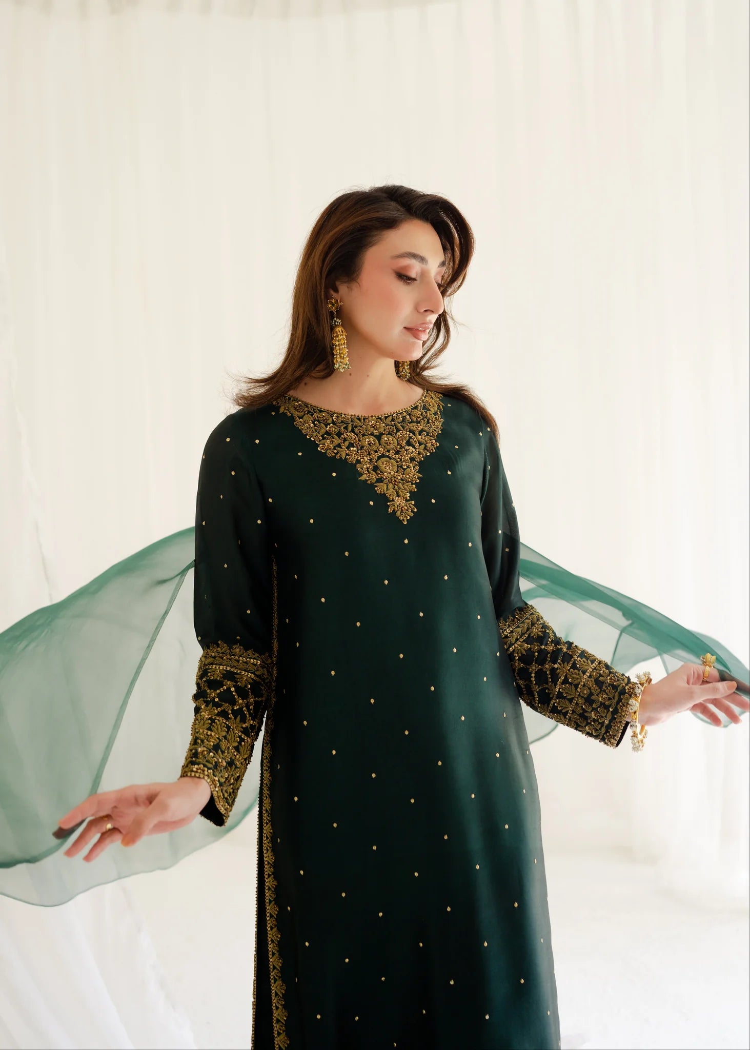 A pure mint tissue pishwas paired with matching tissue trousers, both fully lined for comfort and structure. The outfit features delicate dull gold embroidery with soft peach silk thread detailing along the neckline, sleeves, and dupatta borders. The short elbow-length sleeves and fluid drape of the fabric bring an old-world grace to this dreamy, timeless silhouette.