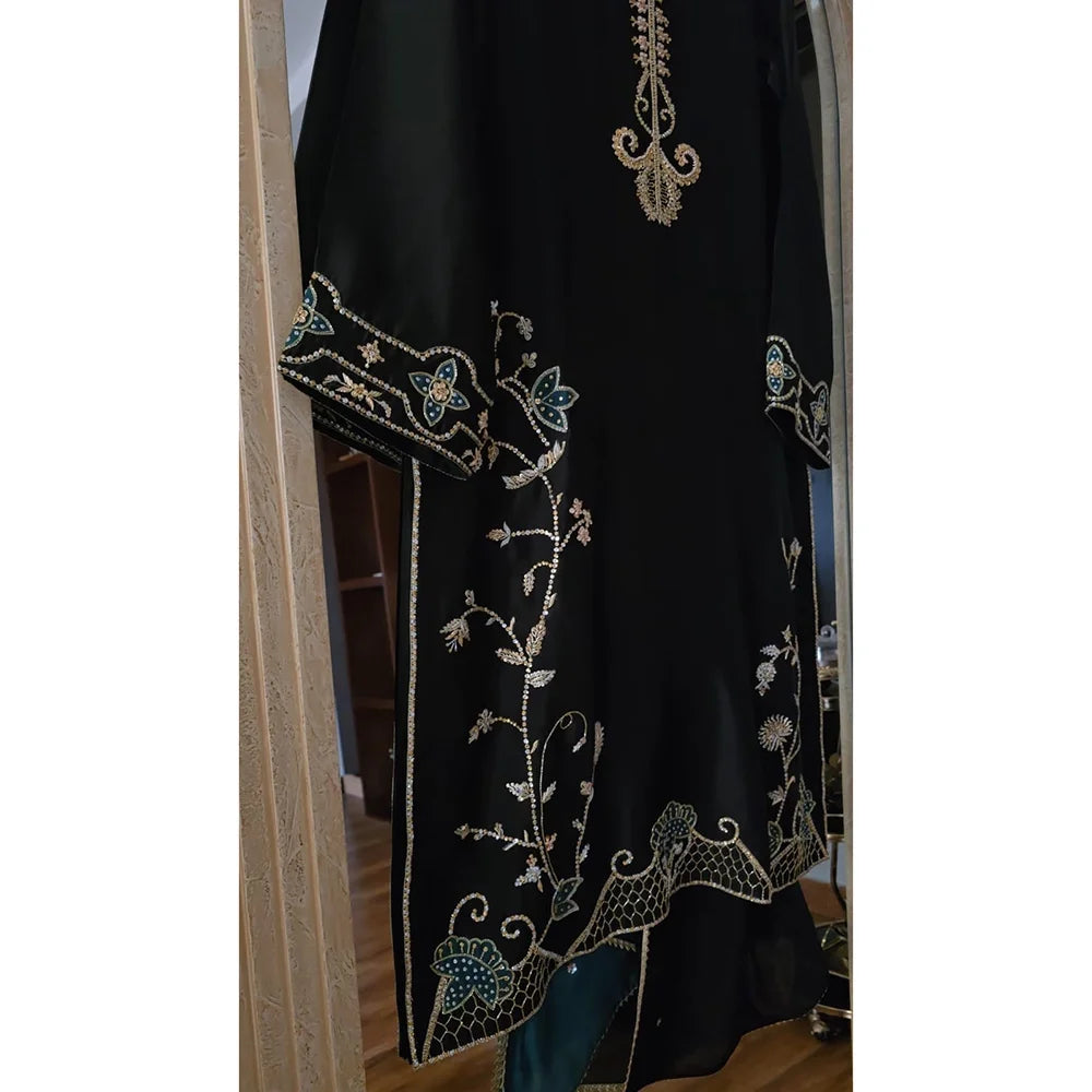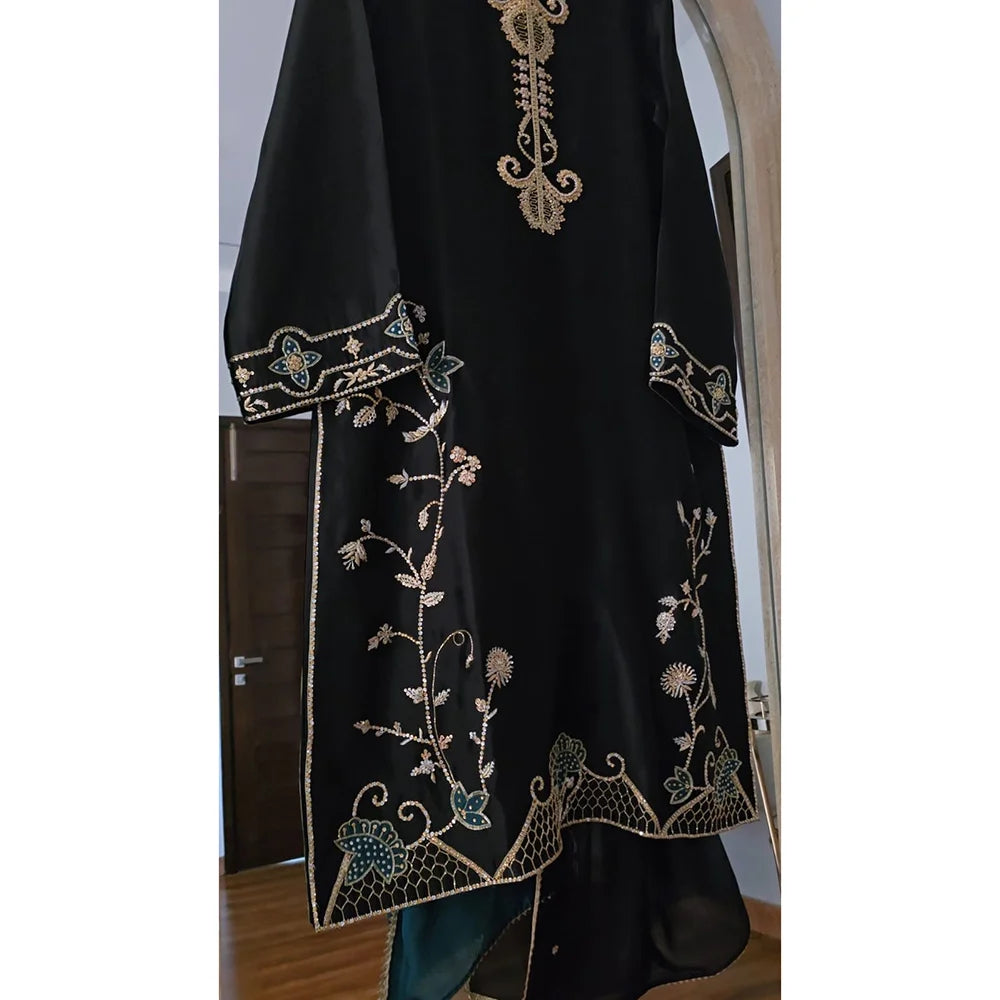 Black Kurta cut from Pure Shisha Silk with elaborately intricate handwork neckline . The daman is beautifully handworked with aplique and jaal work all over neckline , sleeves are beautifully hand embroidered using kora, dabka, swarovskis , pearls , silk thread work , aplique and tilla.