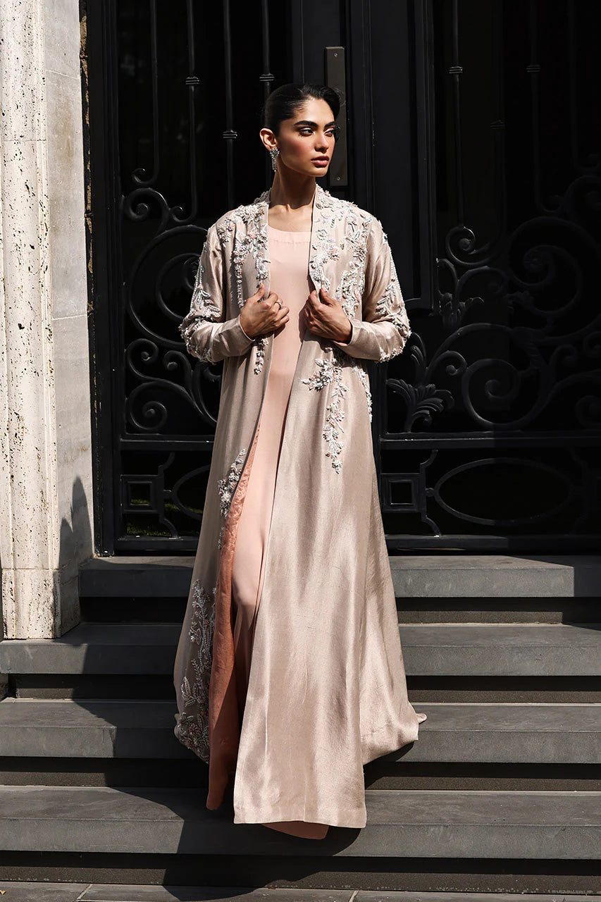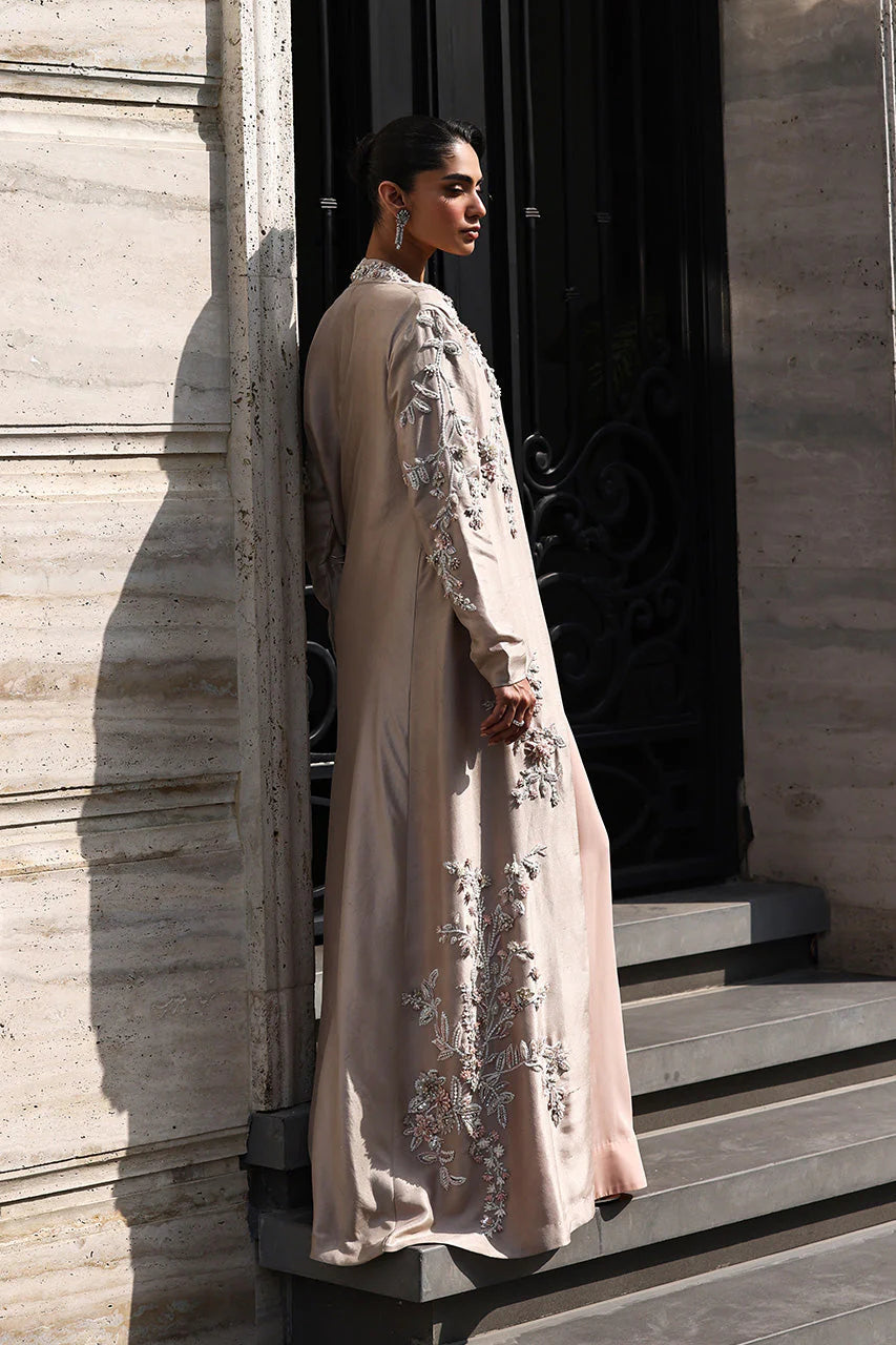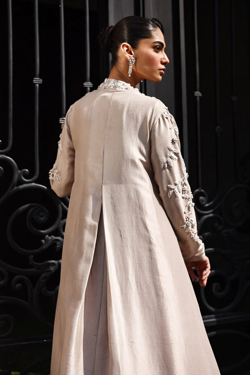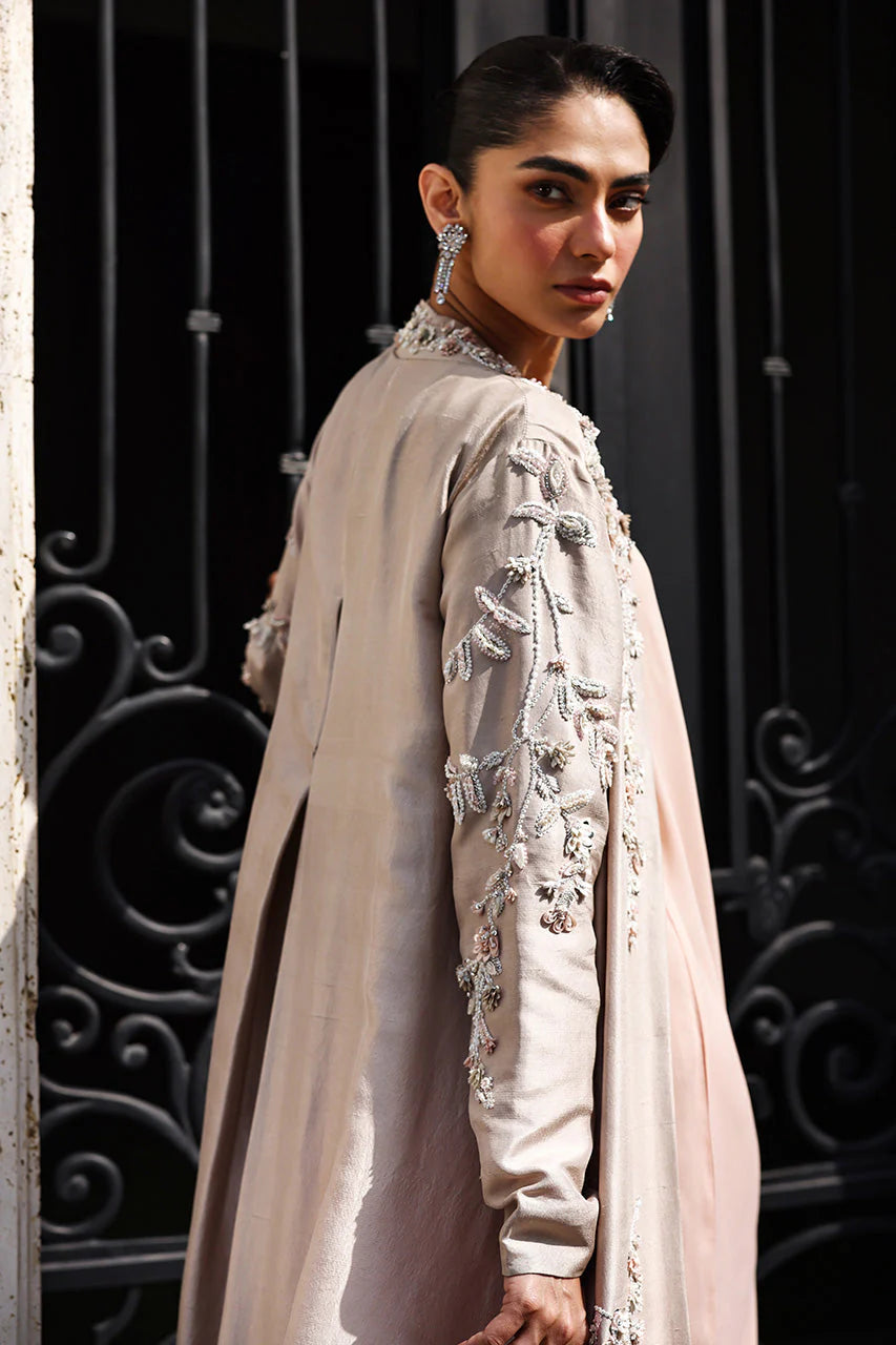Lightness defines the ensemble. An almond pure silk jacket flows floorward in an A-line cut, embroidered with meandering floral tendrils whose asymmetrical trails dance along the neckline, sleeves, and length. Sparkling white, peach, and soft pink shimmer through sequins, beads, and pearls, offering subtle depth without weight.