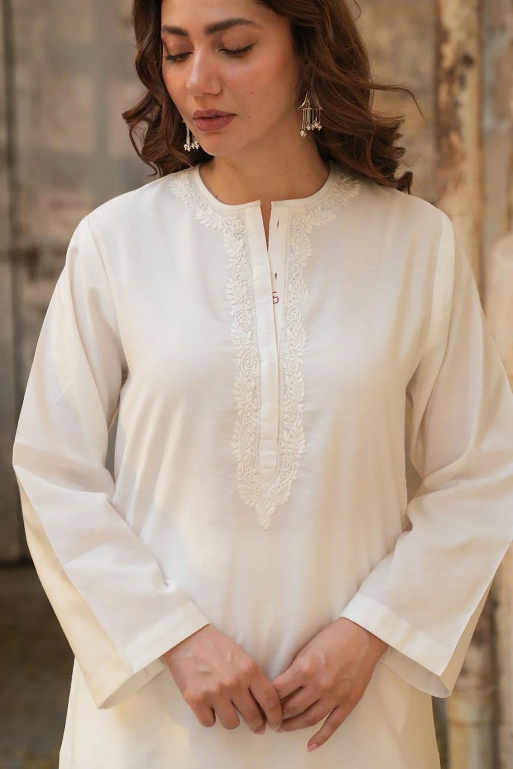 khaddi cotton, this kurta features hand-embroidered French knots and satin stitches across the neckline, back and pockets. Our neckline features our handcrafted logo to embody the playful charm of the collection. Paired with an izaar, this timeless set brings back the joy of childhood games and laughter