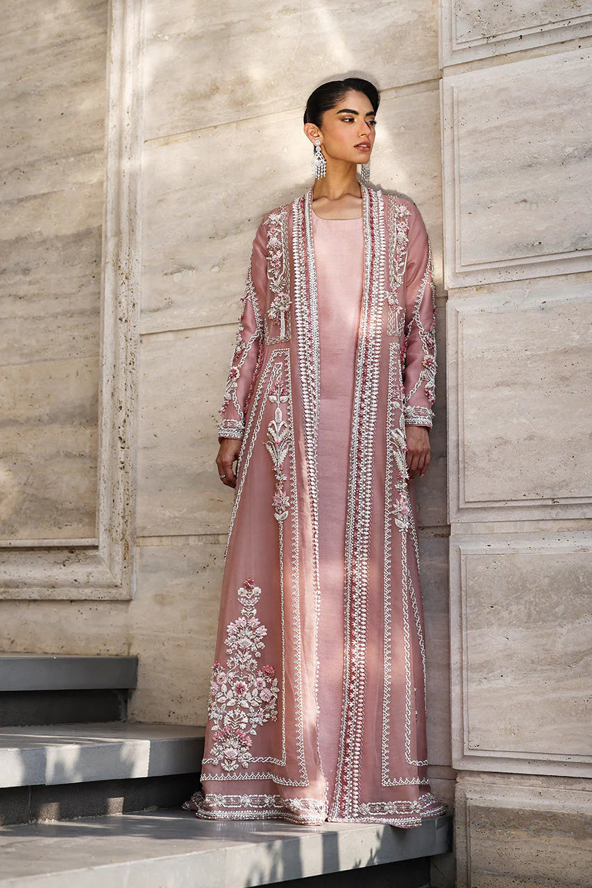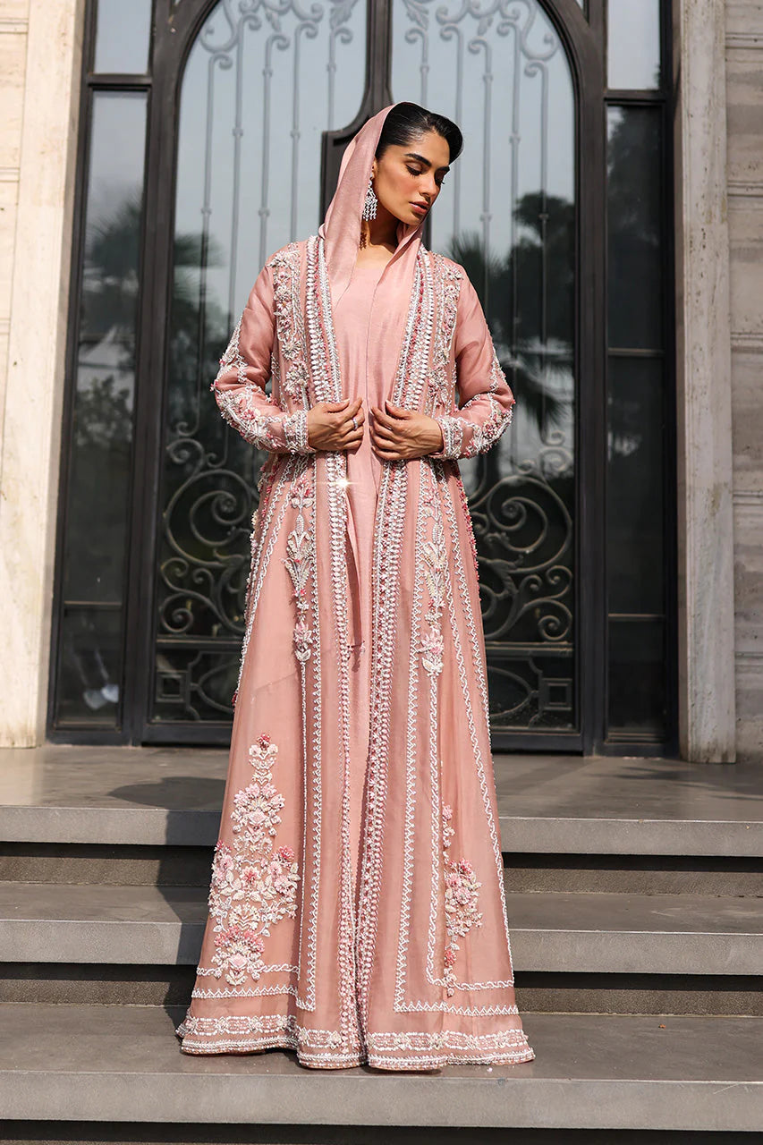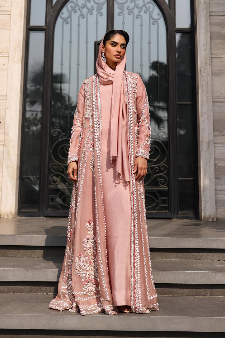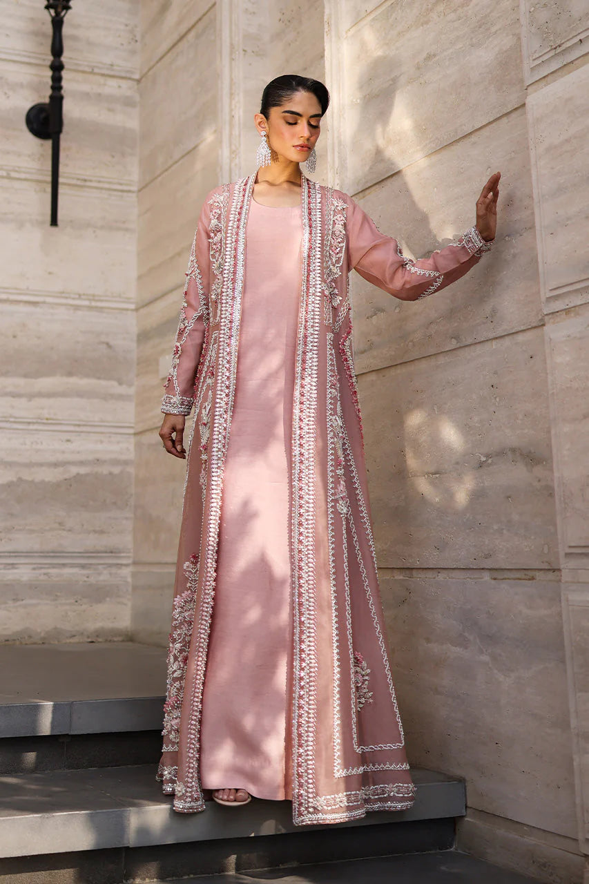 This sweeping floor-length jacket in pink organza is an ode to delicate handwork. Blossoms and geometric bands trace the billowing sheer layer, adorned in soft shades of pink, silver, and white. Sequins, beads, crystals, and sparkling zardozi bring texture and subtle shimmer across the length and sleeves, giving the jacket a luminous presence without overwhelming its airy charm. Paired with a simple pink khaddi silk kaftan and matching shella,