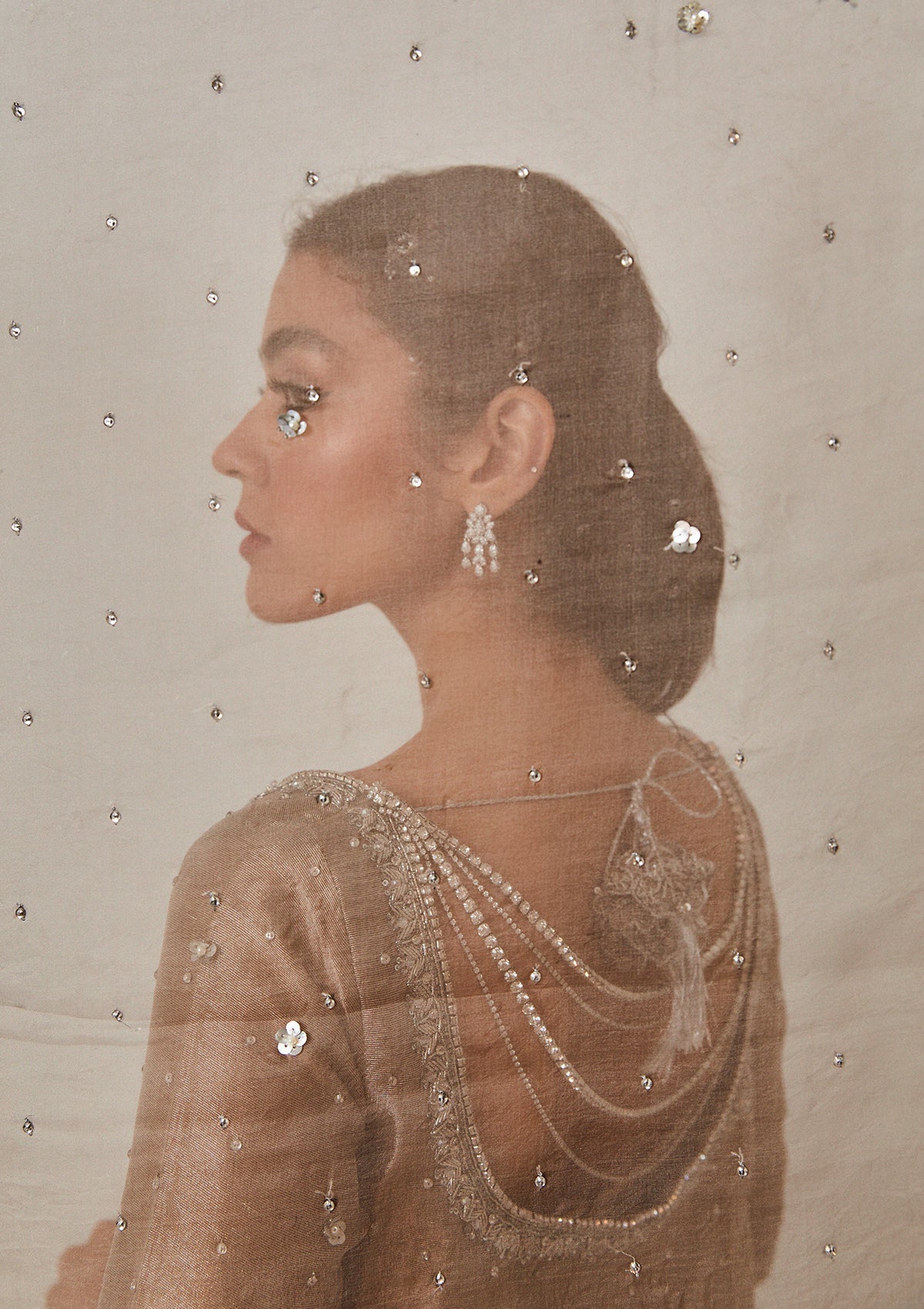 Alara comes as a 3-piece outfit in bronze with silver hand-embellishments. The shirt has tissue-net as base, with diamantés resembling a starry night all over. Izaar comes on Korean raw silk fabric, and the duppatta is on medium-organza, dazzling with diamantés with lace finishing. Please note, laces may vary slightly based upon their availability. Back neckline adds another dimension to the outfit with dazzling crystals.