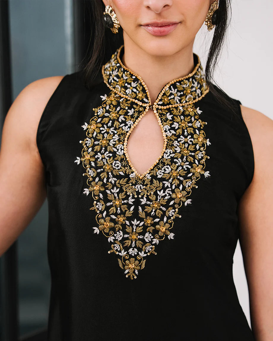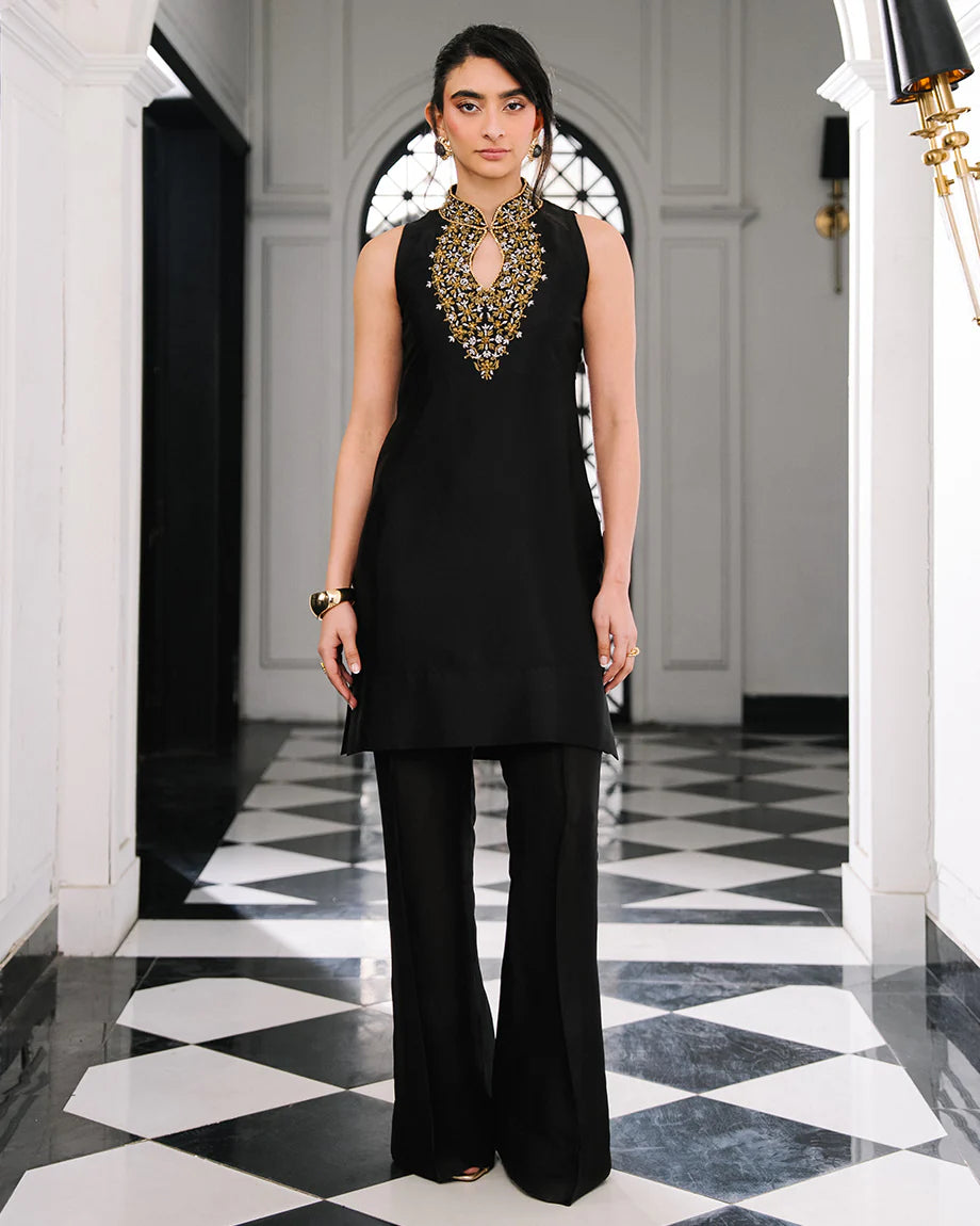 A black 2-piece set featuring a pure sheesha silk shirt and trousers with inner lining. Adorned with gold and silver dabka and stone handwork on the neckline and collar, designed for a tailored, structured fit that exudes bold elegance. Dupatta can be added on demand.