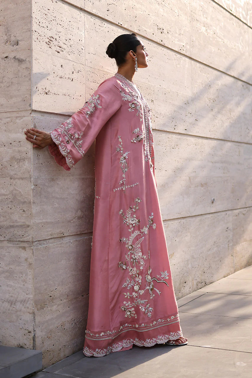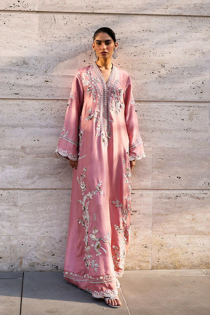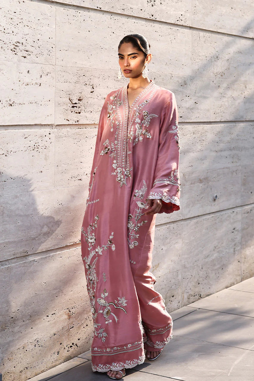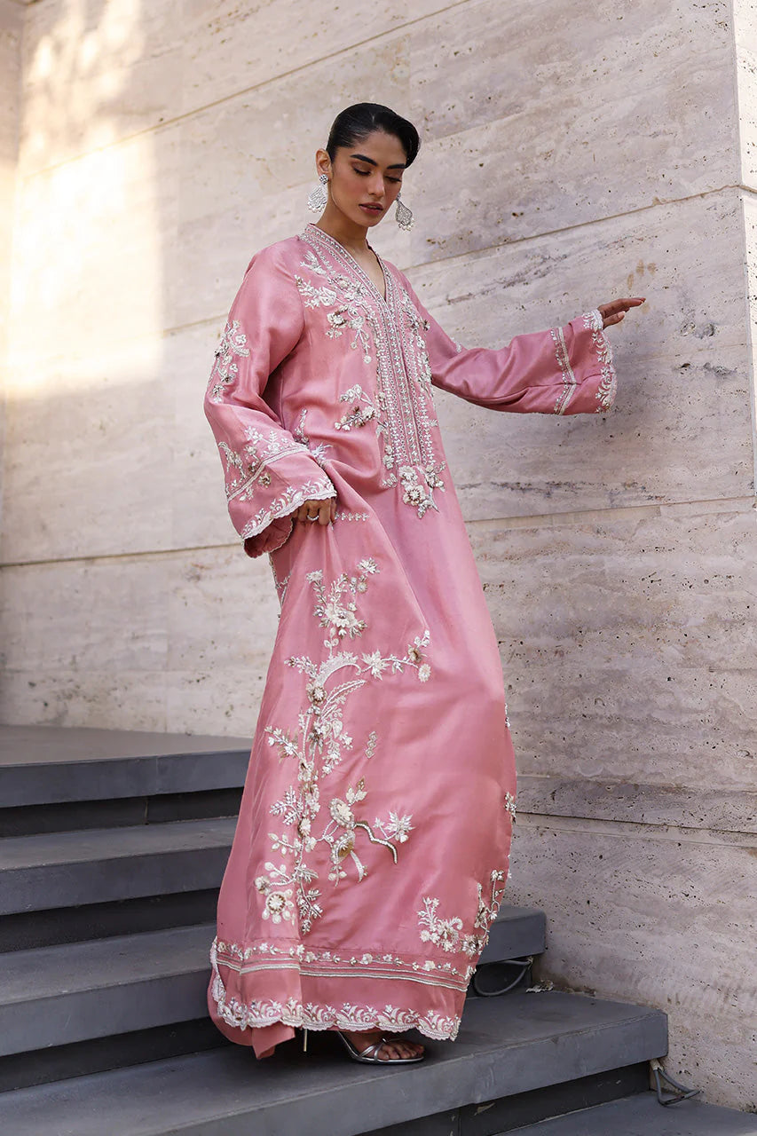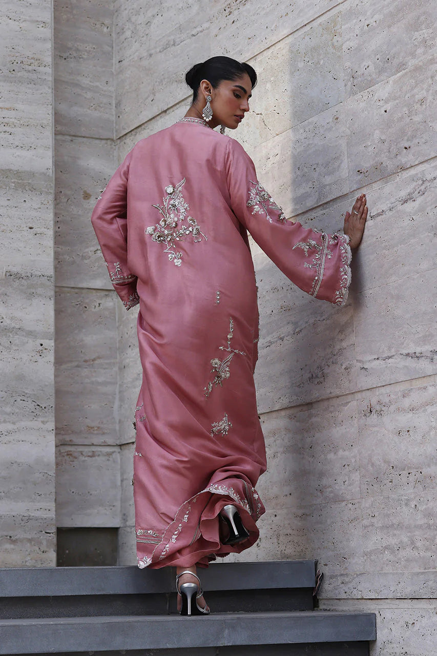Soft hues draw the gaze first, then the handwork begins to reveal itself in this pink pure silk kaftan. Its surface animated by embroidered florals and geometric borders that frame the neckline and bodice with quiet precision. A little lower, winding floral tendrils trace the sides near the hem, finishing in intricate floral scalloped hems, echoed in the daintily adorned sleeves. Beige, almond, and off-white threads, enriched with sequins, pearls, and hints of