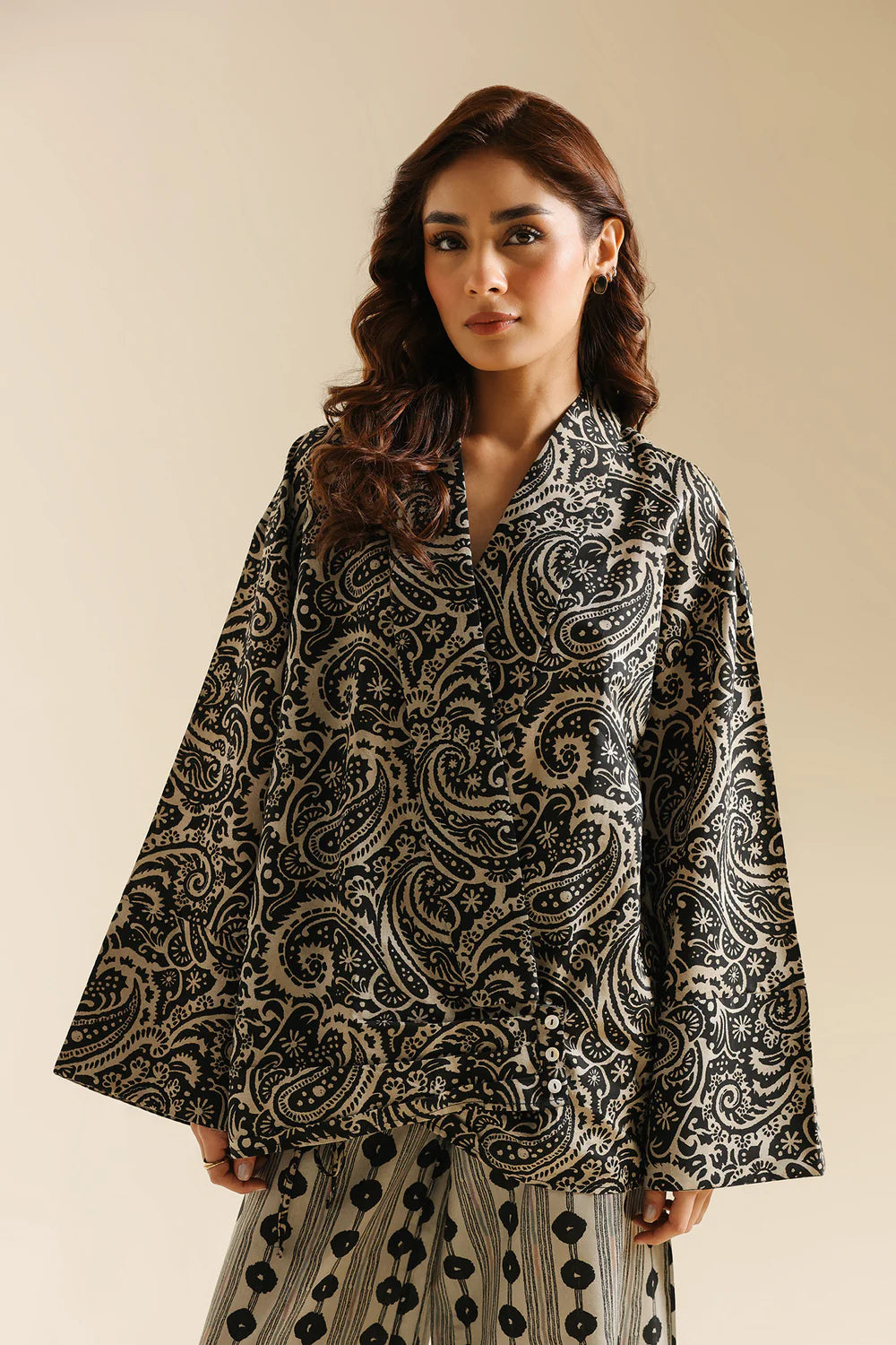 Command attention with this striking printed suit, a bold statement piece that masterfully combines pattern and proportion. The structured wrap jacket features a dramatic V-neckline and voluminous kimono-style sleeves, adorned with a captivating black and off-white paisley print that exudes timeless elegance. Paired with high-waisted palazzo trousers, the ensemble showcases a sophisticated vertical stripe composition. This contemporary silhouette celebrates artisanal design while offering versatile styling for both formal occasions and fashion-forward everyday wear.