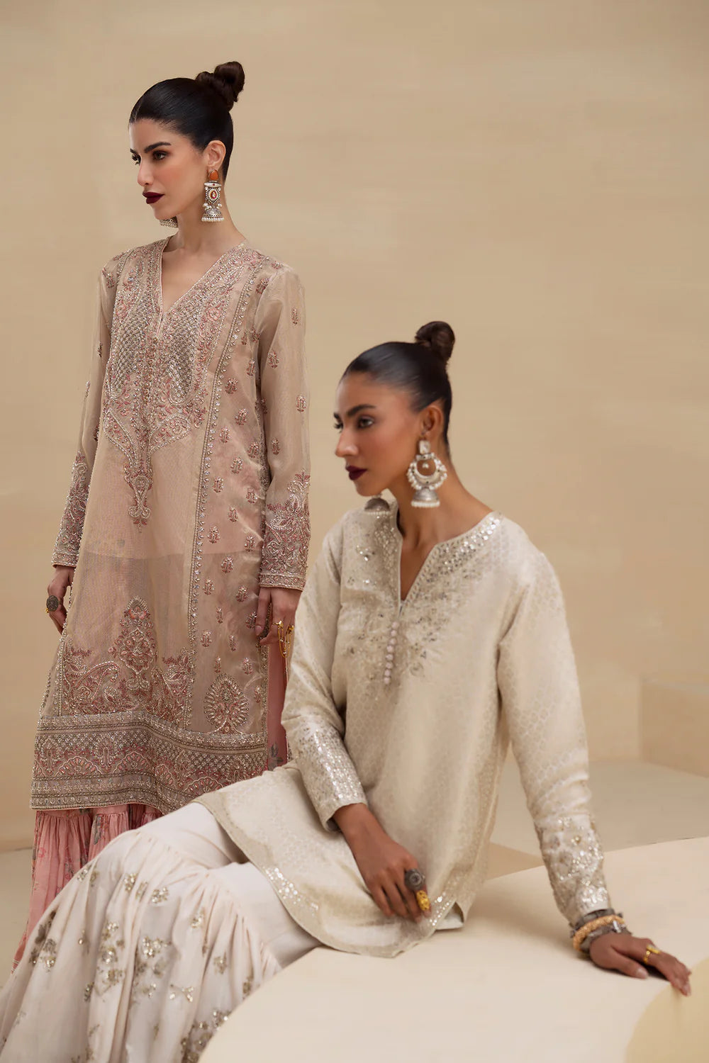 Illuminate the evening in this exquisitely detailed ivory embroidered suit, featuring a short shirt and a magnificent gharara. The straight-cut shirt is crafted from a luxurious off-white fabric with a subtle tonal woven pattern and features a deeply flattering V-neckline. The bodice and full sleeves are richly embellished with intricate gold and silver embroidery and sequin-work, giving it a luminous, festive appeal. The ensemble is completed by a voluminous gharara in a coordinating cream beige hue. The lower tier of the gharara is adorned with delicate, ornate gold thread embroidery and sequin work, creating a majestic, flared silhouette that is ideal for formal weddings or celebratory occasions.