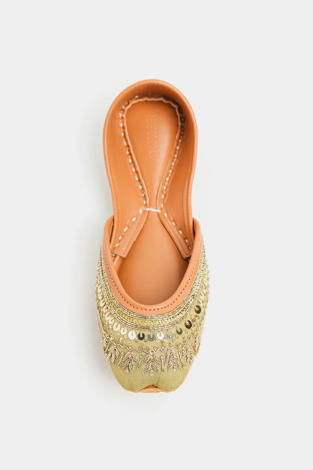 These exquisite khussas are a celebration of traditional craftsmanship and modern elegance. The warm, earthy tone of the leather provides a beautiful contrast to the shimmering gold and silver sequin work and delicate embroidery on the front. Meticulously handcrafted, each pair features a comfortable fit with a cushioned insole, making them perfect for all-day wear. Whether you're attending a festive celebration or simply elevating a casual outfit, these stunning khussas add a touch of sparkle and sophistication to your look.