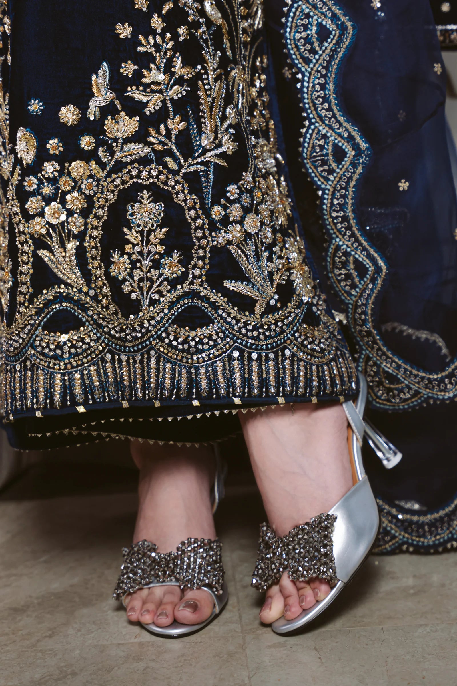 Make a statement with these glamorous embellished bow heels that redefine sophistication. Crafted with a sleek metallic finish, the open-toe design and slender heel add a modern edge while maintaining timeless elegance. Perfect for evening events or festive occasions, these heels elevate any outfit with their radiant shine and refined texture. Pair them with denim for a chic contrast or with formal wear for a dazzling finish.