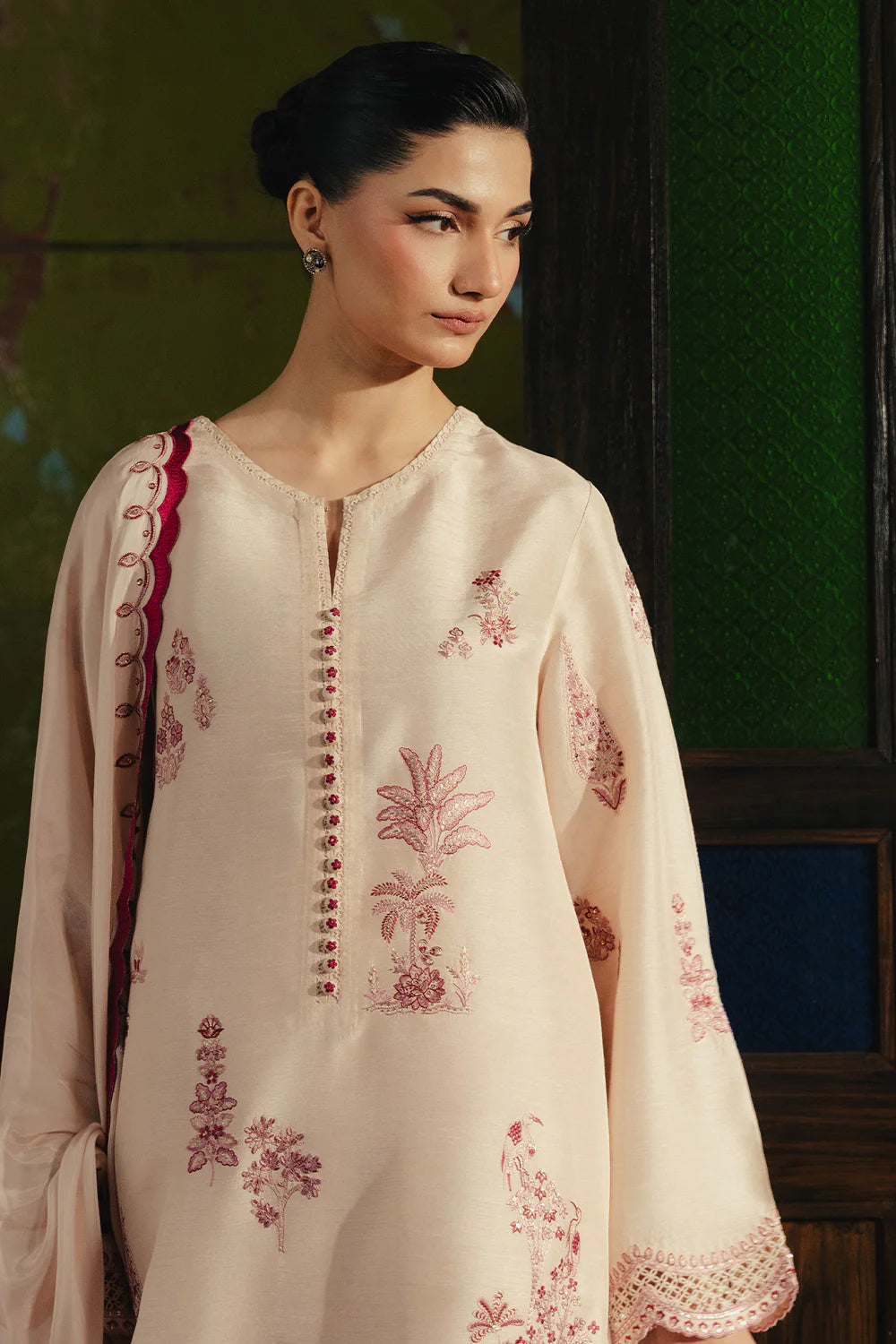 This ivory set features an embroidered shirt with delicate cutwork detailing along the hem and sleeves, paired with straight pants and an embroidered silk dupatta.