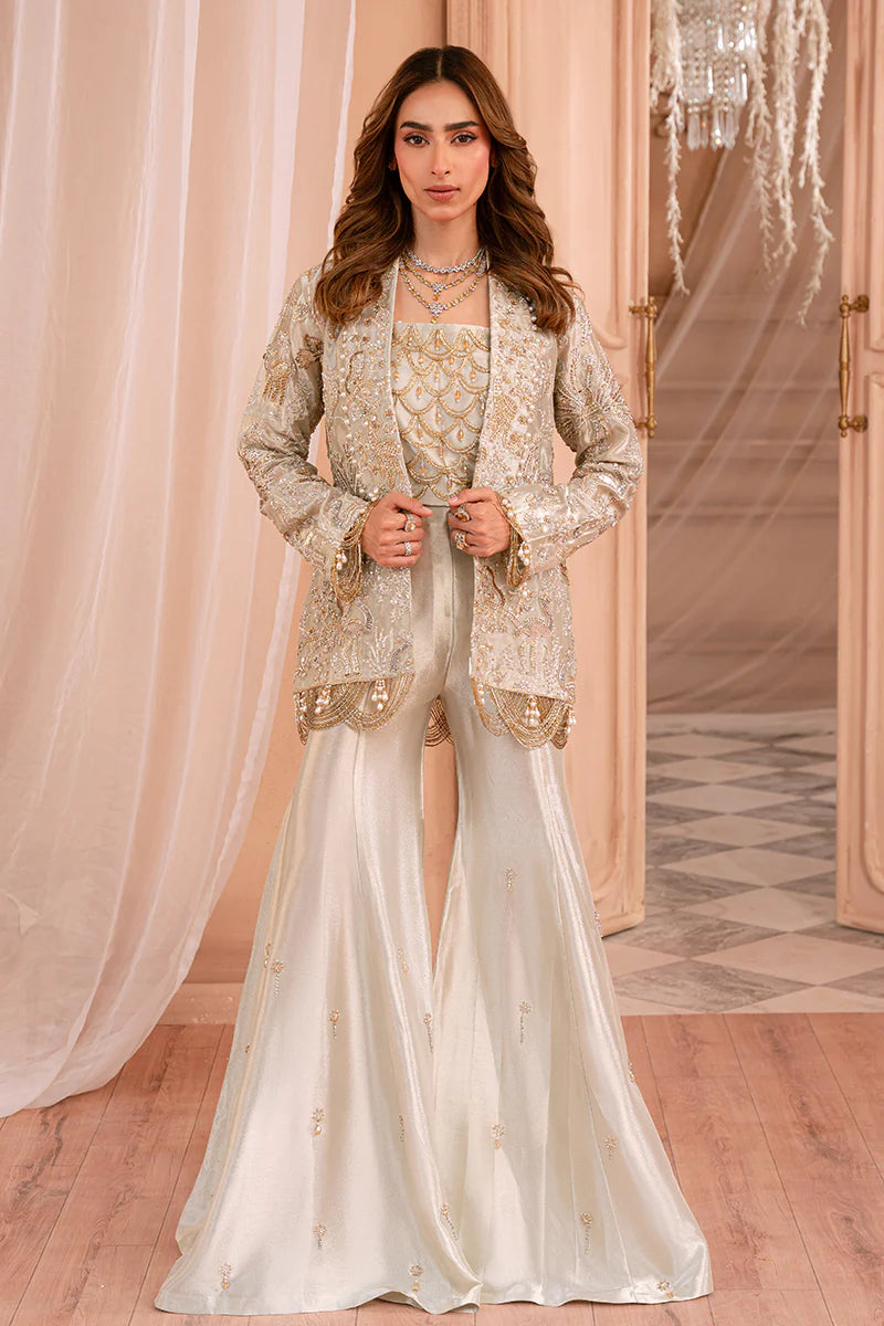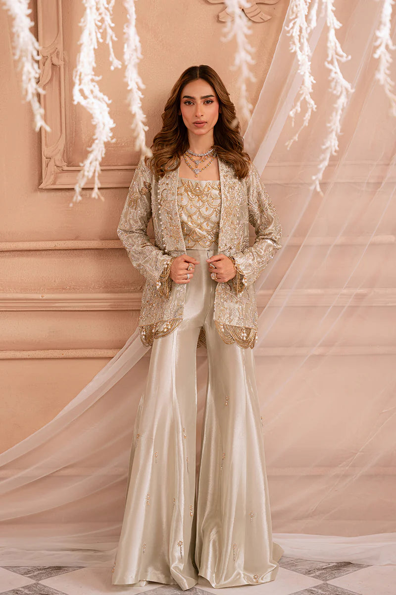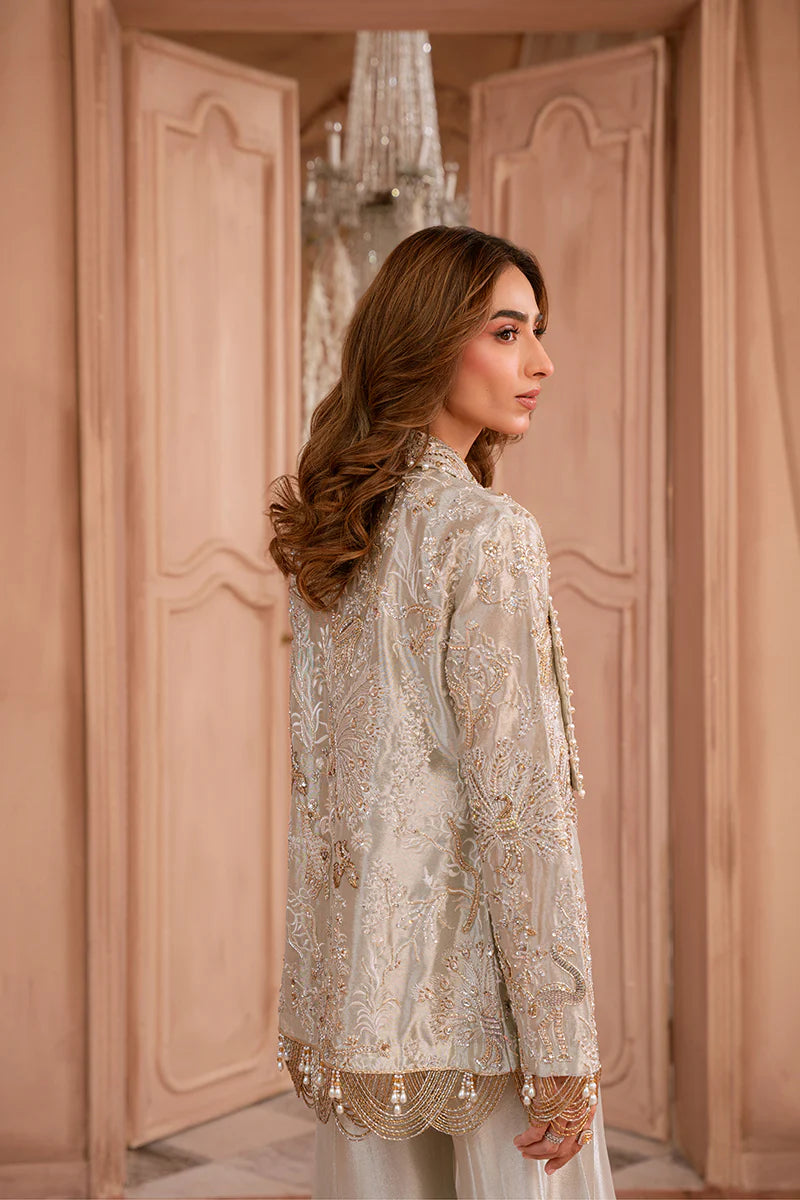 Named after the celestial glow of the Northern Lights (Aurora Borealis), AURELIA captures the dance of golden and green luminescence across the night sky — a vision of ethereal beauty and radiant poise. The ensemble features a jacket crafted from embroidered pure tissue luxe fabric, adorned with gold, silver, and bronze naqshi and zardozi work, accented with pearls, stones, and delicate hanging embellishments that shimmer like fragments of aurora light. It is paired with tissue flared sharara pants and a hand-embellished tissue bandeau, bringing together modern grace and timeless opulence.