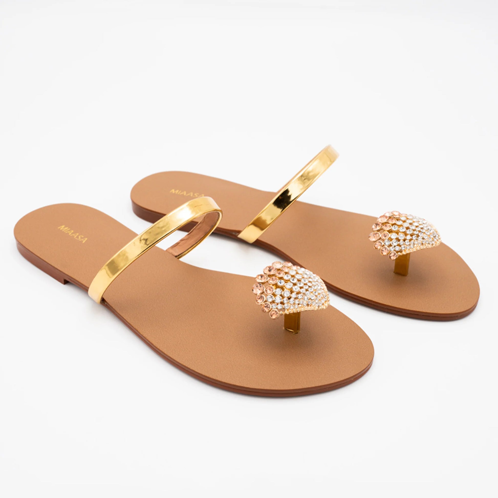 A statement flat crafted with a sleek glazed insole, paired with a radiant gold strap and an ombre crystal shell accent. Designed for both celebration and refined moments, this pair brings effortless sophistication to every step.