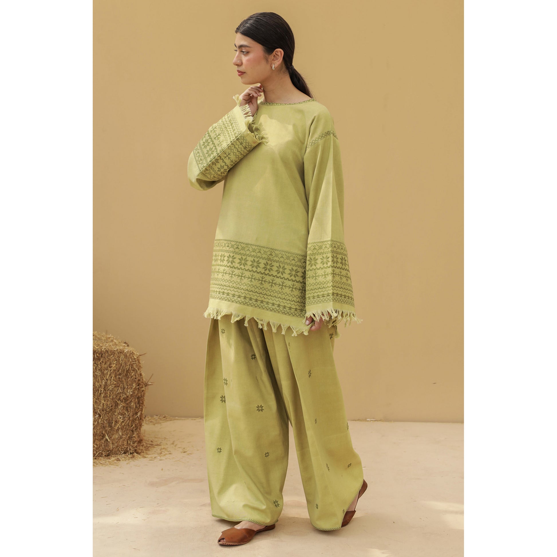 Avocado green sooti khaddar shalwar kameez with monotone cross stitch embroidery.