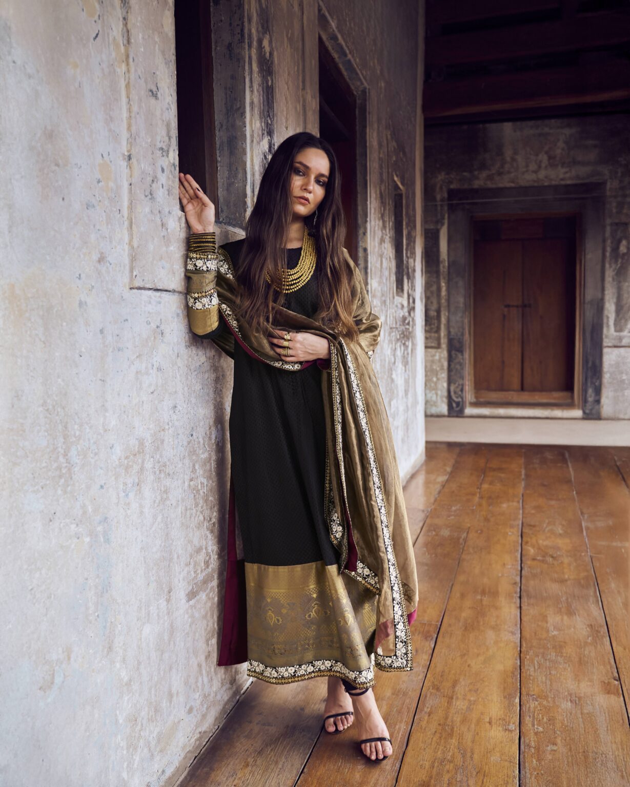 Bottom: This chooridaar pajama is crafted from pure cotton fabric blended with stretch in black color. (Note: If you want to replace the chooridaar with ijaar, you may contact our team for options)