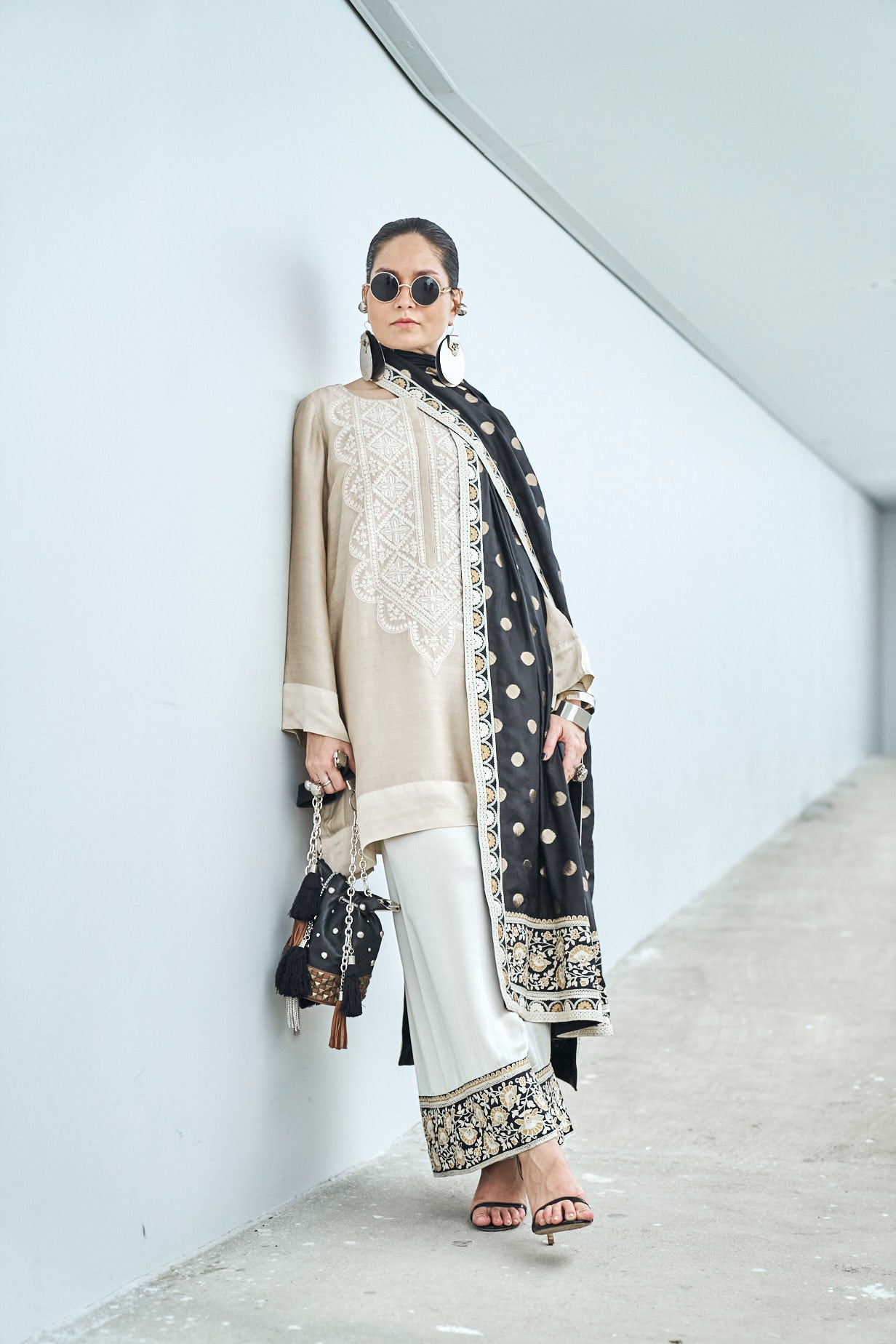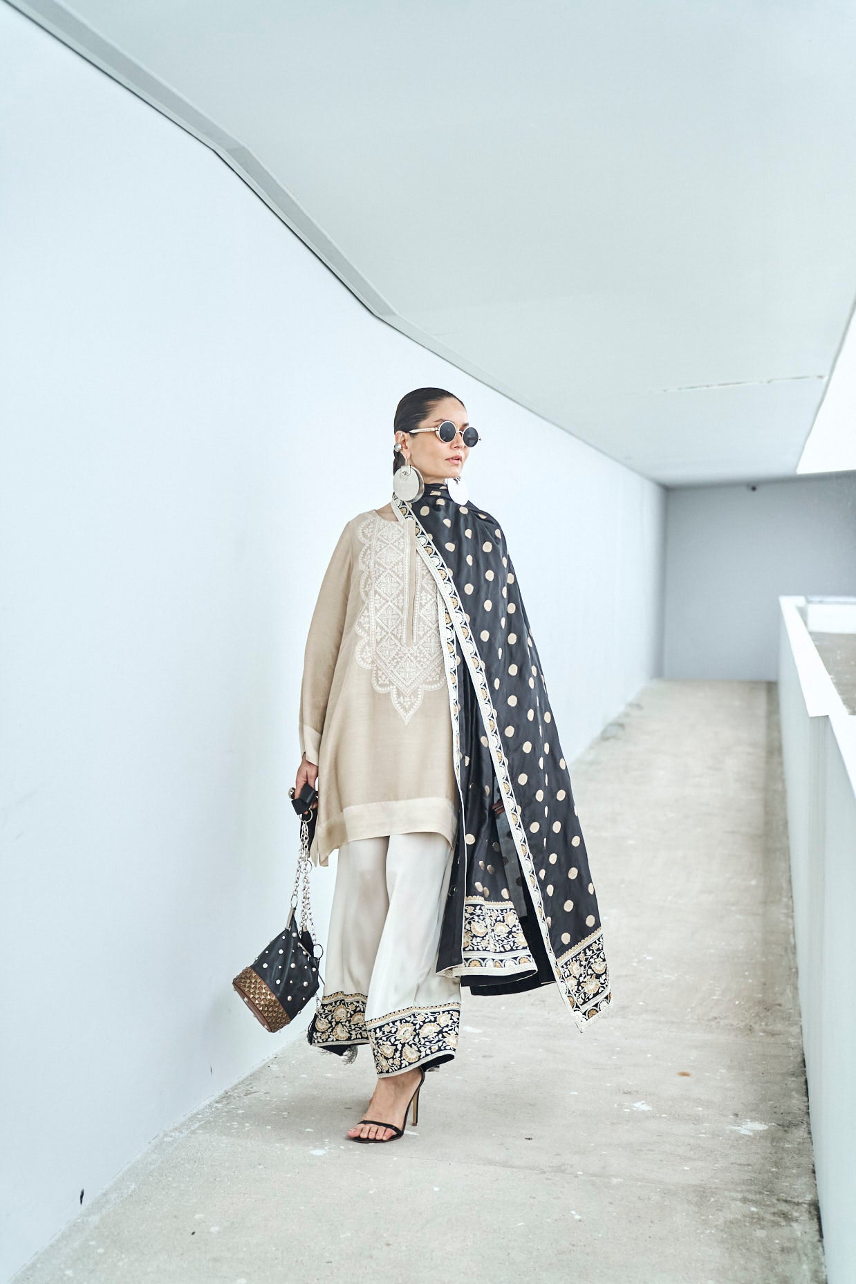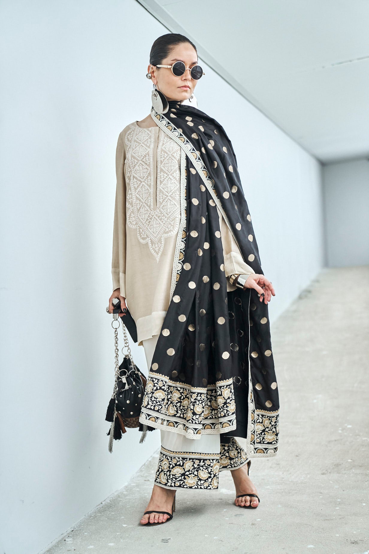 Dupatta: Black pure katan silk polka dot dupatta with thread and zari embroidery borders.