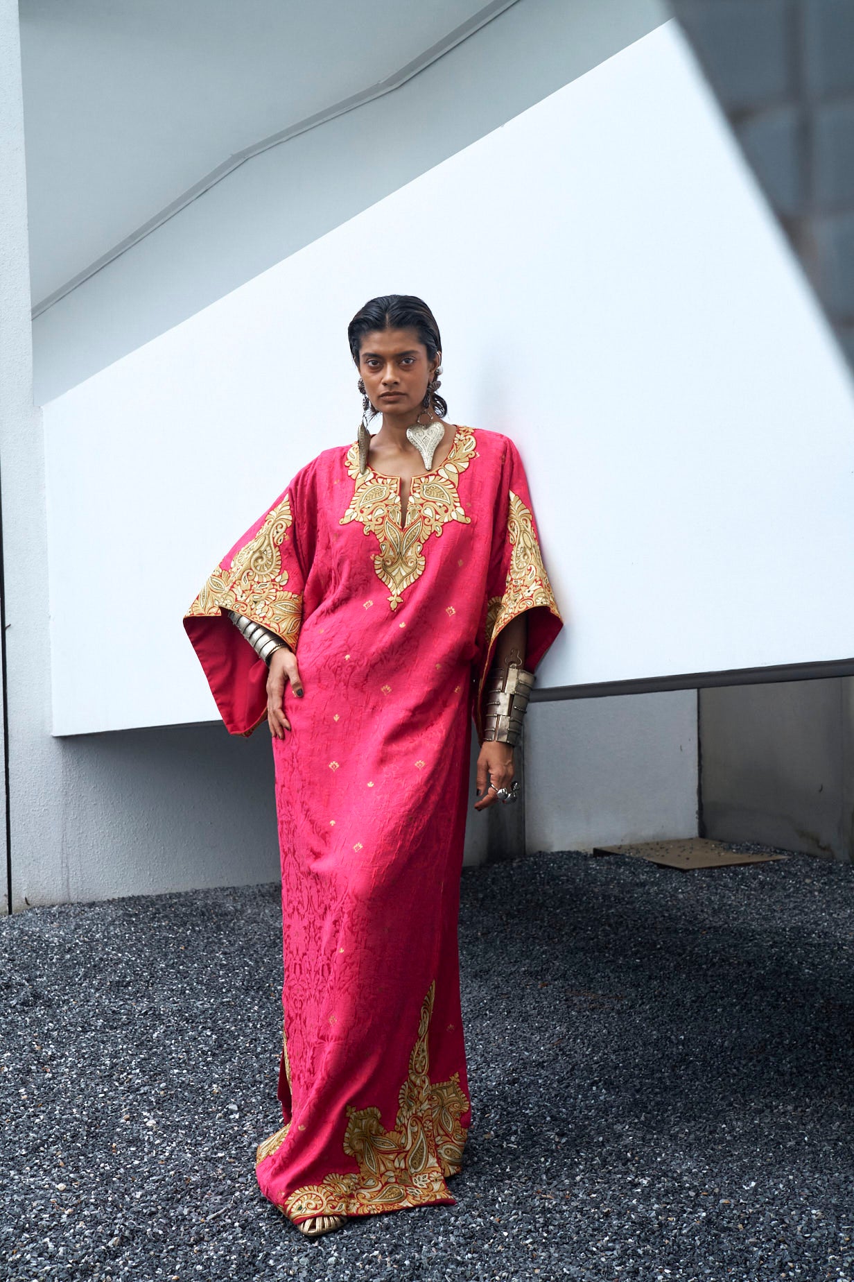 Kaftan: Berry Pink floor length kaftan crafted with self karandi jamawar using techniques of zari embroiderey on front and back neckline, sleeves, side slits and daman