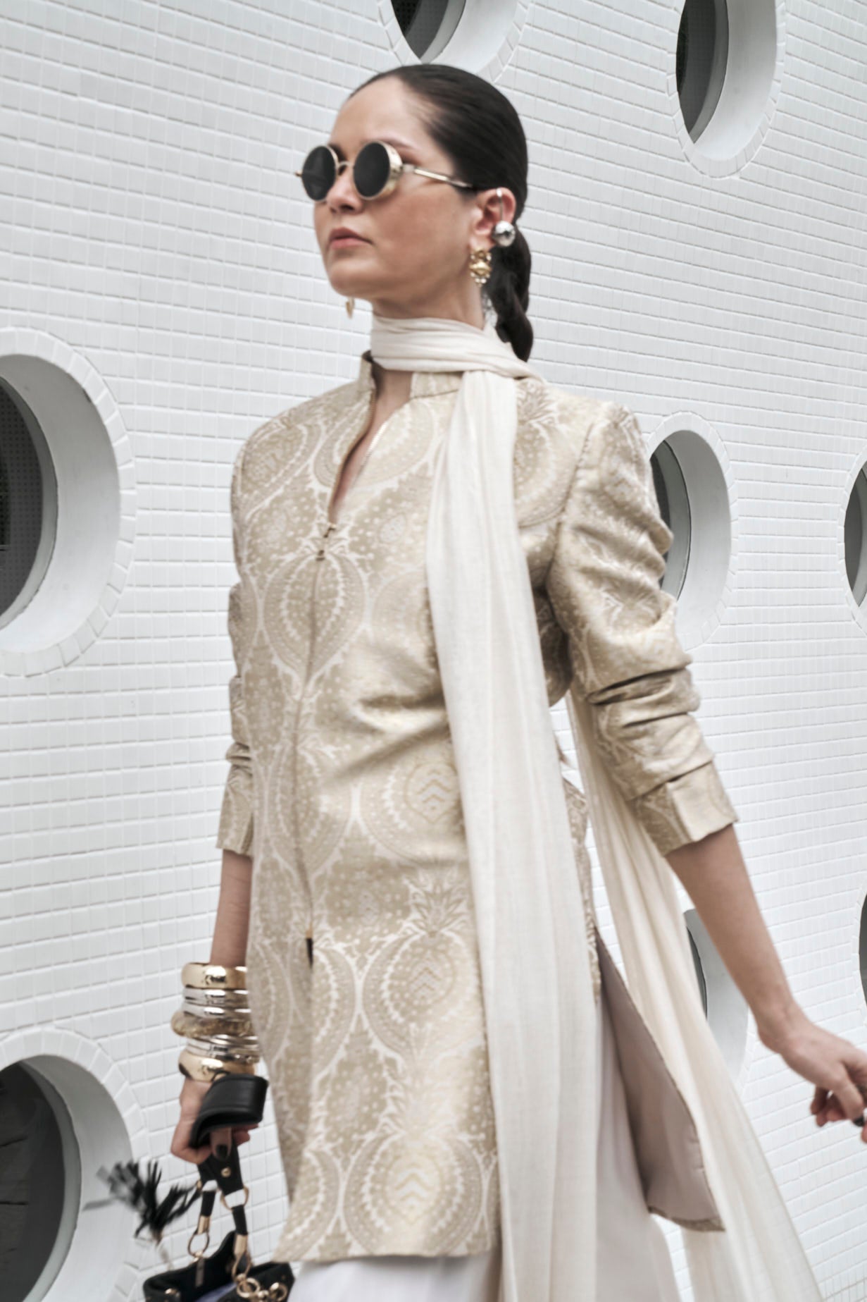 Jacket: The jacket is made from a dull gold pure atlas jamawar with the woven jamawar pattern in a slightly contrasting gold metallic thread. The jacket has a strutured, tailored-fit and the length falls to the mid- thigh area.