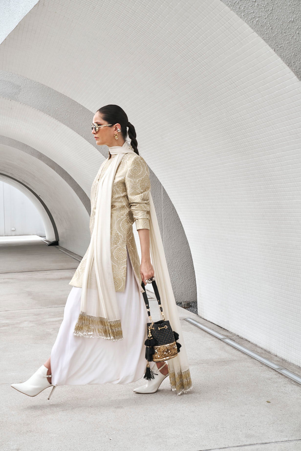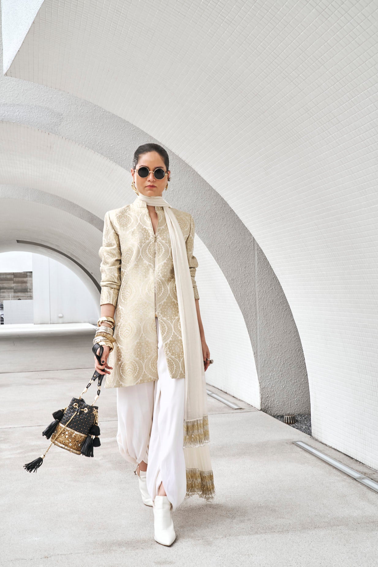 Bottms: Styled as a modern dhoti crafted in ivory lawn cotton fabric featuring dramatic folds and a relax fit through the hip and thigh provides a contemporary and stylish drape.