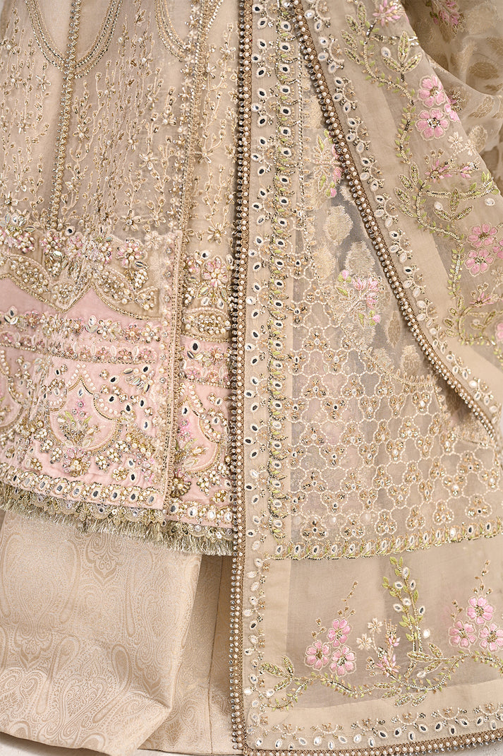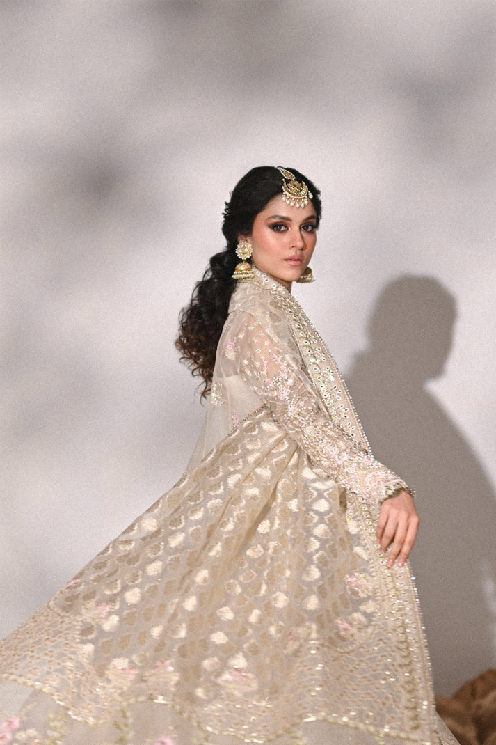 A soft beige dress adorned with intricate resham embroidery in beautiful hues, complemented by delicate hand embellishments and intricate shesha work. This ensemble effortlessly combines timeless elegance with artisanal charm.