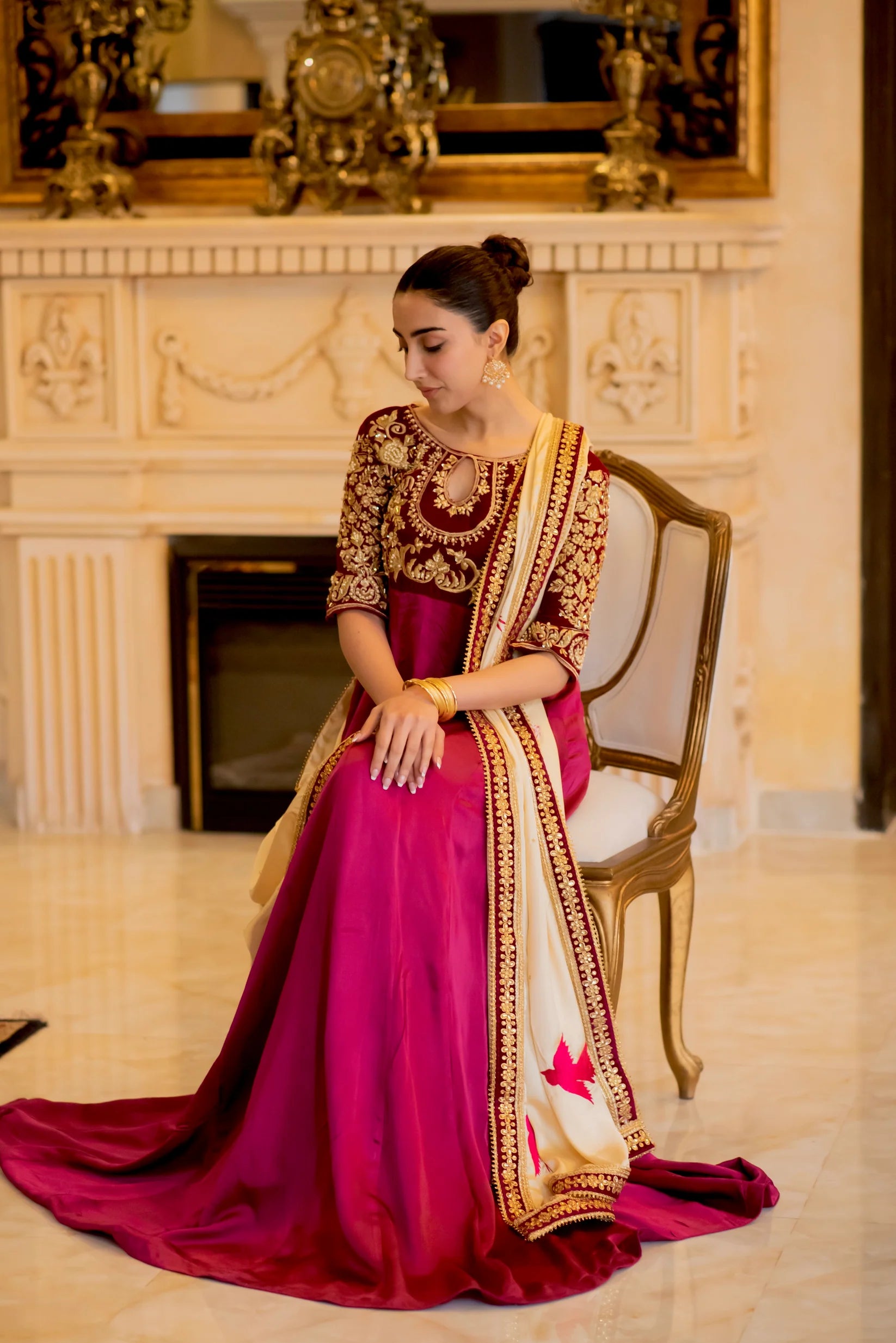 with a flowy base on pure shamuse silk. This outfit is going to be your immediate choice for an unforgettable wedding look. The pure medium silk duppatta in a contrasting shade of beige, lavishly adorned with gold sequin spray and embroidered motifs brings the whole outfit together.
