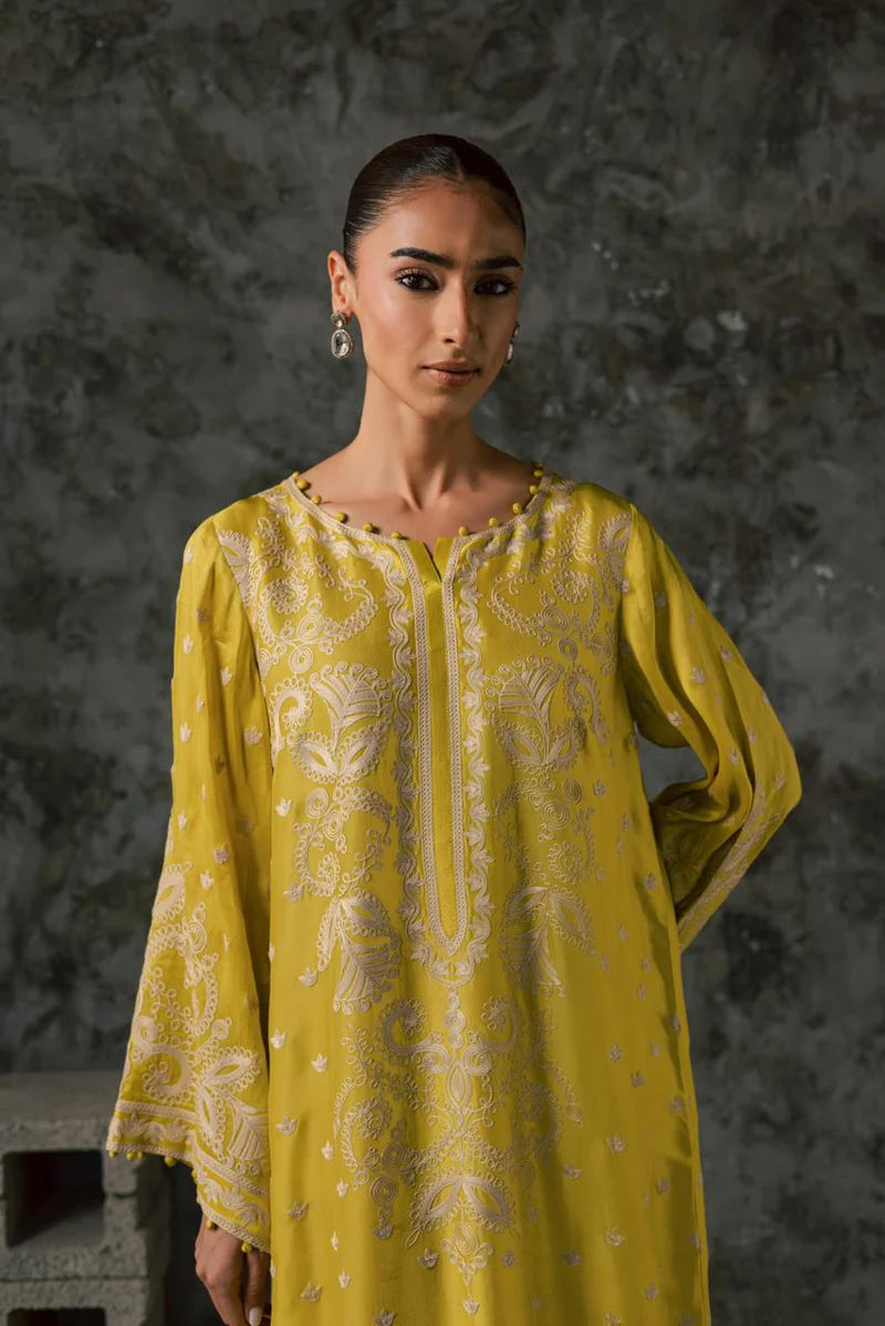 Azara Kaftan is rendered in our signature silk, exclusively created in-house on the loom, in a luminous yellow-gold hue. Intricate ivory aari embroidery frames the neckline, sleeves, and hem, elevating its fluid silhouette with timeless detail