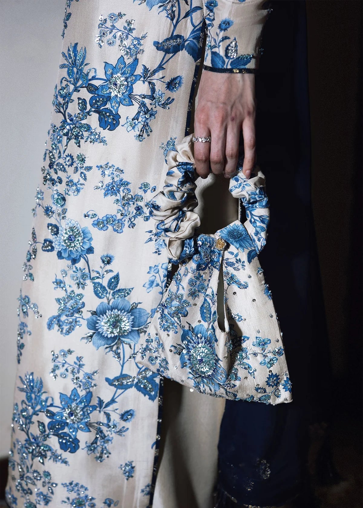 This elegant ensemble features a classic ivory and navy blue color palette, combining intricate floral patterns with modern tailoring. The long, straight-cut kameez is crafted from a lustrous ivory silk-blend fabric, entirely covered in an intricate blue floral print reminiscent of traditional porcelain. The neckline is designed with a small split-round opening, accented by long, thin drawstrings that terminate in decorative navy tassels. For the bottoms, the shirt is paired with voluminous, wide-leg palazzo trousers in a solid ivory silk that provides a clean, fluid contrast to the busy print of the top. A deep navy sheer dupatta, likely made of chiffon or organza, is draped over the shoulder and features matching blue and silver facing along its borders.