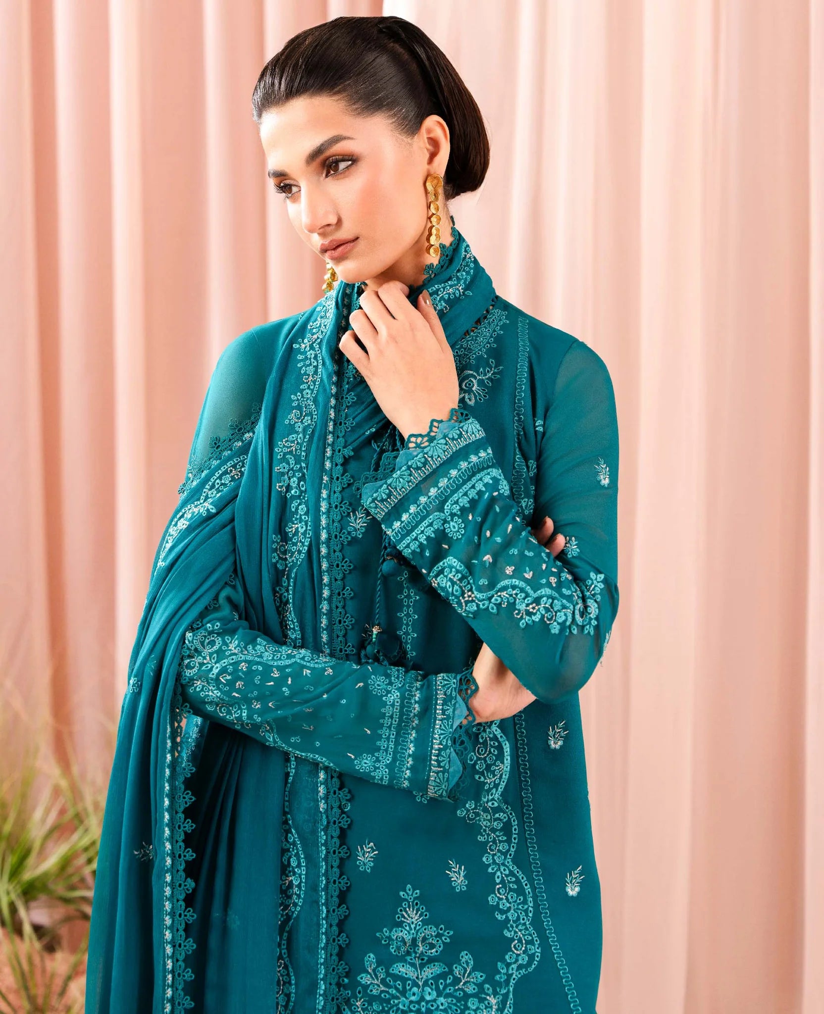 A zinc blue chiffon short shirt with an airy, fluid fall, detailed with four sided embroidery for a perfectly balanced finish. Rendered in refined monotone hues, the design is elevated with delicate floral embroidery light in feel yet rich in detail. Paired with a matching chiffon dupatta for effortless drape and styled with a farshi shalwar that lends a regal, elongated silhouette. A seamless harmony of softness and structure, celebrating timeless craftsmanship with a modern sensibility.