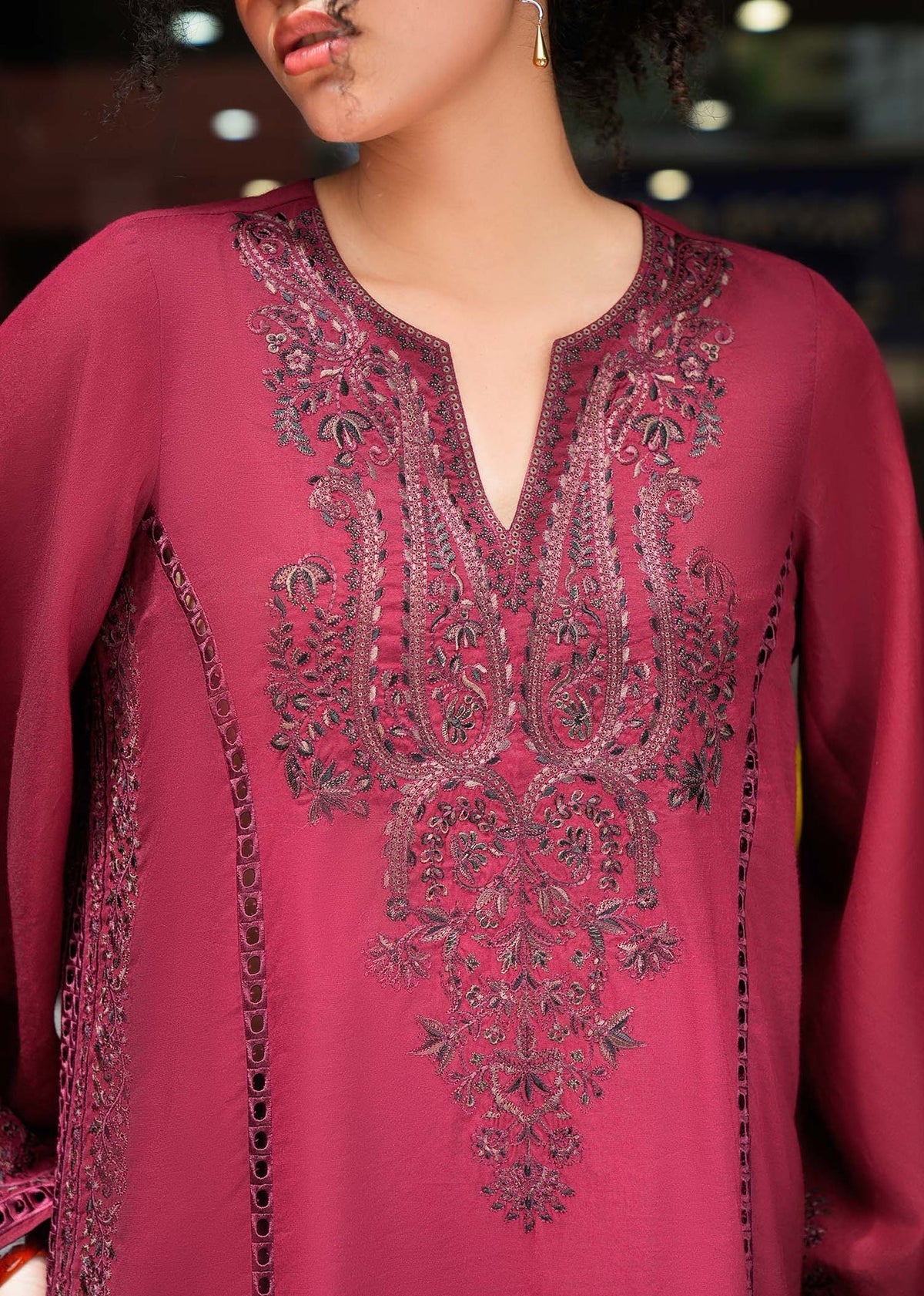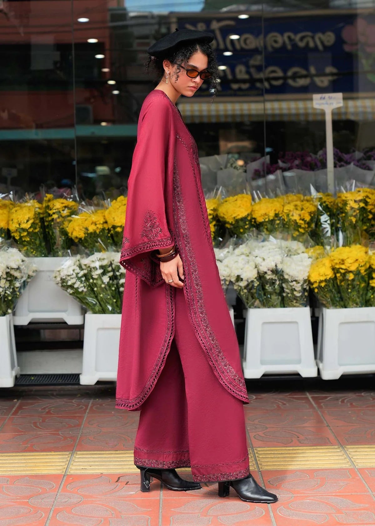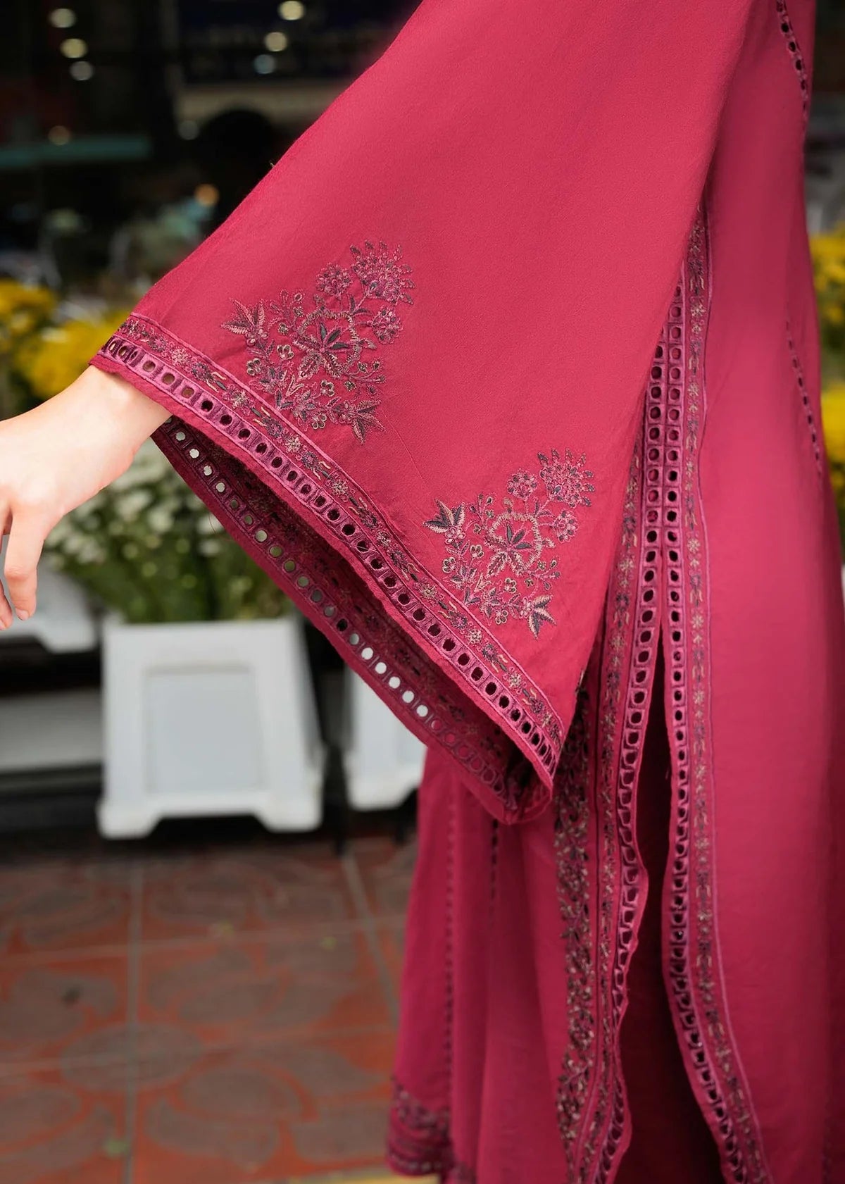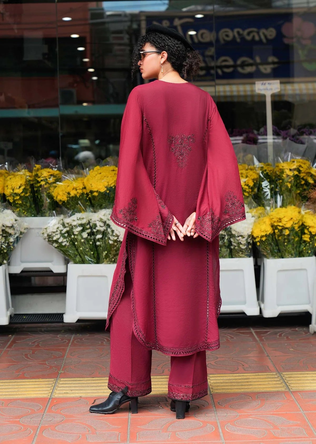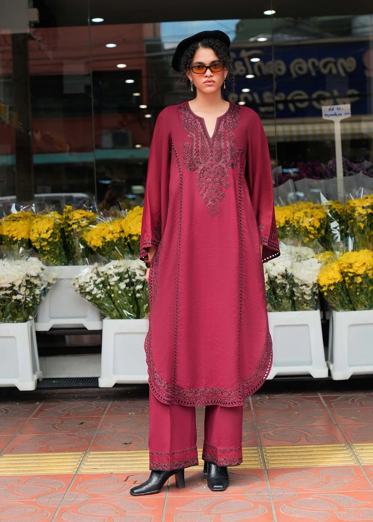 This outfit is a deep maroon two-piece ensemble featuring a long embroidered kurta with intricate threadwork on the neckline, sleeves, and hemline. The kurta has a graceful, flowy silhouette paired with matching straight pants adorned with subtle embroidery at the cuffs.