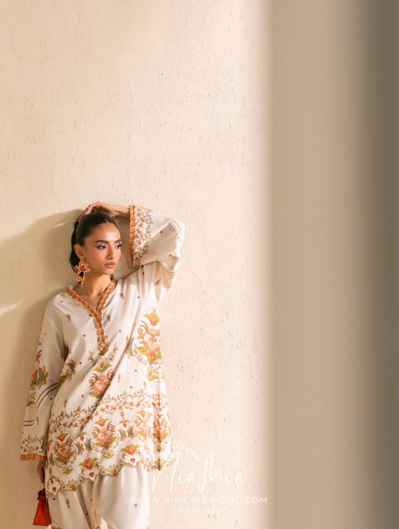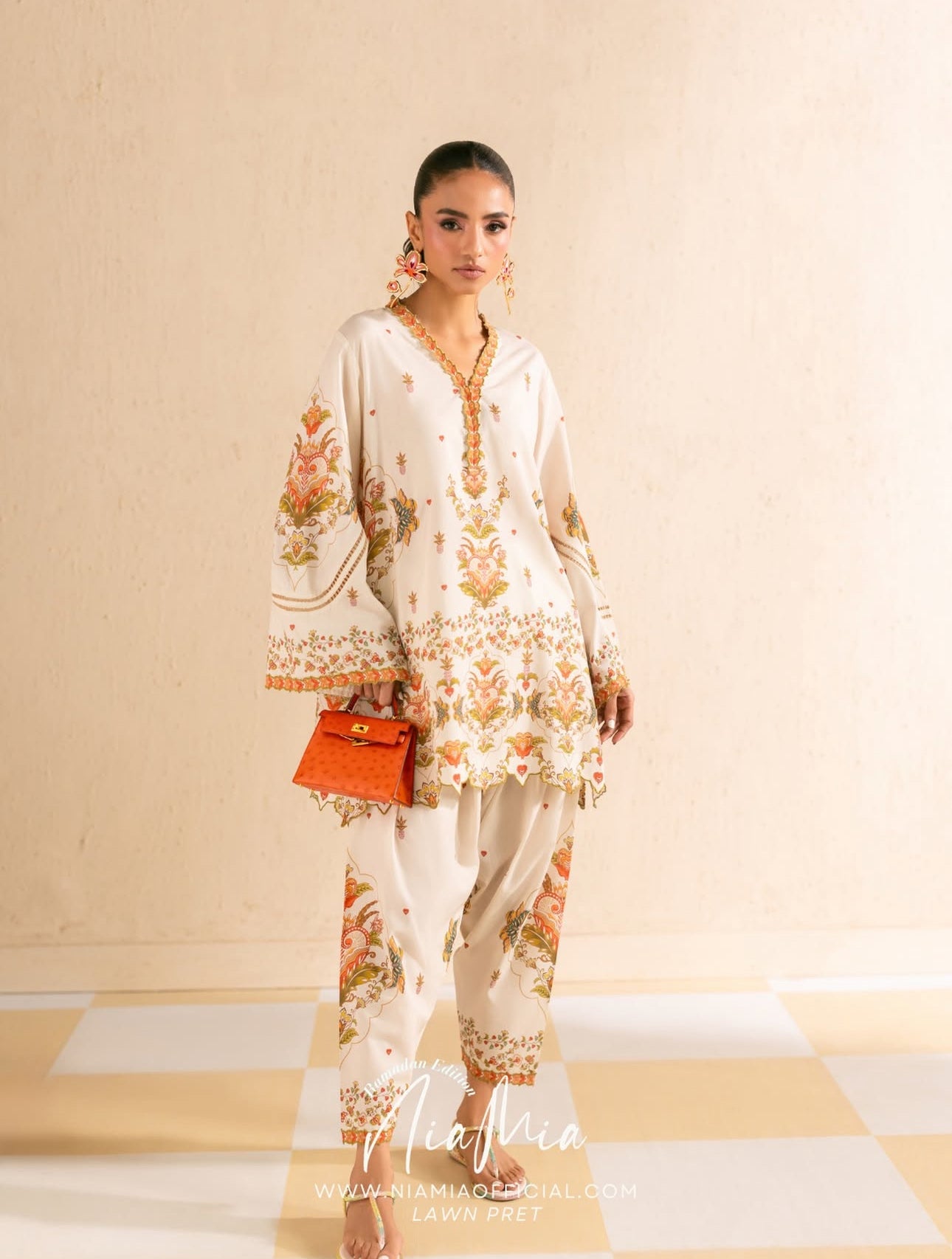 Banaoffee Pie is crafted on a soft ivory lawn base, featuring a delicate all-over print accented with subtle heart motifs. The shirt is finished with a beautifully detailed neckline and scalloped hem, while the printed lawn shalwar adds balance with coordinated borders.