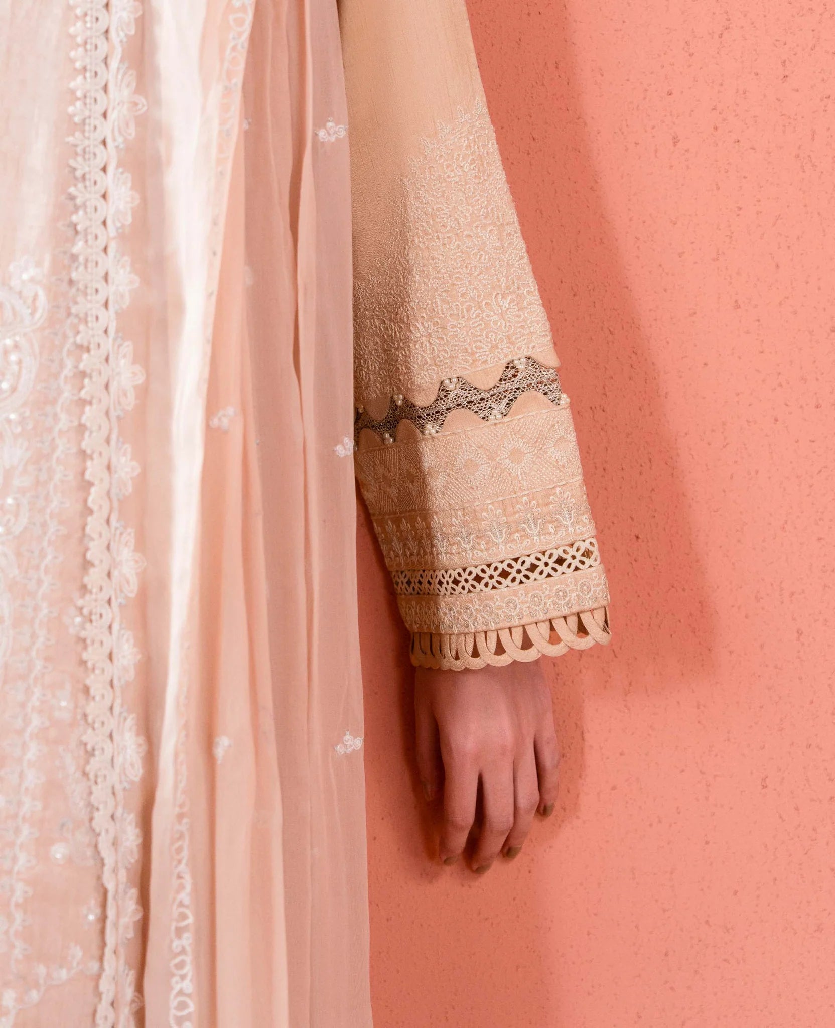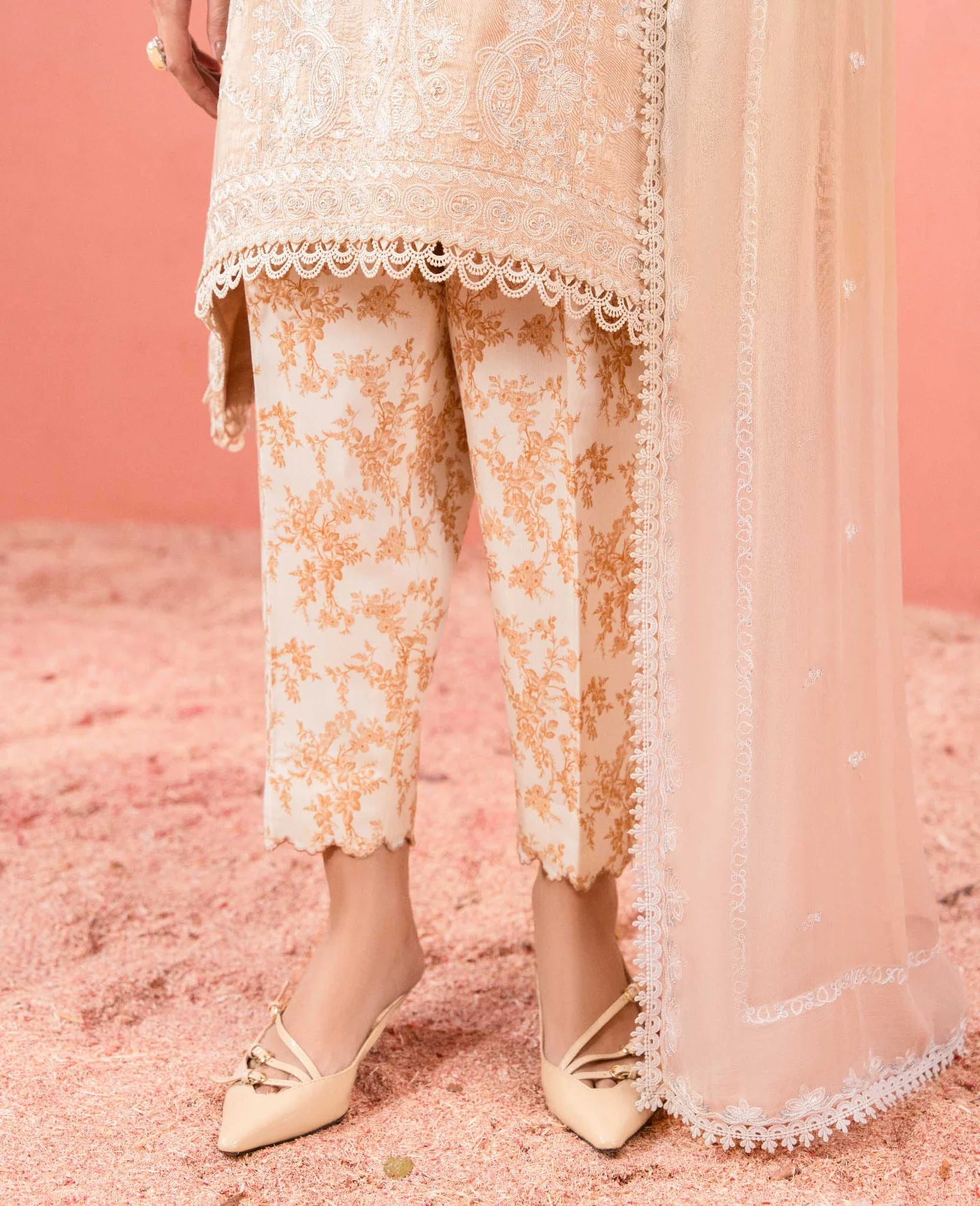 A study in quiet luxury and restrained craftsmanship, this beige short shirt is designed for timeless, understated sophistication. Featuring a relaxed contemporary silhouette with modern dropped corners, it is adorned with delicate monotone embroidery that adds subtle depth without overpowering the design. Paired with a soft, flowing chiffon dupatta and styled with a printed skinny raw silk shalwar for contrast, the look strikes a refined balance between minimal detailing and statement styling effortless, modern, and thoughtfully crafted for understated festive dressing.