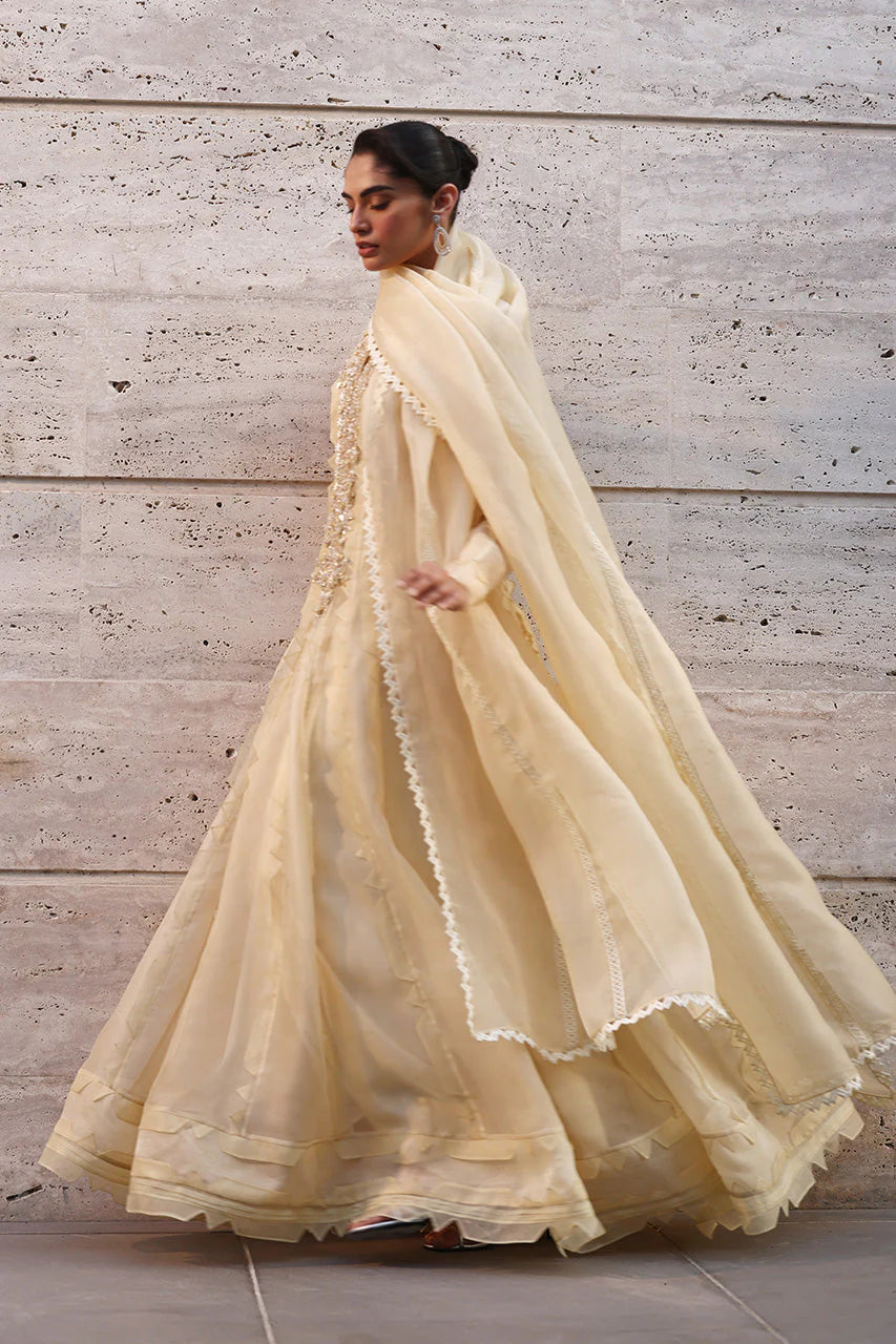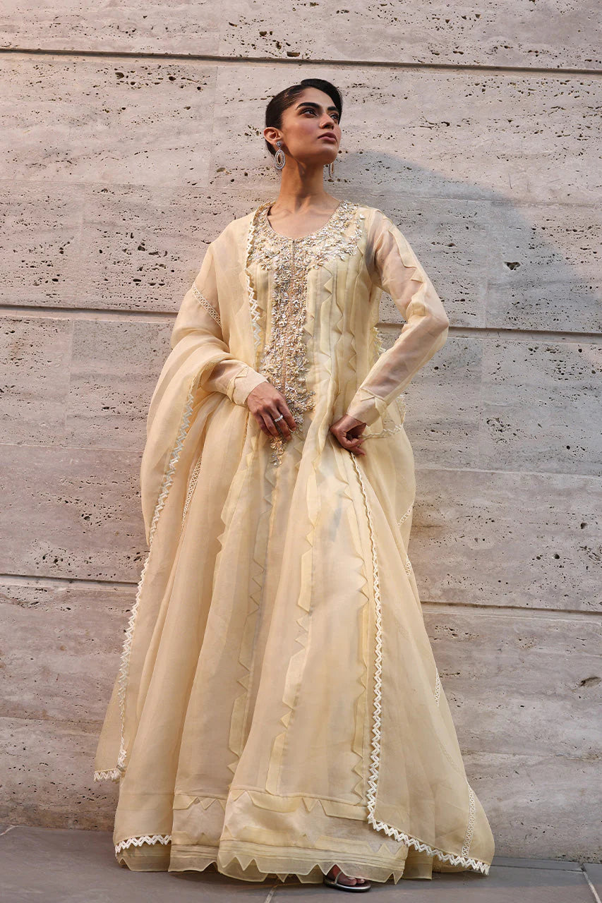 This ensemble is celebration of masterful handwork in a traditional form. The lemon yellow organza kalidar, adorned with delicate florals clustered around the neckline, hand-embroidered and accented with zardozi, sequins, and dimensional flourishes. Chevron-like edging along each seam add a subtle layer of texture and visual rhythm. Paired with a lemon yellow organza dupatta edged with trims, and matching pure raw silk pants, the set balances craft and structure, offering a look that is both classic and refined.