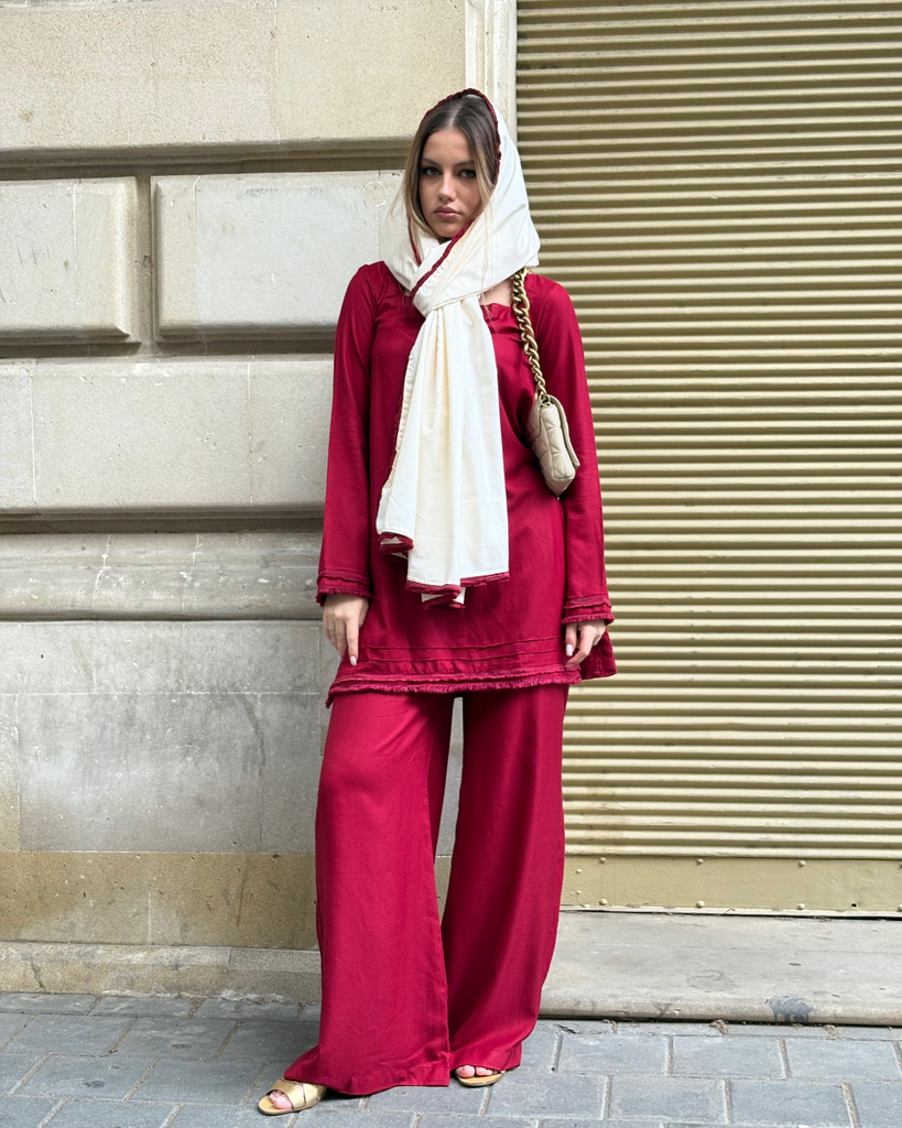 A maroon dhannak shirt paired with culottes, finished with fringe lace detailing on the border and sleeves for a chic touch. And an off-white shawl with maroon fringe laced border for an elegant look.
