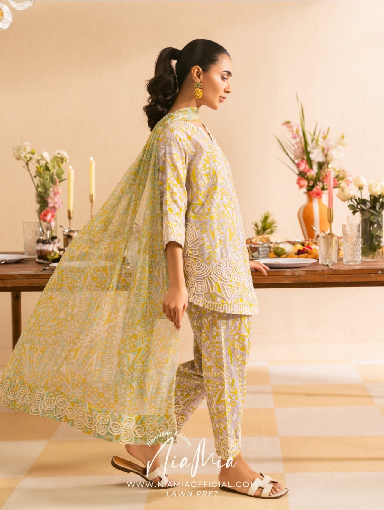 A breezy lawn ensemble in lilac and green shades; the shirt is adorned with churma embroidery along the neck, sleeves, hem, and shalwar edges, paired with a narrow shalwar for a polished yet relaxed summer look.