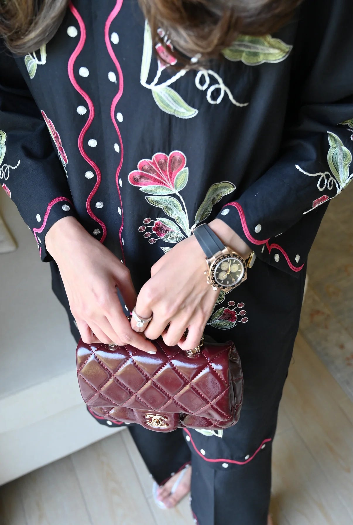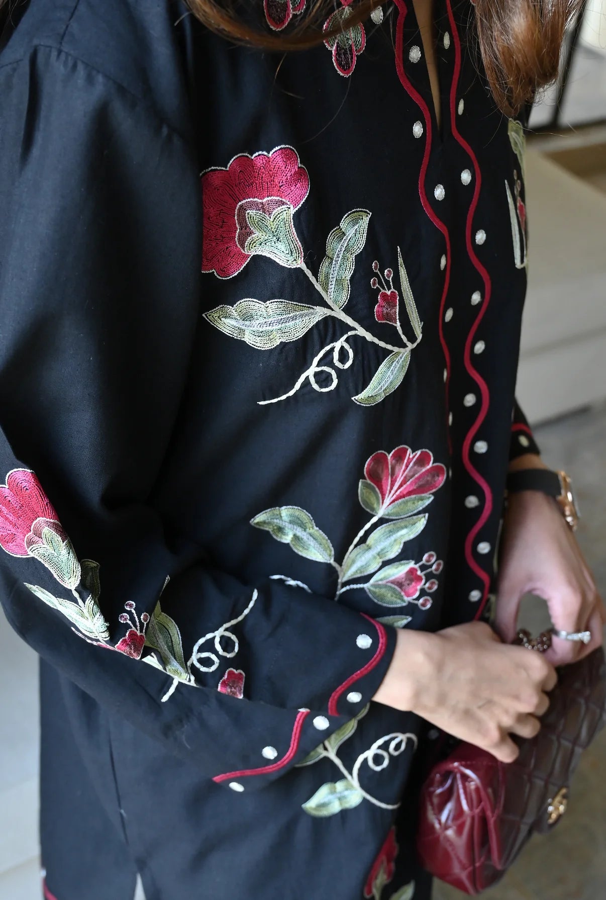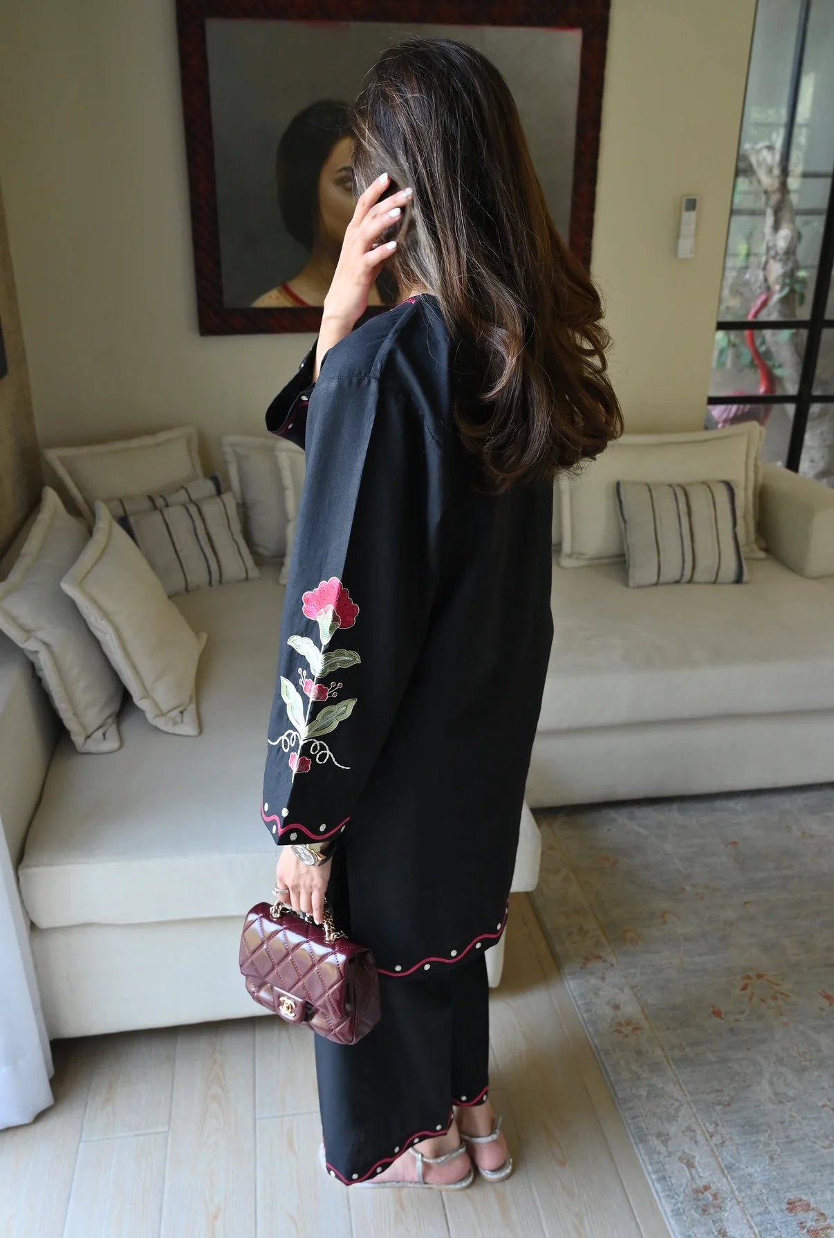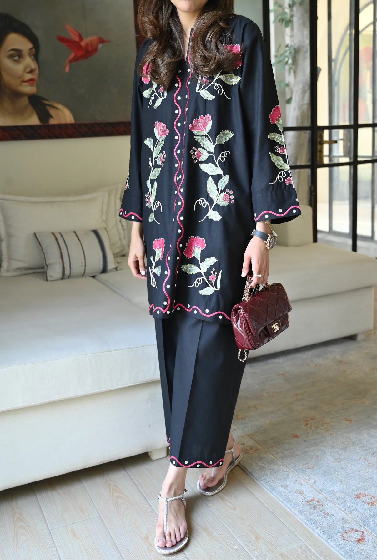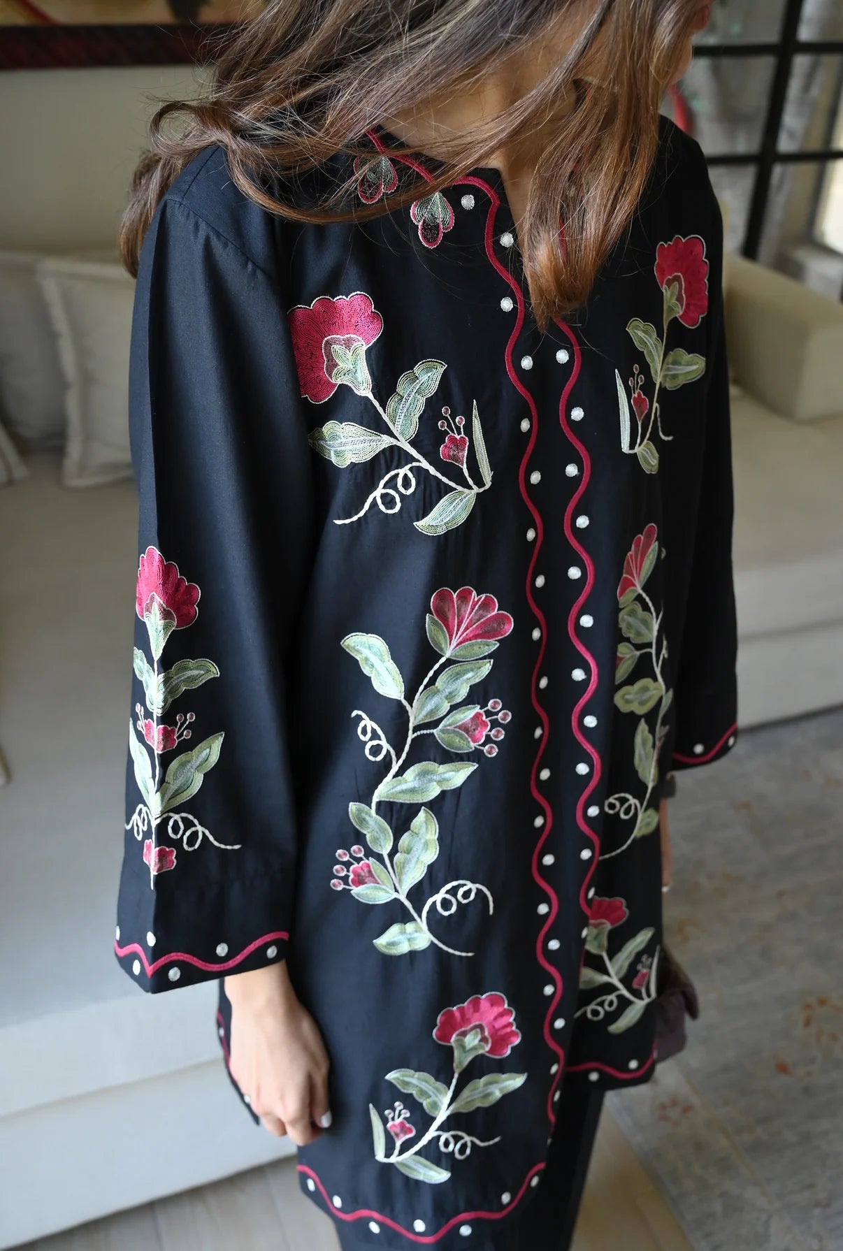 This 2-piece set comes in a crisp white color, made from Soft Linen that feels light and airy, perfect for a relaxed day out. The shirt features a simple round neckline with a clean slit, while the front and sleeves are detailed with beautiful floral embroidery. Paired with matching minimally detailed trousers, this ensemble is an easy, go-to choice for a fresh and effortless casual look.