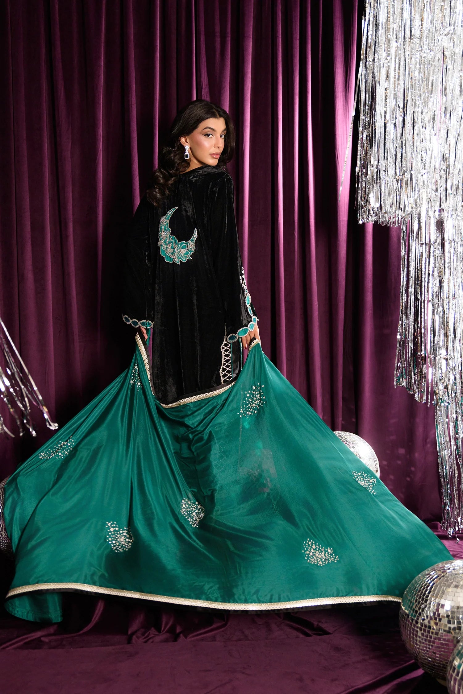 From our Velvet Luxe MARA collection, Black Pearl is an elegant three-piece set in black tones, featuring a long-cut pure velvet shirt paired with pure sheesha silk straight-cut pants. The shirt is intricately embellished with dabka and blue resham floral embroidery, with crisscross Swarovski stone detailing on the hem, making it a standout piece for the breezy season. The set is completed with a pure medium silk dupatta in a contrasting teal green shade, adorned with delicate sequin work for a refined finish.