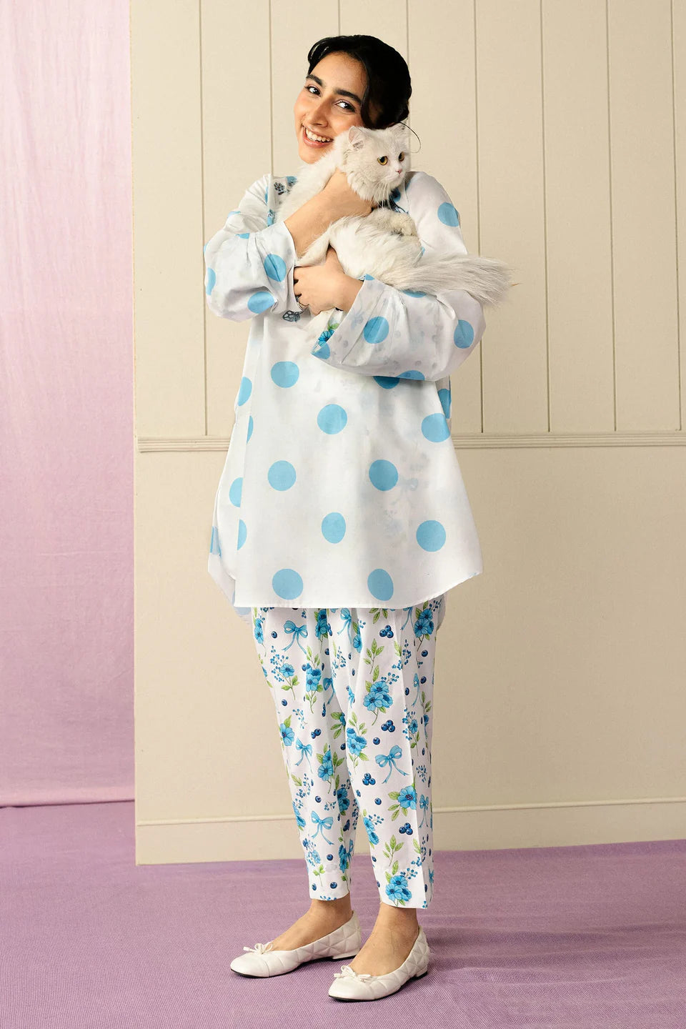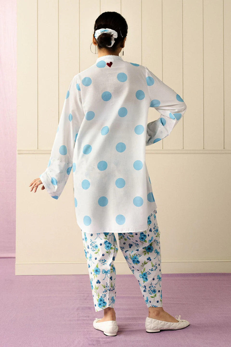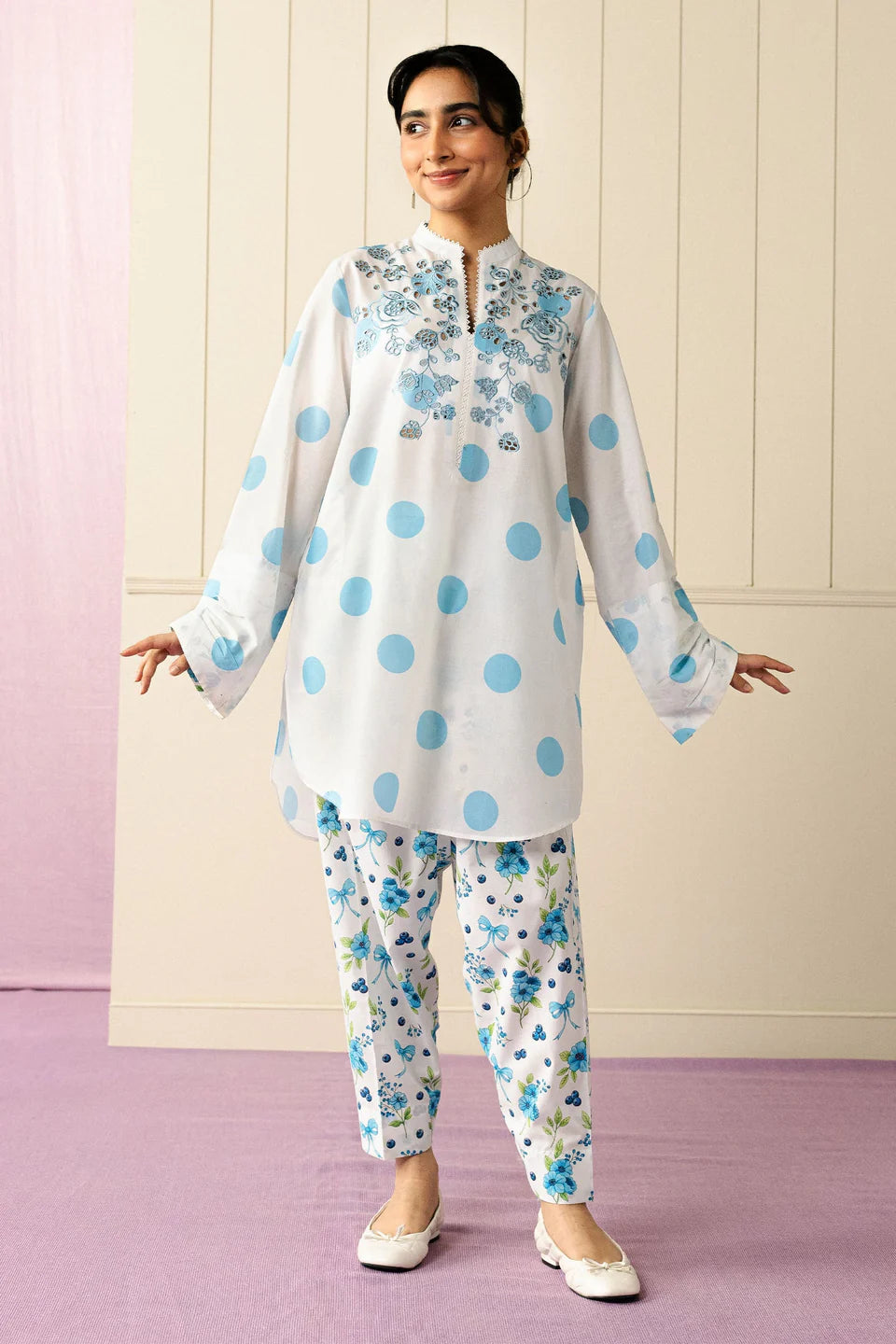 A loose-fit cambric kurta detailed with delicate schiffli embroidery along the neckline and subtle stitching on the sleeves, paired with a contrast printed shalwar. Designed for comfort with a refined finish, this easy silhouette moves seamlessly from relaxed day moments to softly styled evenings.
