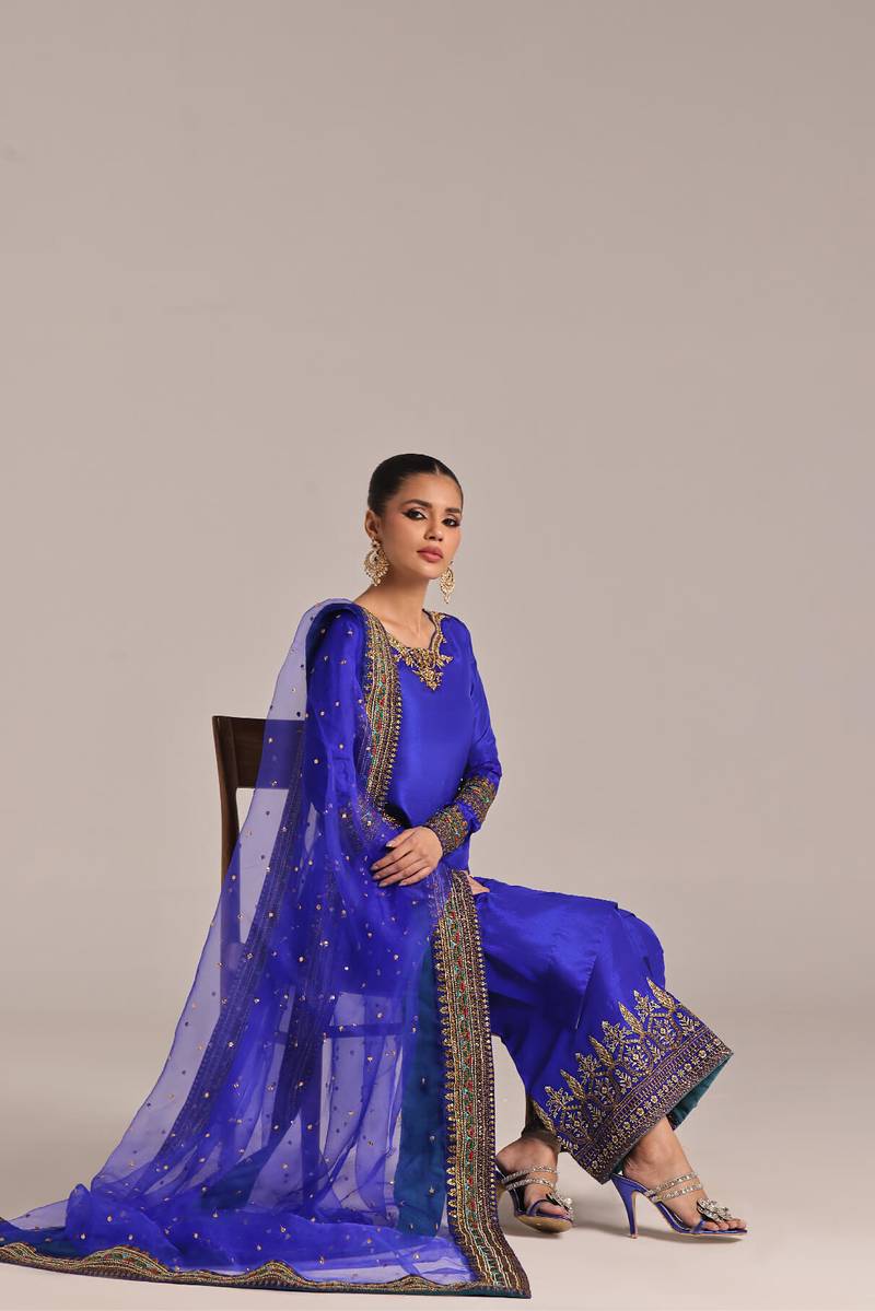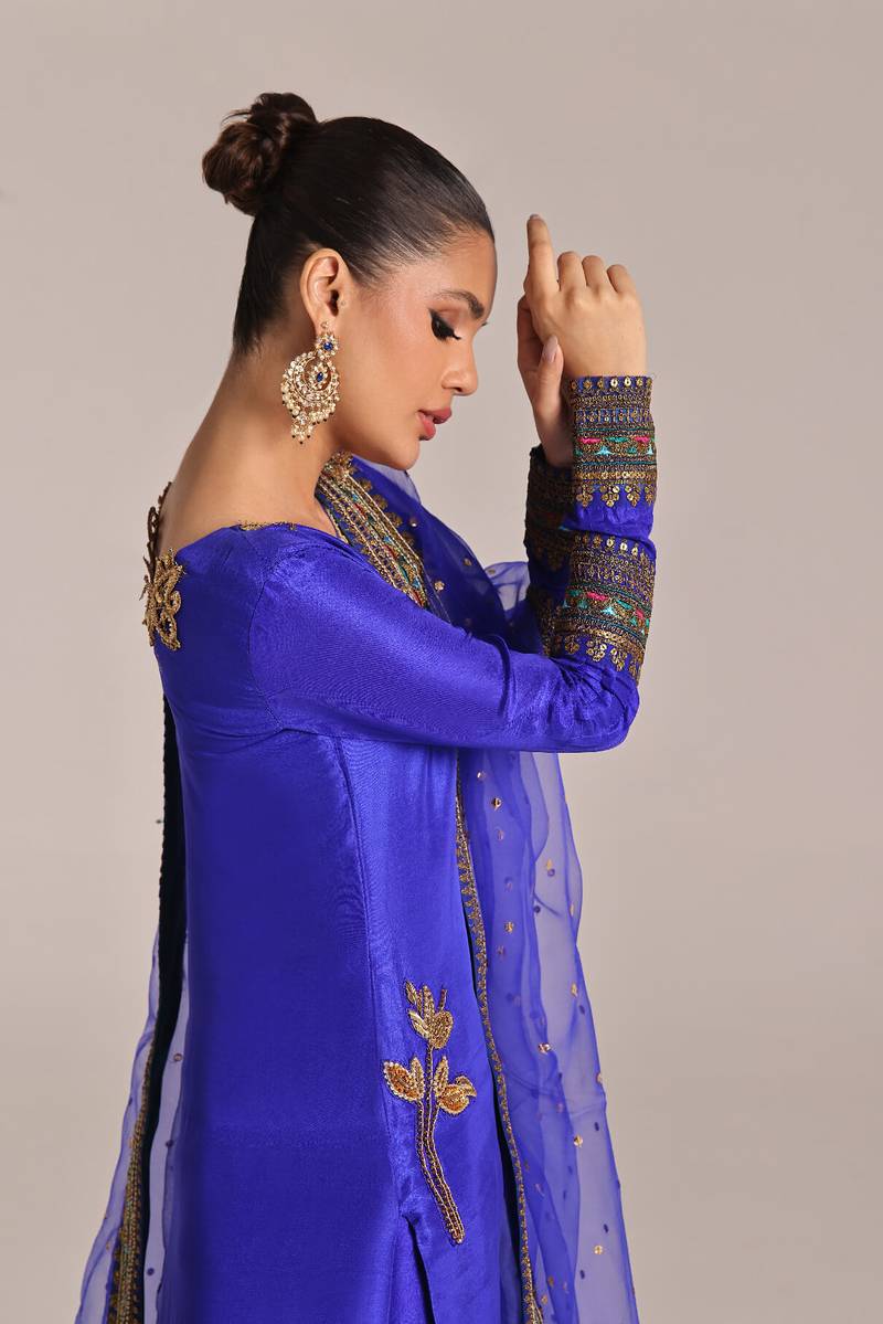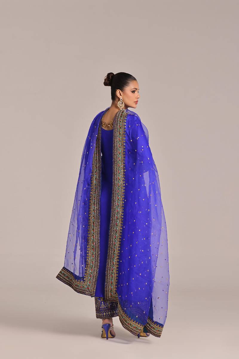 This radiant Blue Pure silk article with chic cut adda work on neck line and on front with silk organza dupatta four side borders and sequence spray all over paired with loose izaar with embroidery border.