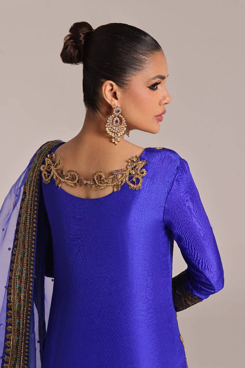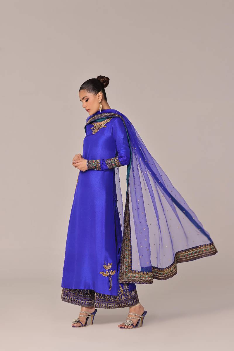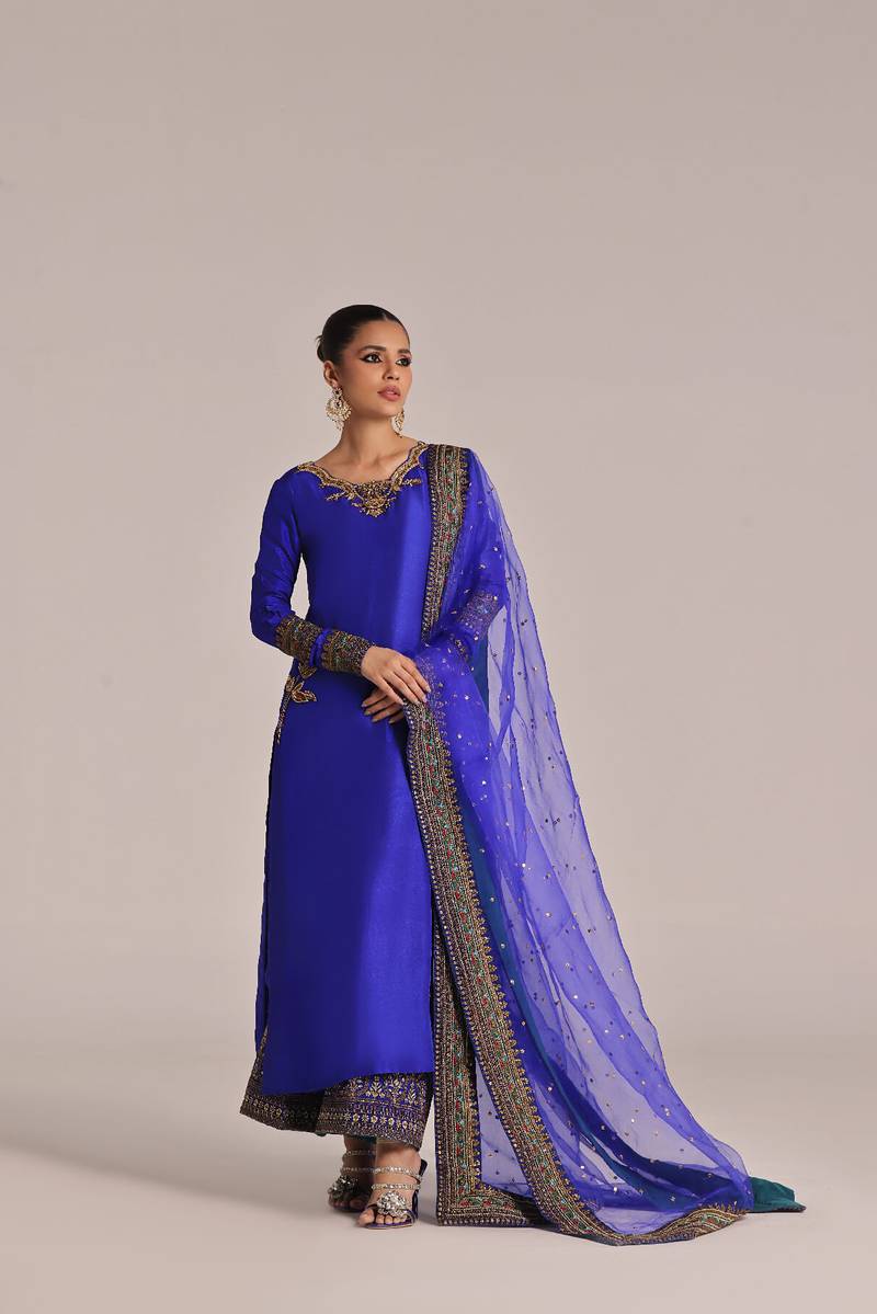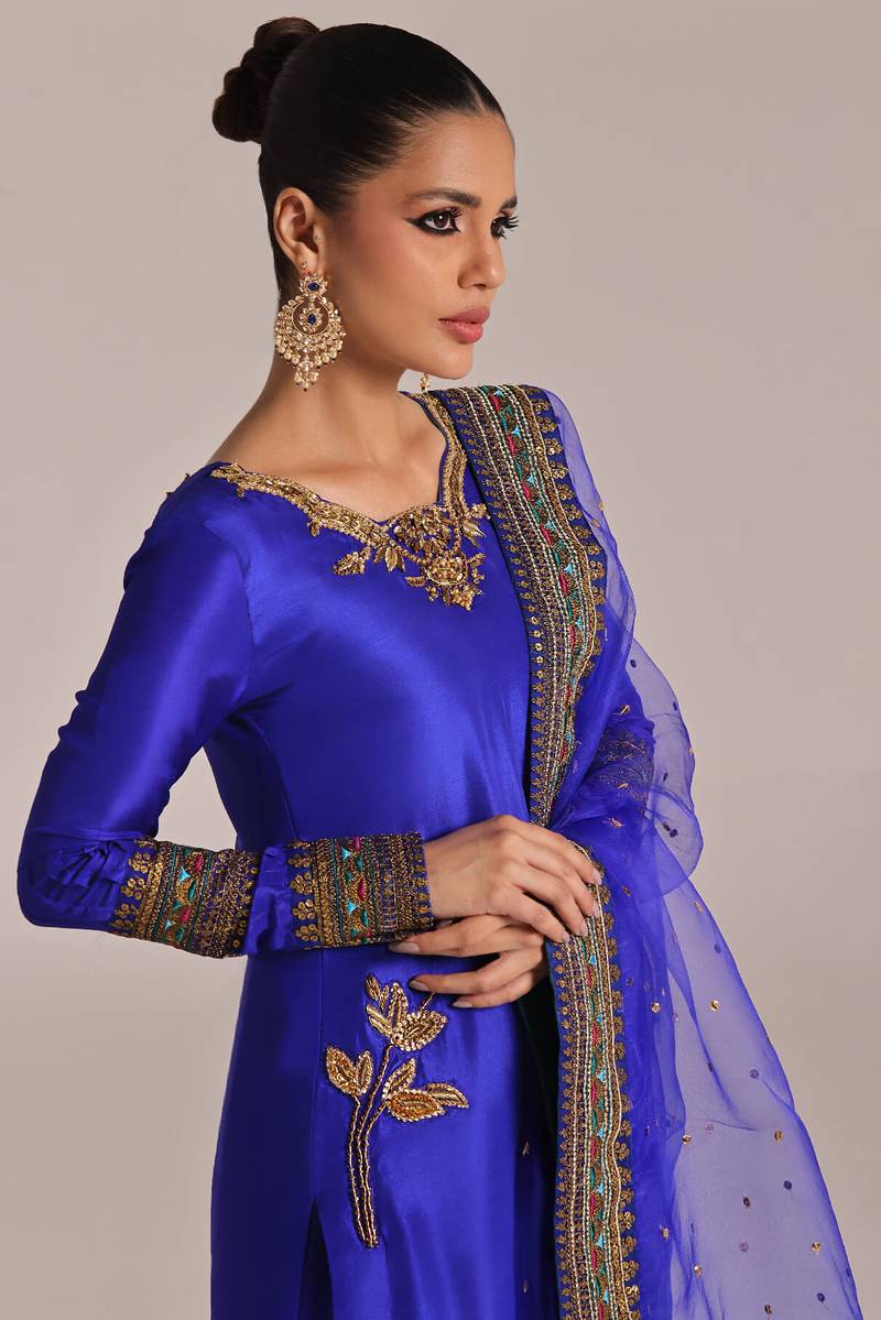 This radiant Blue Pure silk article with chic cut adda work on neck line and on front with silk organza dupatta four side borders and sequence spray all over paired with loose izaar with embroidery border.