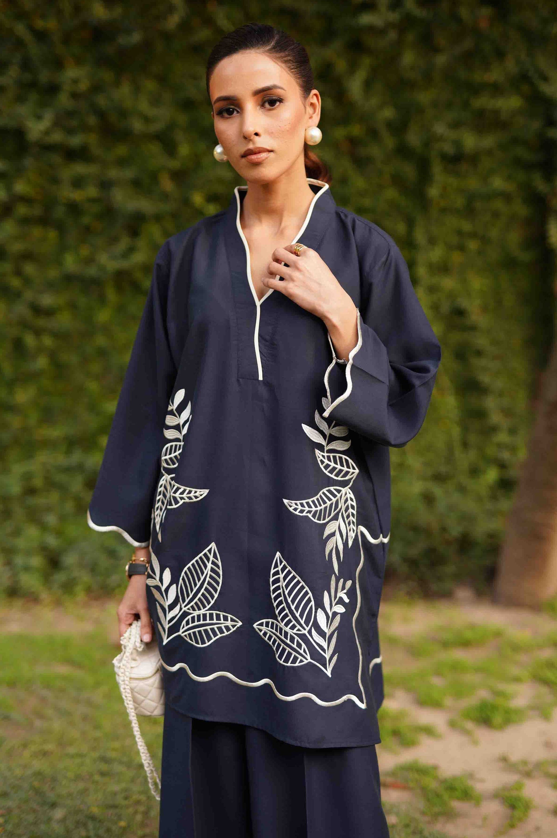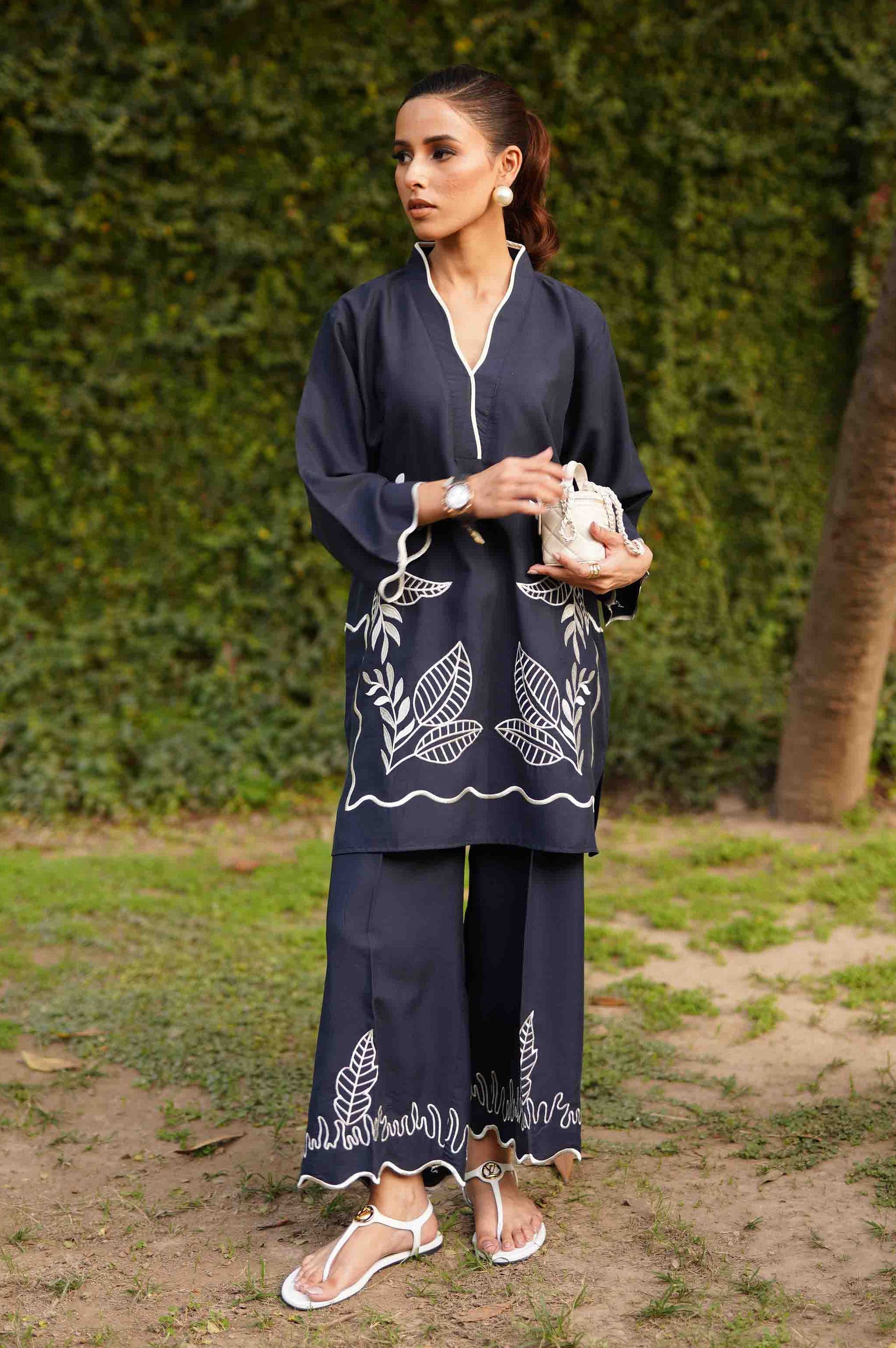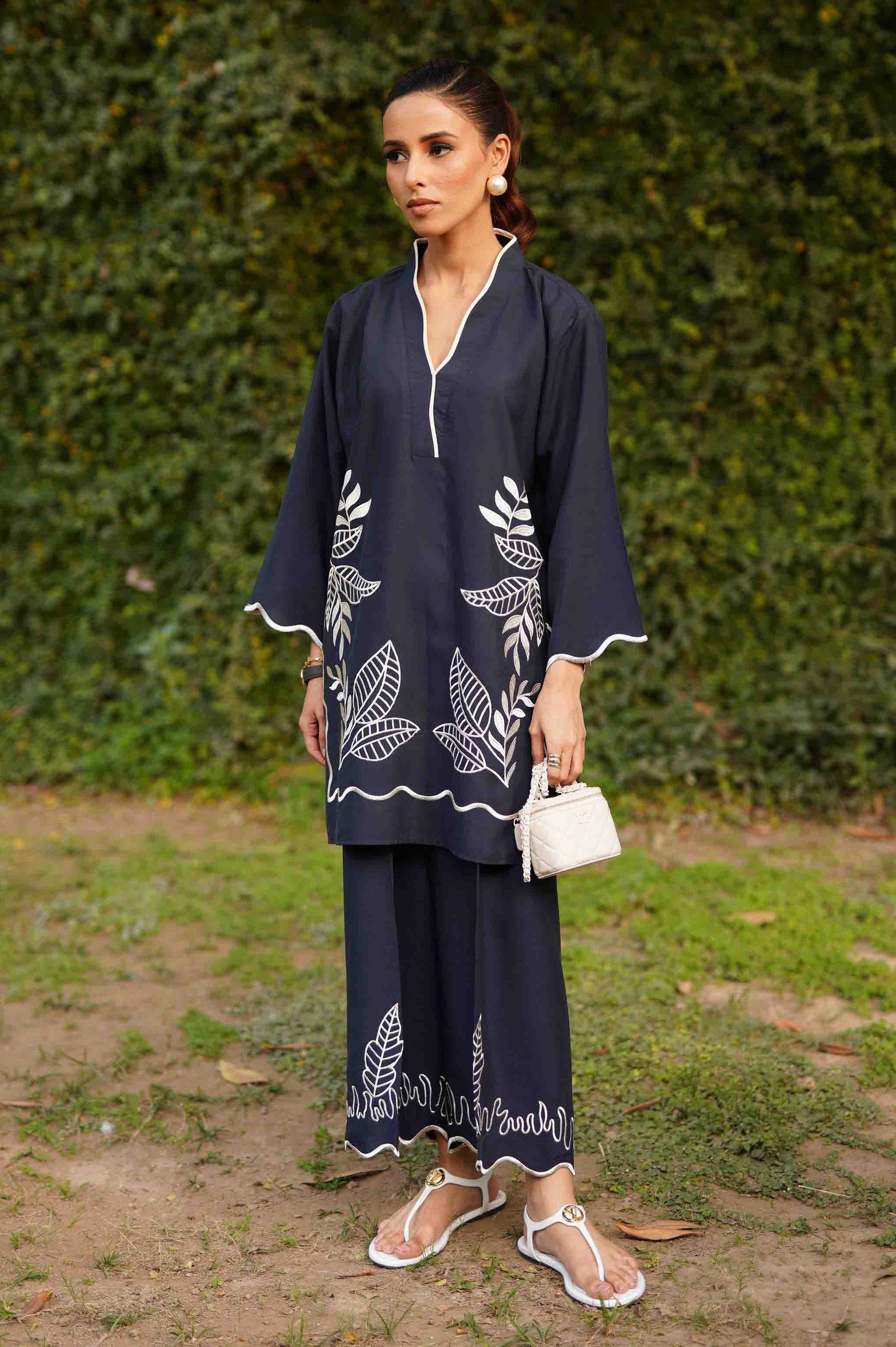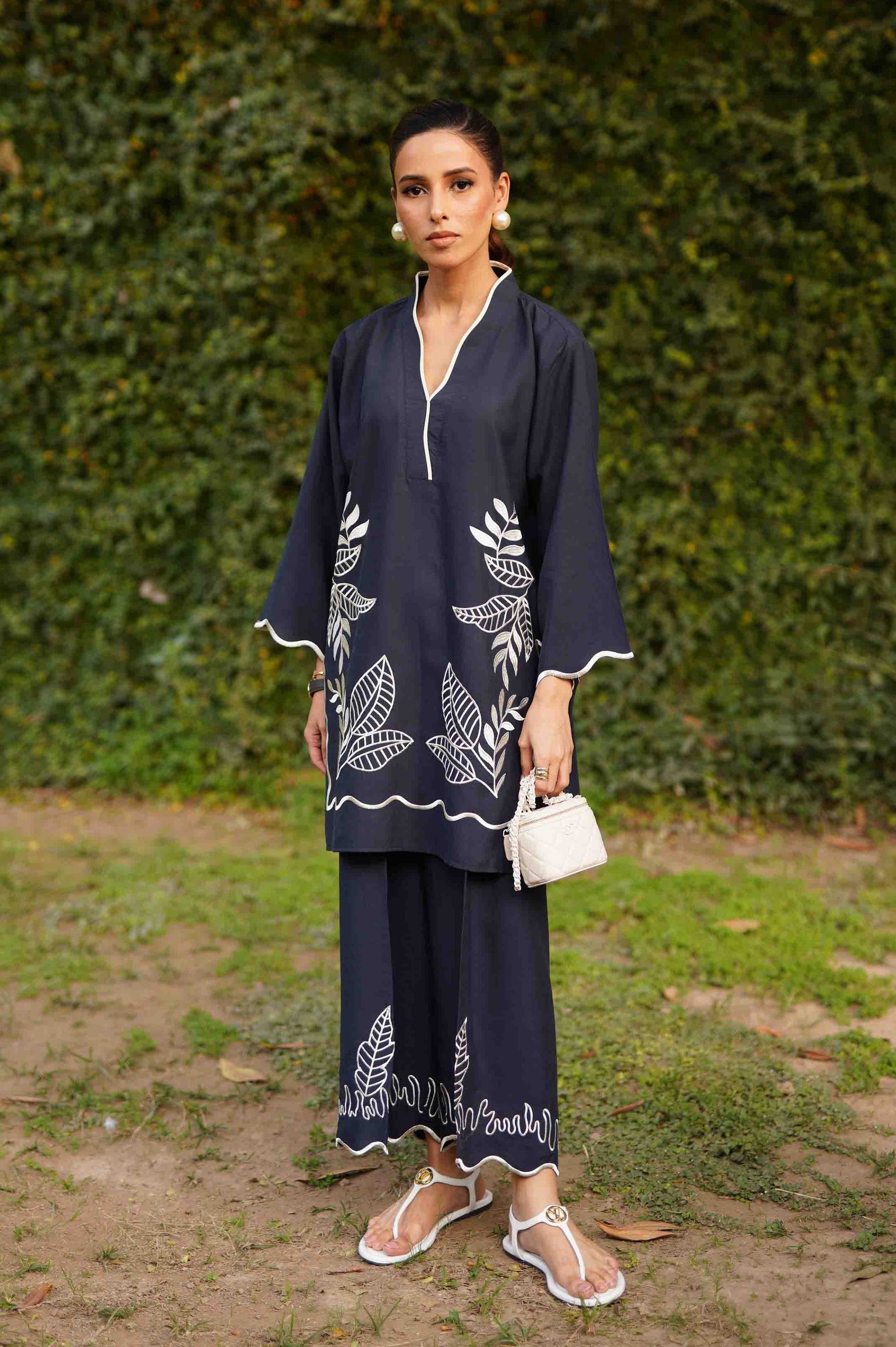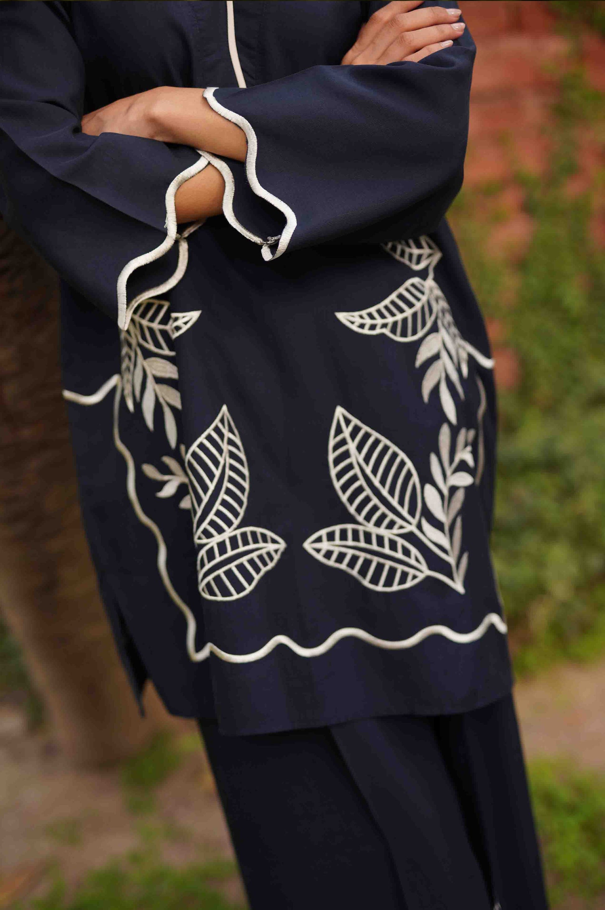 A Navy Blue two-piece ensemble featuring a straight kurta adorned with white embroidered leaf motifs and scalloped edging along the hem and sleeves. The kurta showcases a V-slit neckline accented with white piping for a refined contrast. It is paired with wide-leg trousers embellished with matching embroidery and scalloped borders, creating a sophisticated and contemporary look.