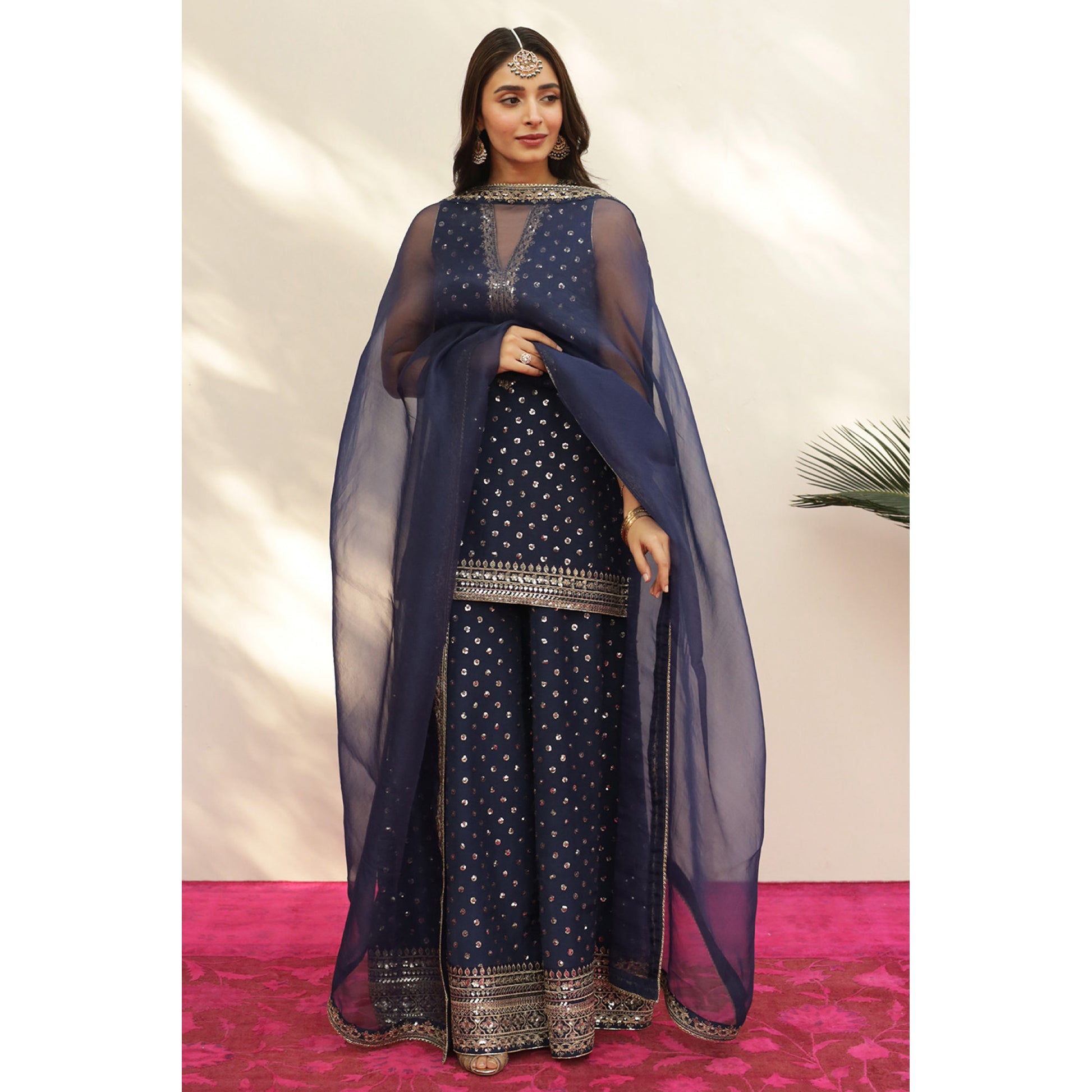 Material:Fused Bamber Silk. 2-Pc (Straight Kameez & Sharara)