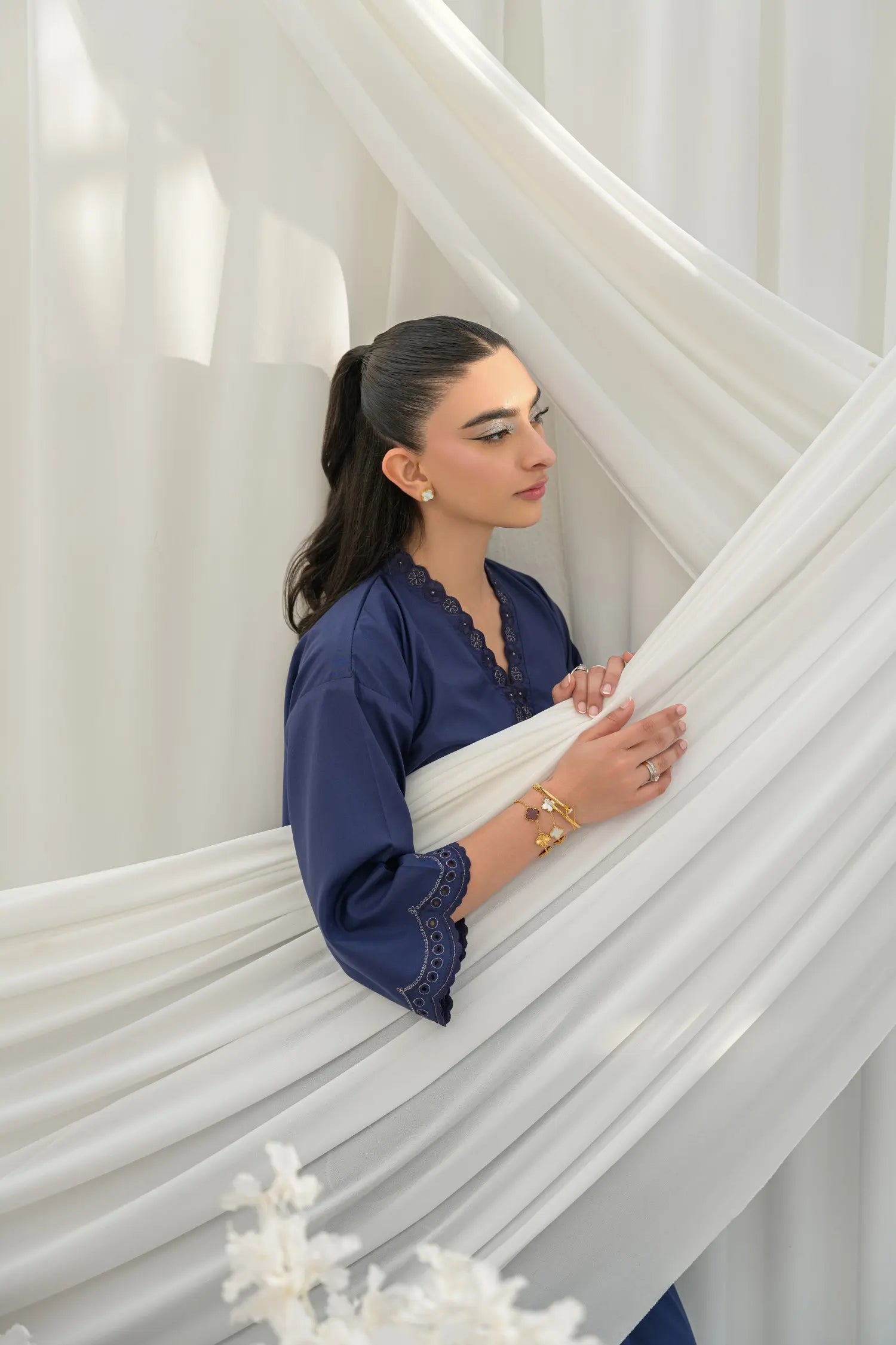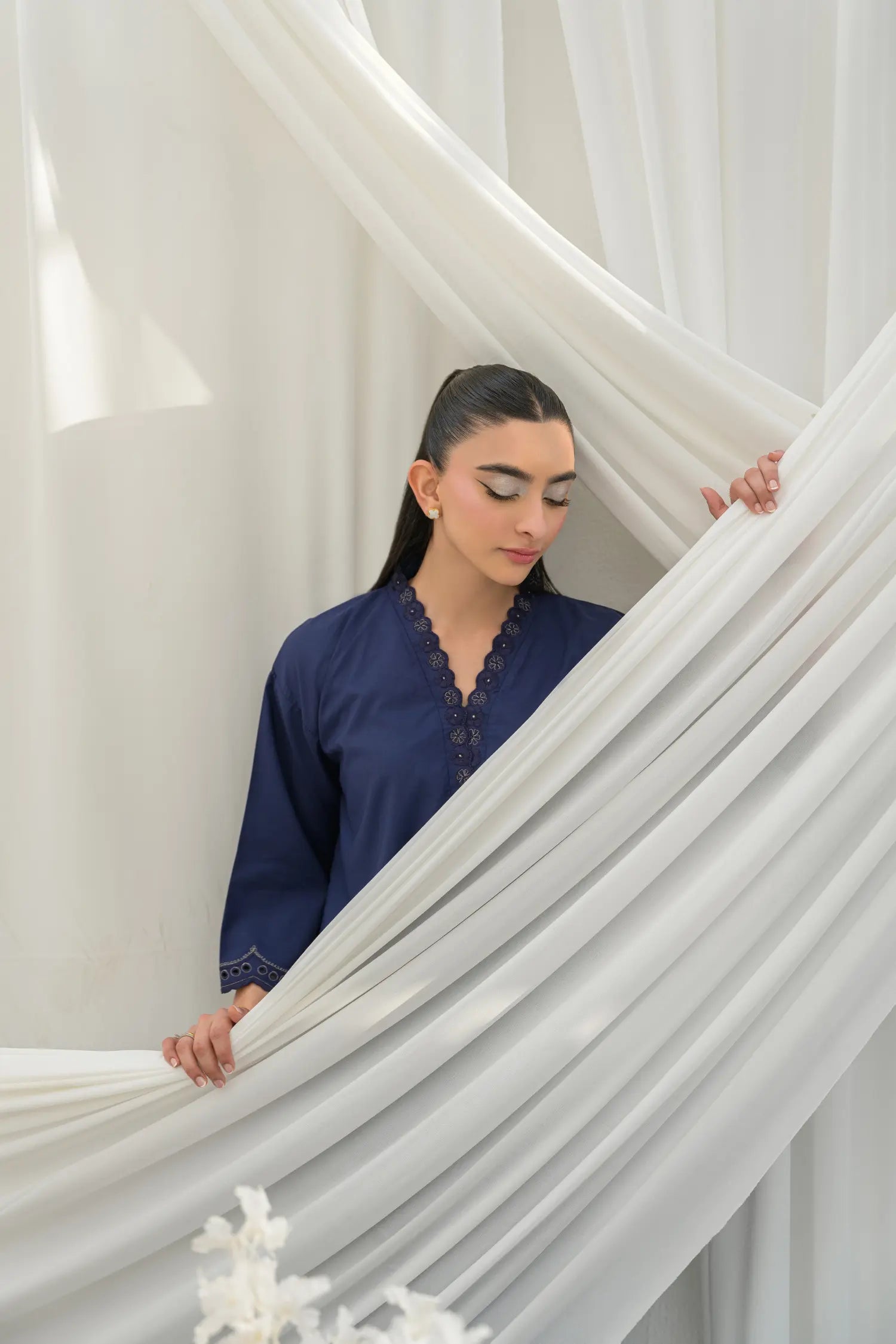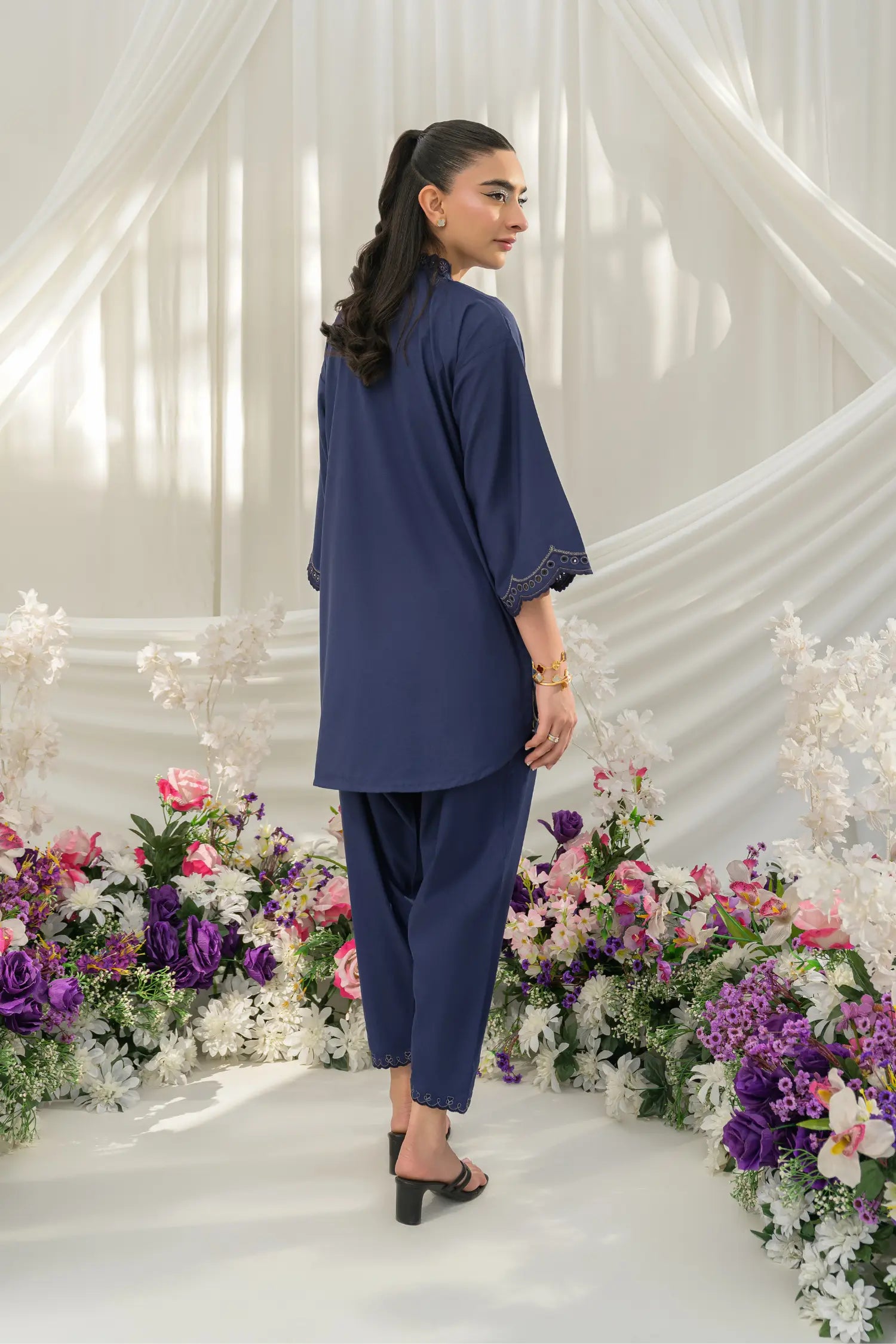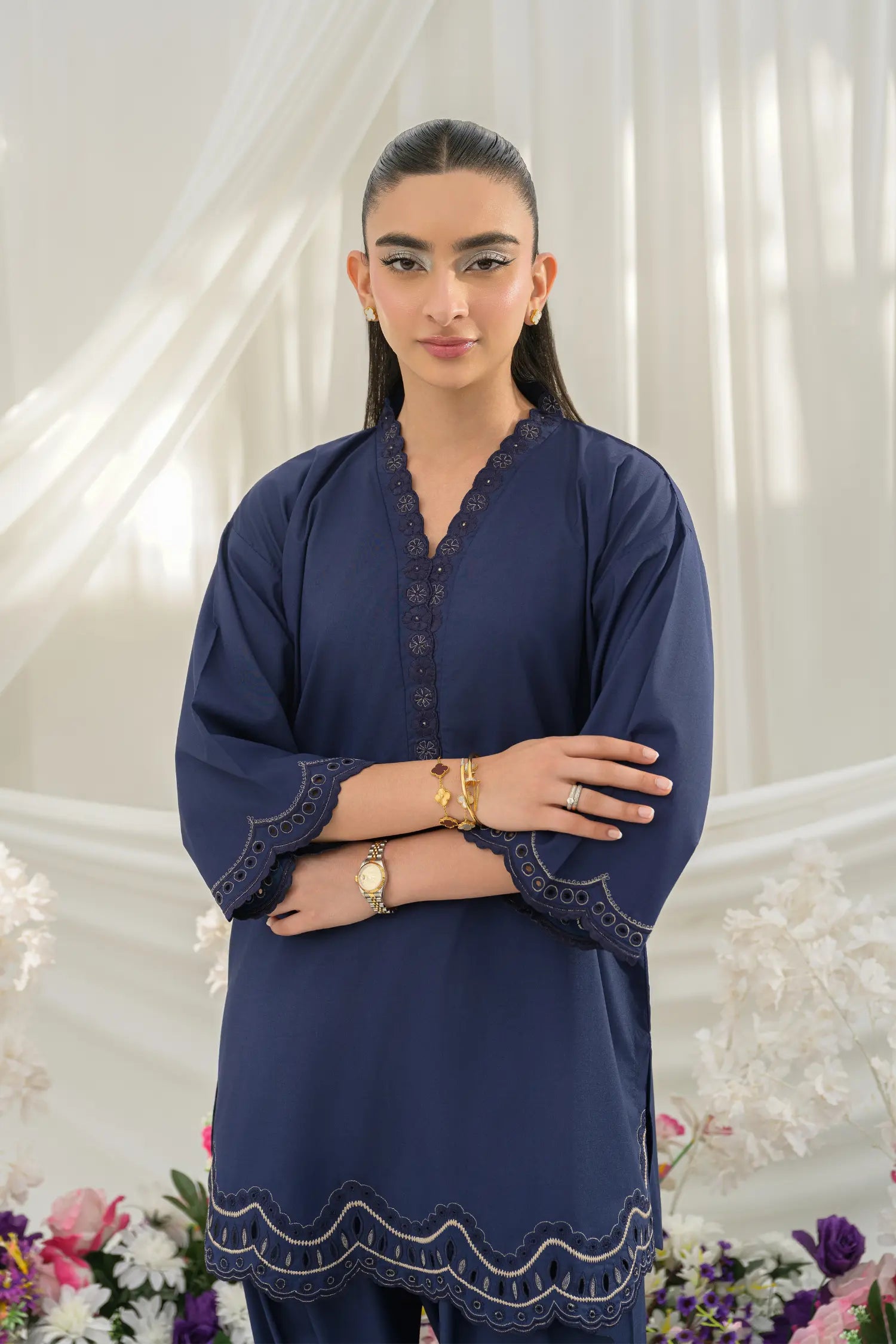 Cobalt coloured embroidered set that comes with short shirt and skinny shalwar. Fabric used is premium blended viscose suitable for all seasons. Dupatta is brought separately and is curated from chiffon.