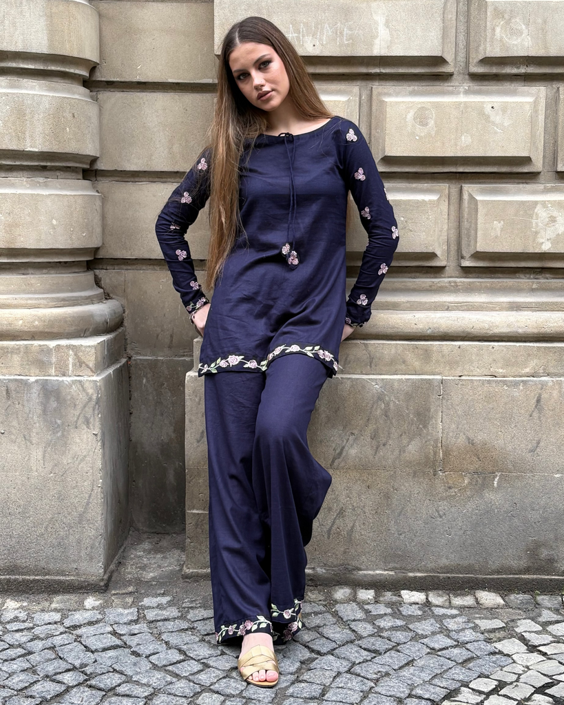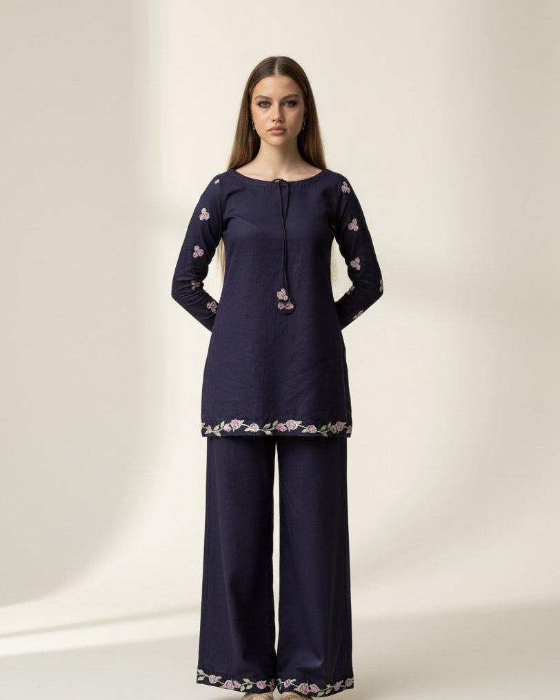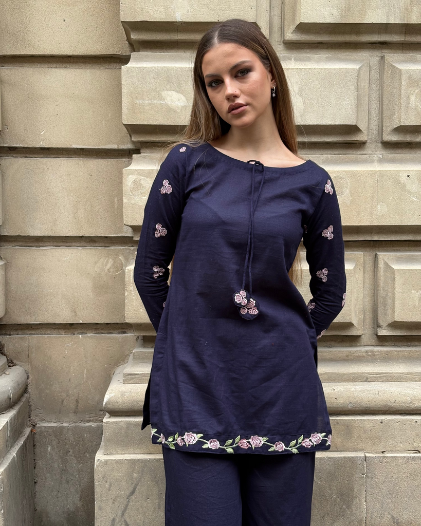A navy blue three-piece set featuring a short kurti and straight pants with pink floral embroidery on the sleeves, hem, and pant cuffs, paired with a matching plain shawl and tassel ties at the neckline for a chic yet elegant look.