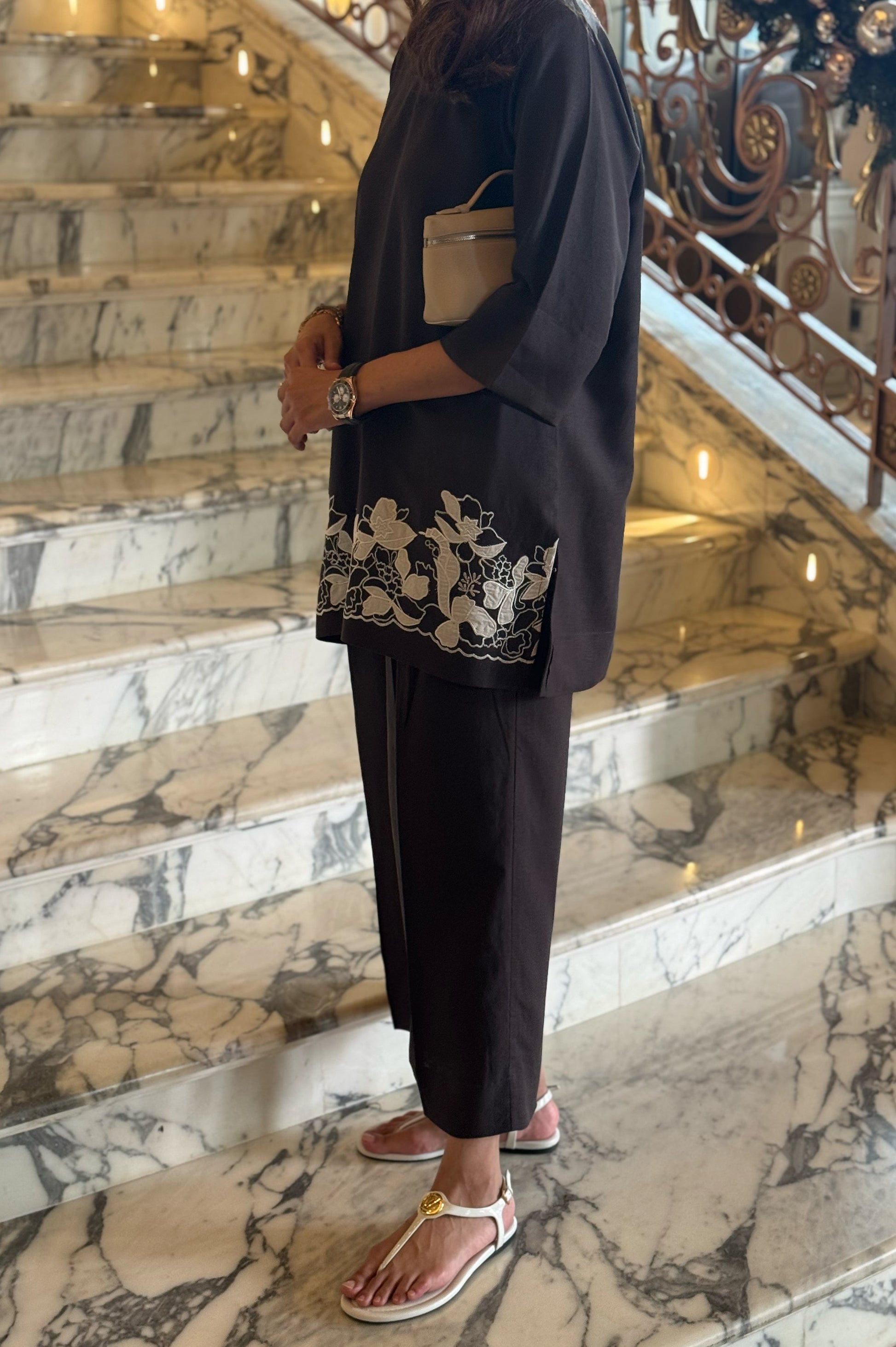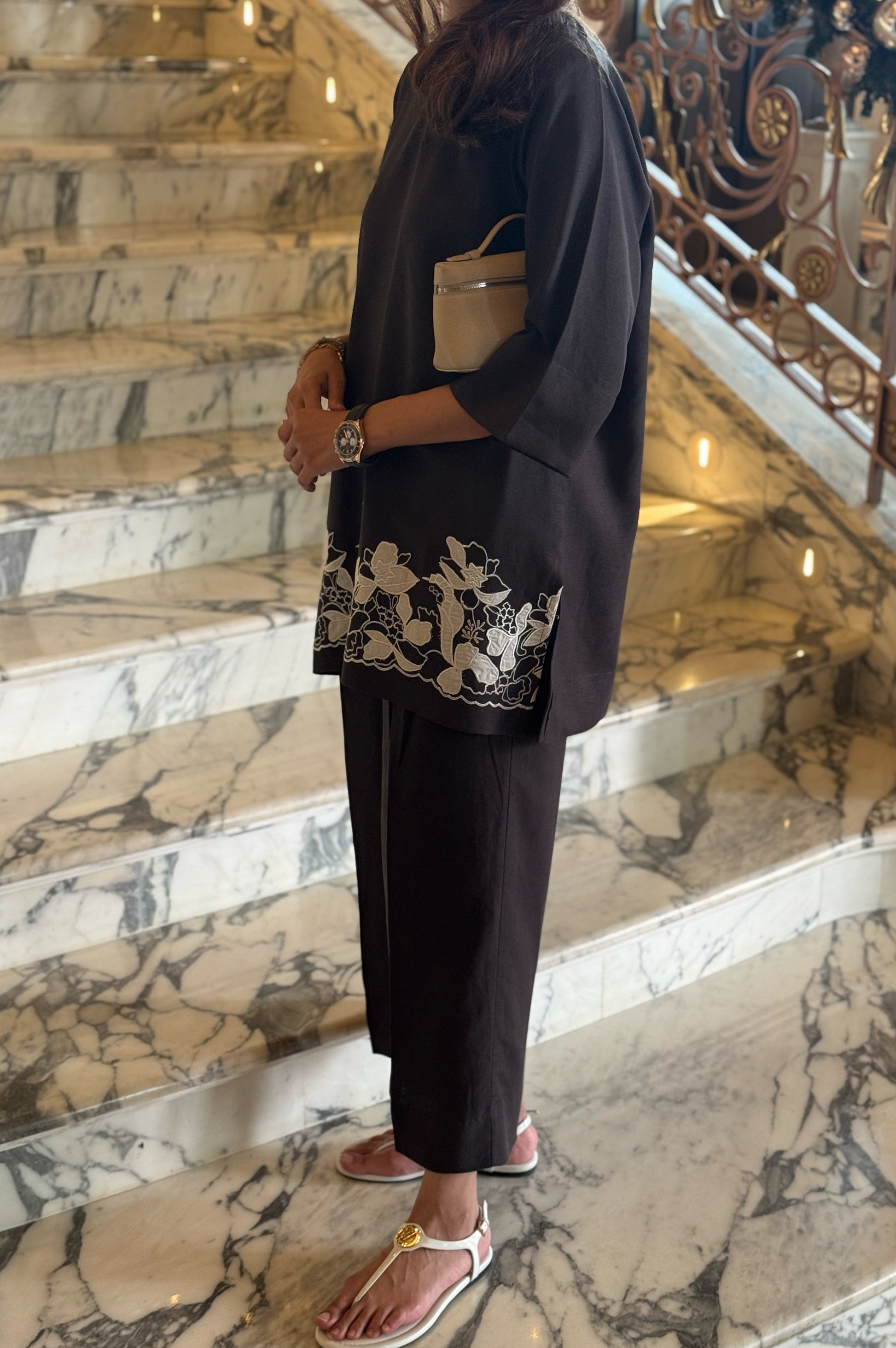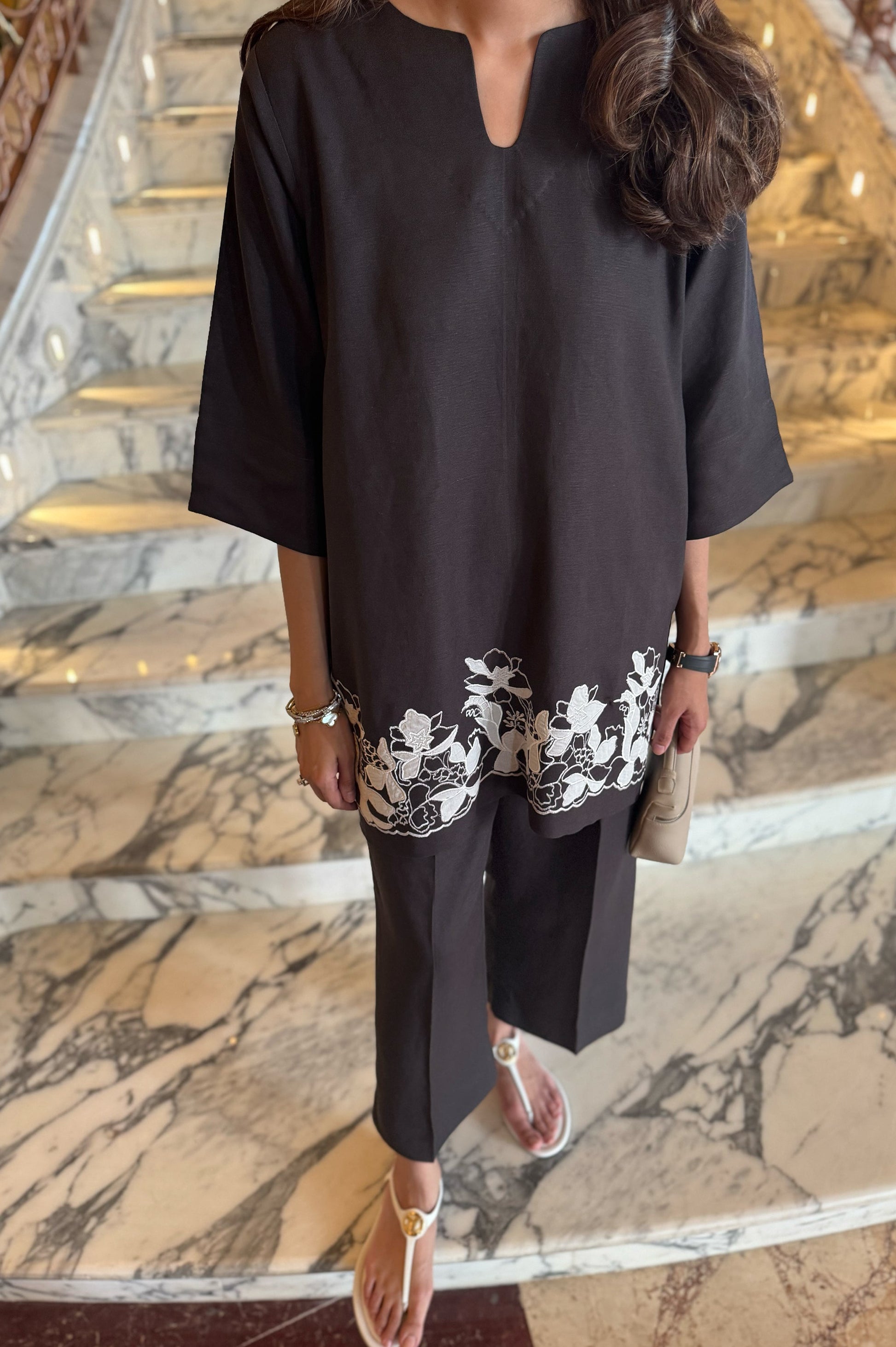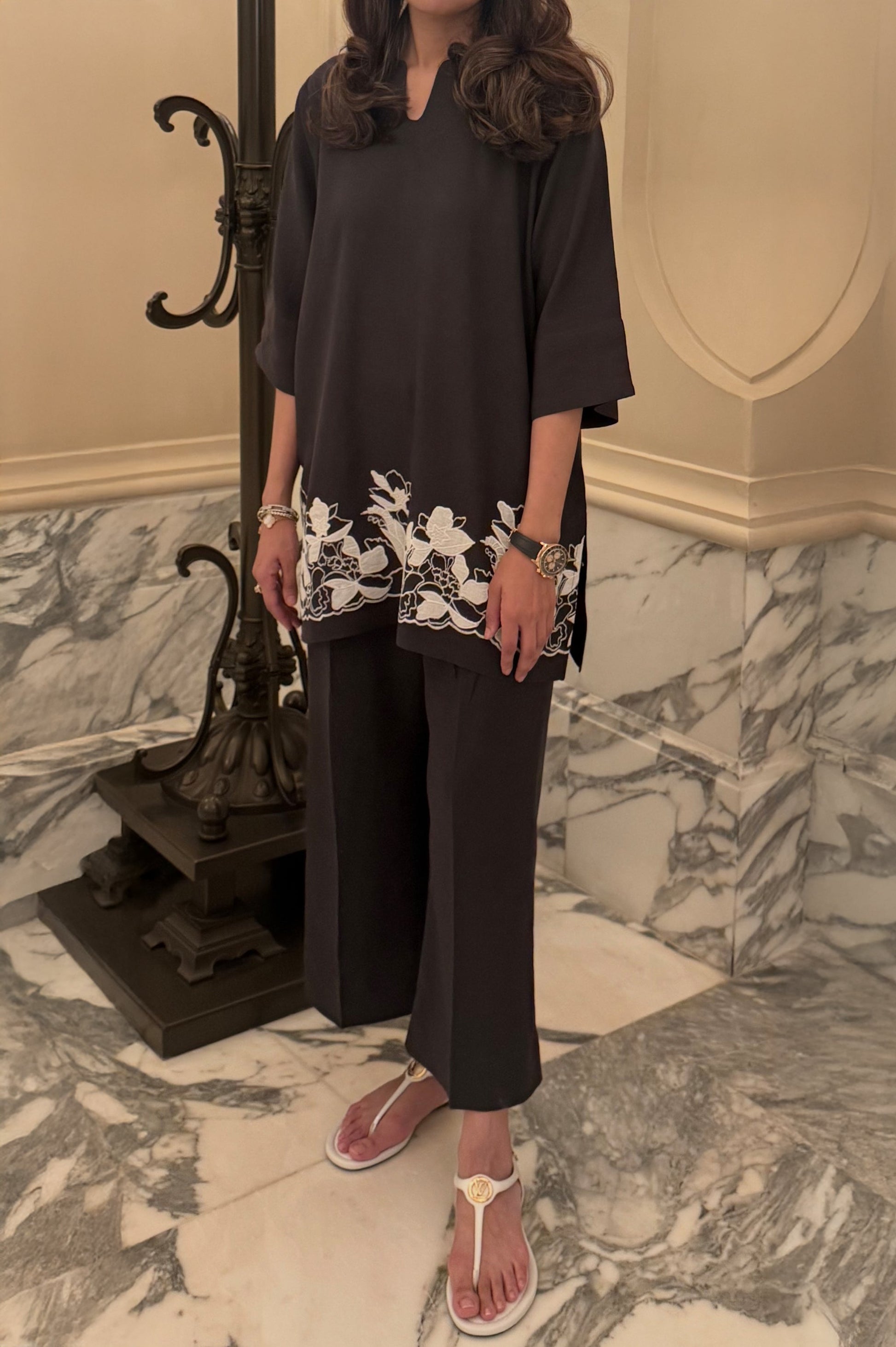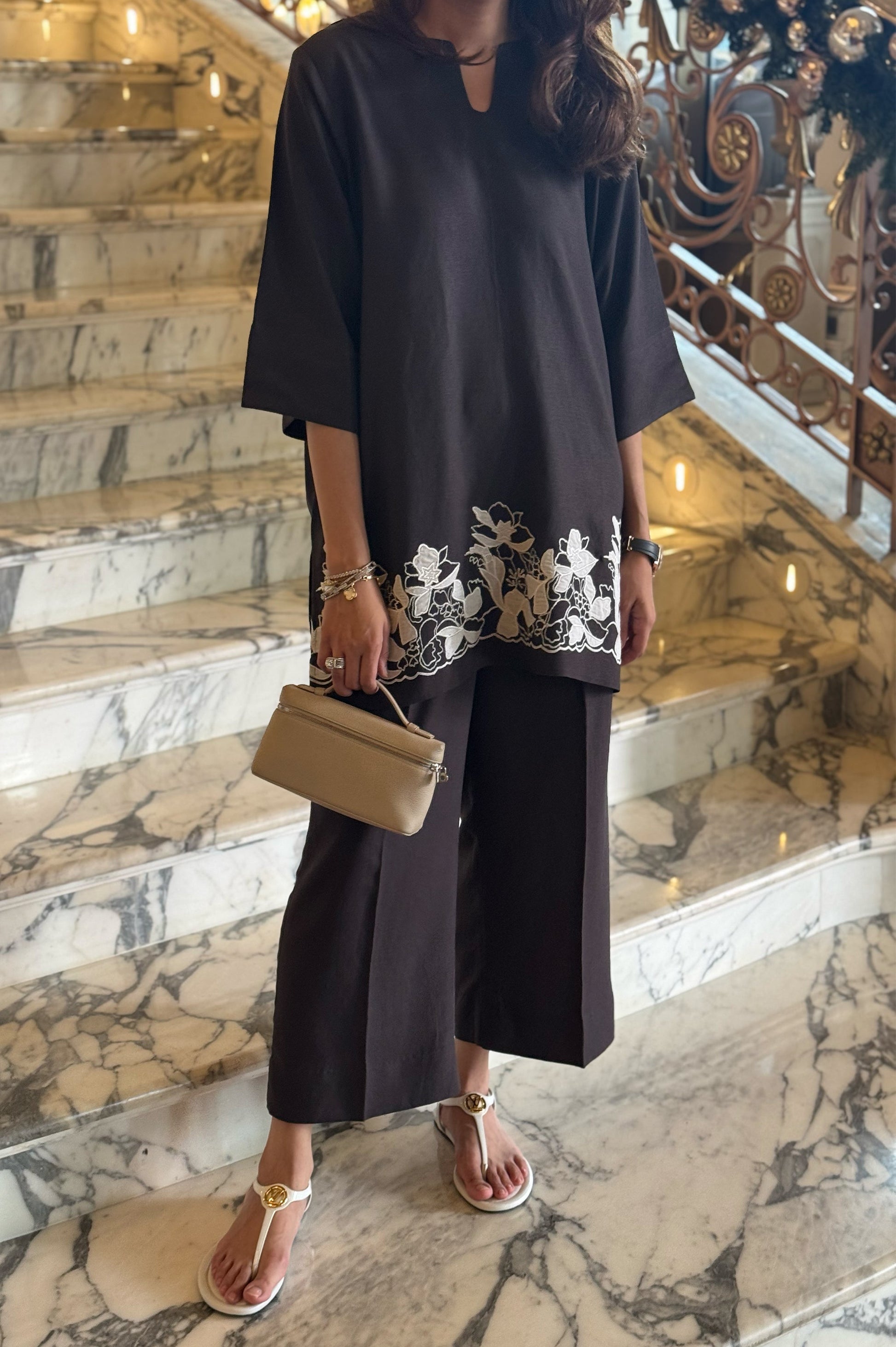 A charcoal black co-ord set, featuring a relaxed straight kurta with a soft V-slit neckline, beautifully highlighted with intricate white floral appliqué along the hem. Paired with wide-leg trousers for an effortlessly silhouette.